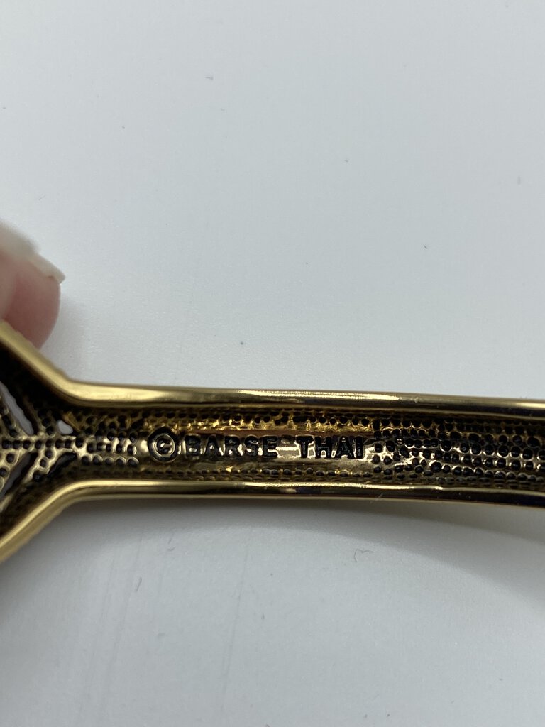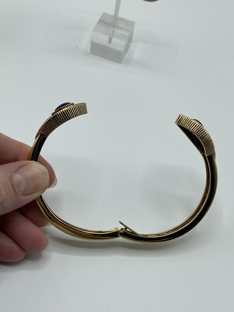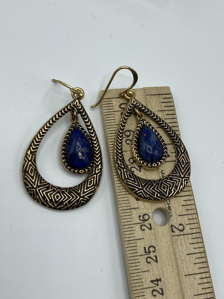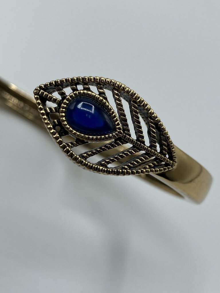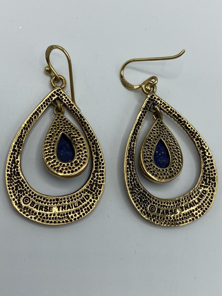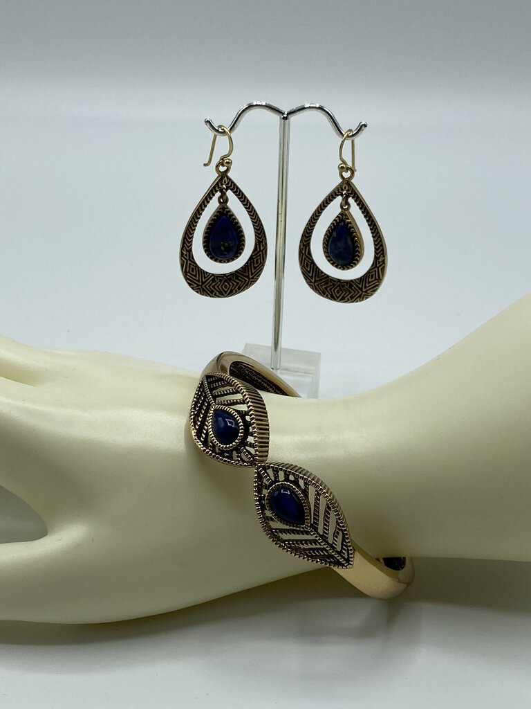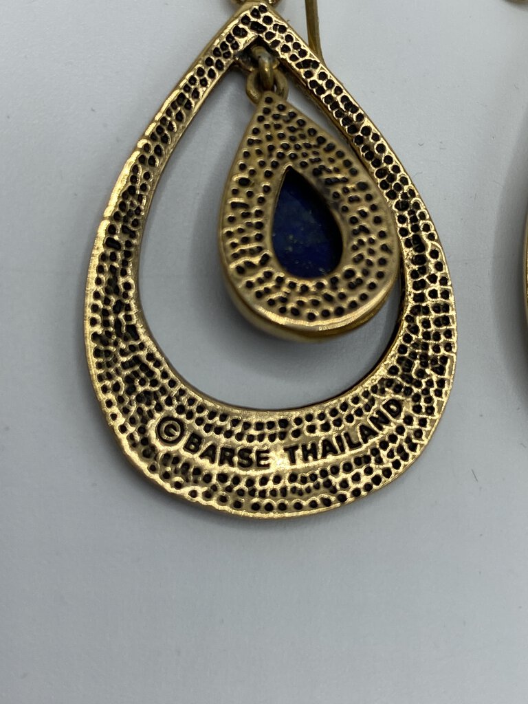BARSE brand earrings made in Thailand hallmarked .925 on earwire. Teardrop style earrings measure 1.5” long and 1” at their widest point. Gold tone with navy blue stone. Bracelet is hallmarked BARSE Thailand and is gold tone with a spring clasp. Blue tone stones rest in a filagree leaves.