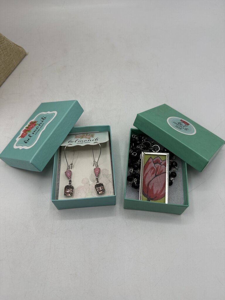 Bel Monili Vintage Reborn new in box, black faceted glass beaded necklace , 18” with a 2” pink fabric framed center pendant. Round faceted stone beads make up the chain with a silver tone metal framed pink tulip pendant. Silver tone pierced dangle earrings have pink tear drop stones with pink crystal dangle rectangle glass beads . Estate item, new in box, never used, ready to wear or for gift giving.