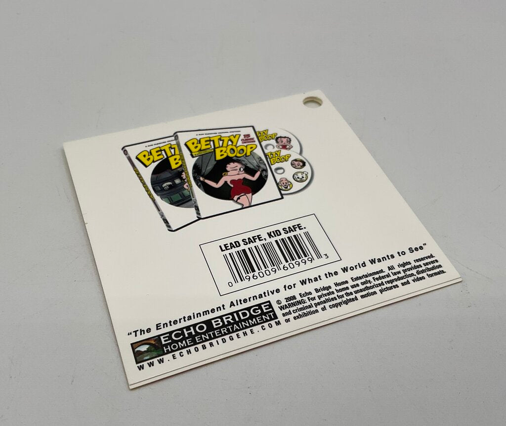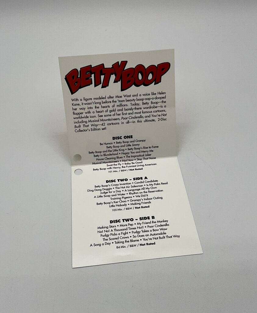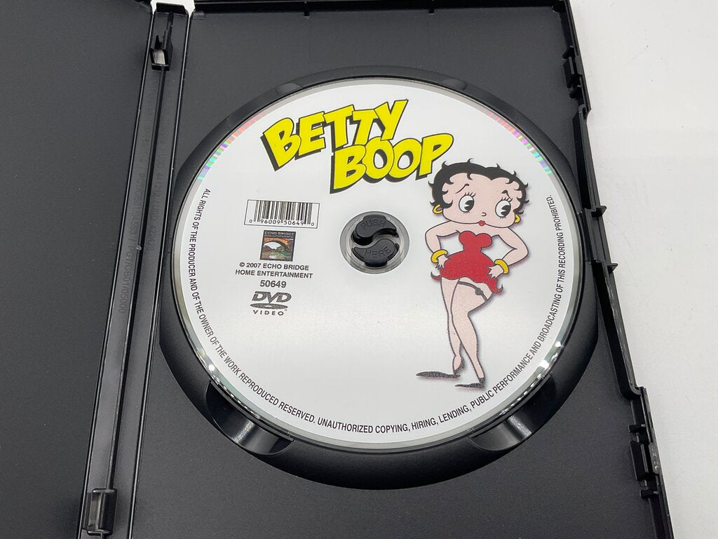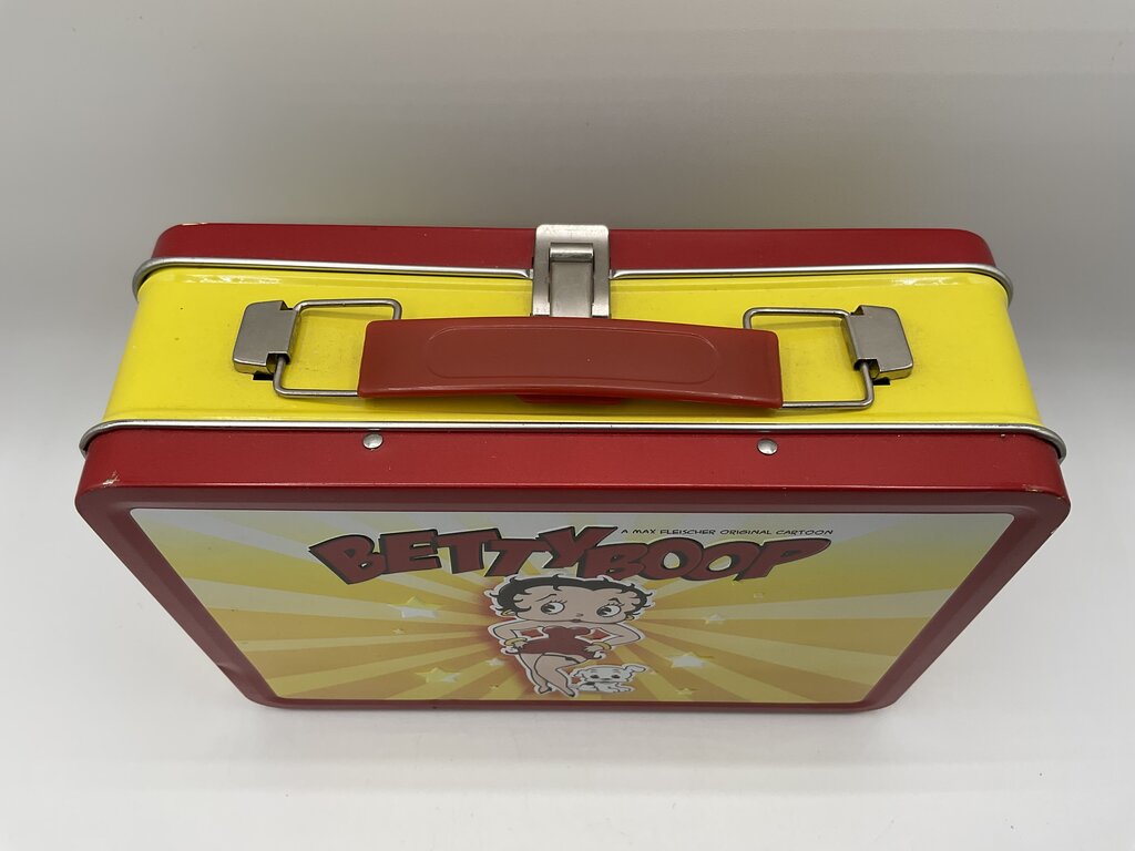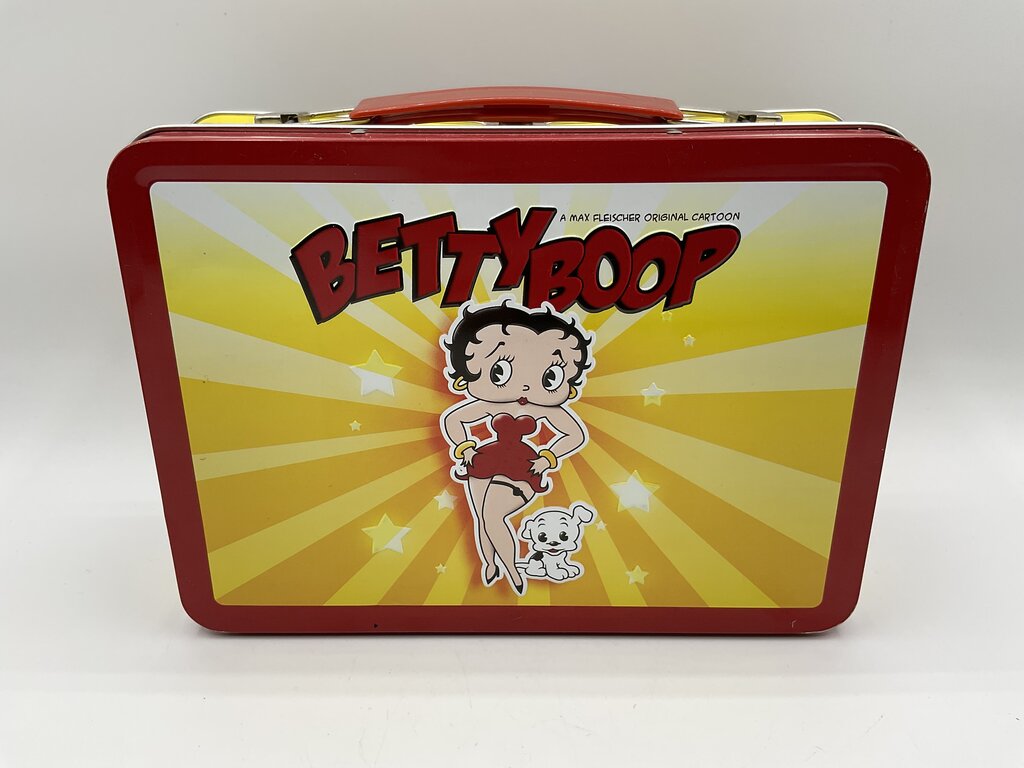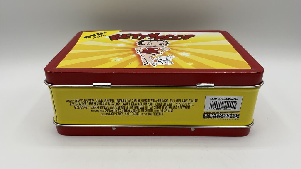 This collectible lunchbox features the classic cartoon character Betty Boop and her furry friend Pudgy on a yellow background, surrounded by stars. Inside are three DVD cases with discs containing dozens of Betty Boop cartoons. This lunchbox and all contents are in excellent condition and display like new. Please refer to all photos for overall condition. Lunchbox measures 8 1/8” by 5 7/8” by 2 7/8” and weighs 1 pounds and 6.1 ounces with all items inside. Estate item. Condition is pre owned. Ships USPS Ground Advantage Mail.