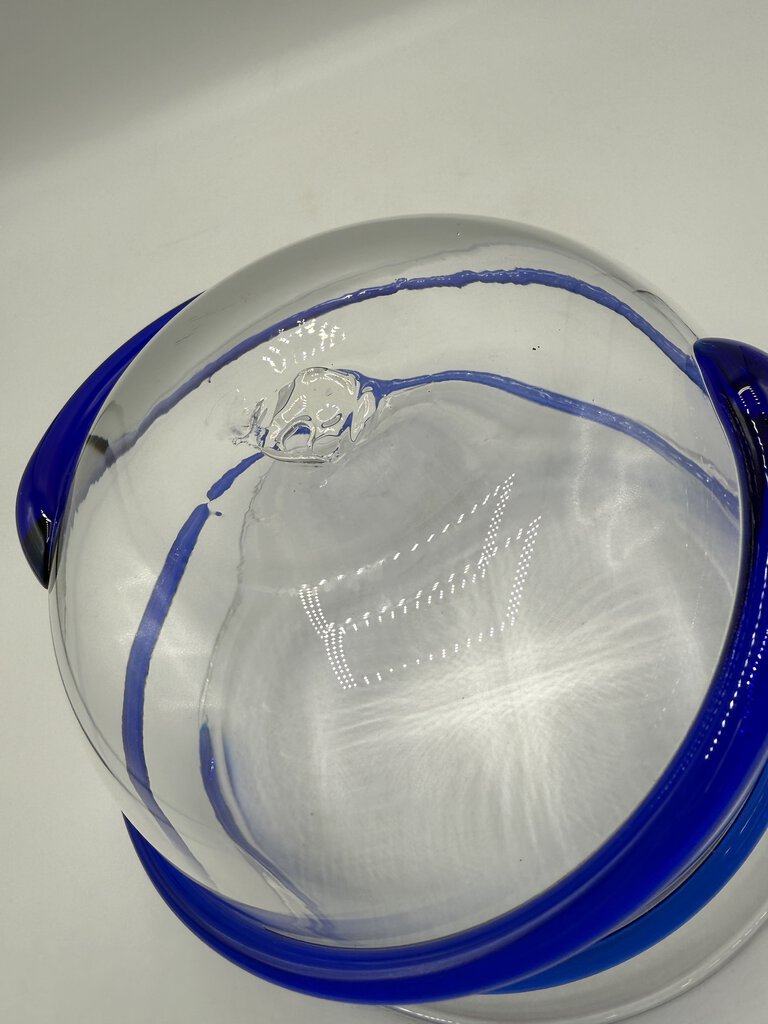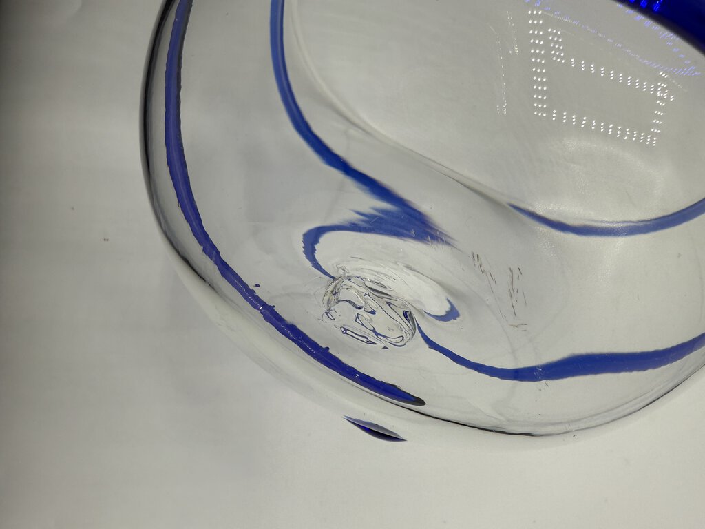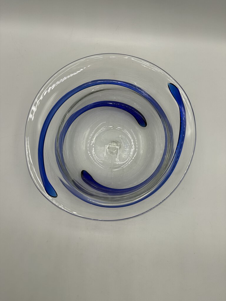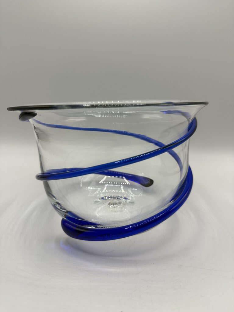Blenko blown clear glass bowl with applied Cobalt Blue Swirl. Bowl measures 5” tall and 7.5” in diameter. Clean and clear, no damage found.