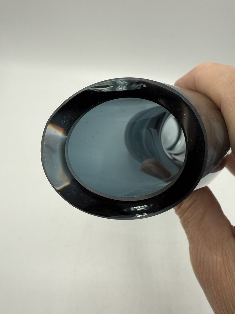 Attractive Murano style blown glass vase, goose neck in Smokey Blue color with a clear glass base. Measures 11.5” tall by 3.75” in diameter. No chips, cracks or scratches in glass.