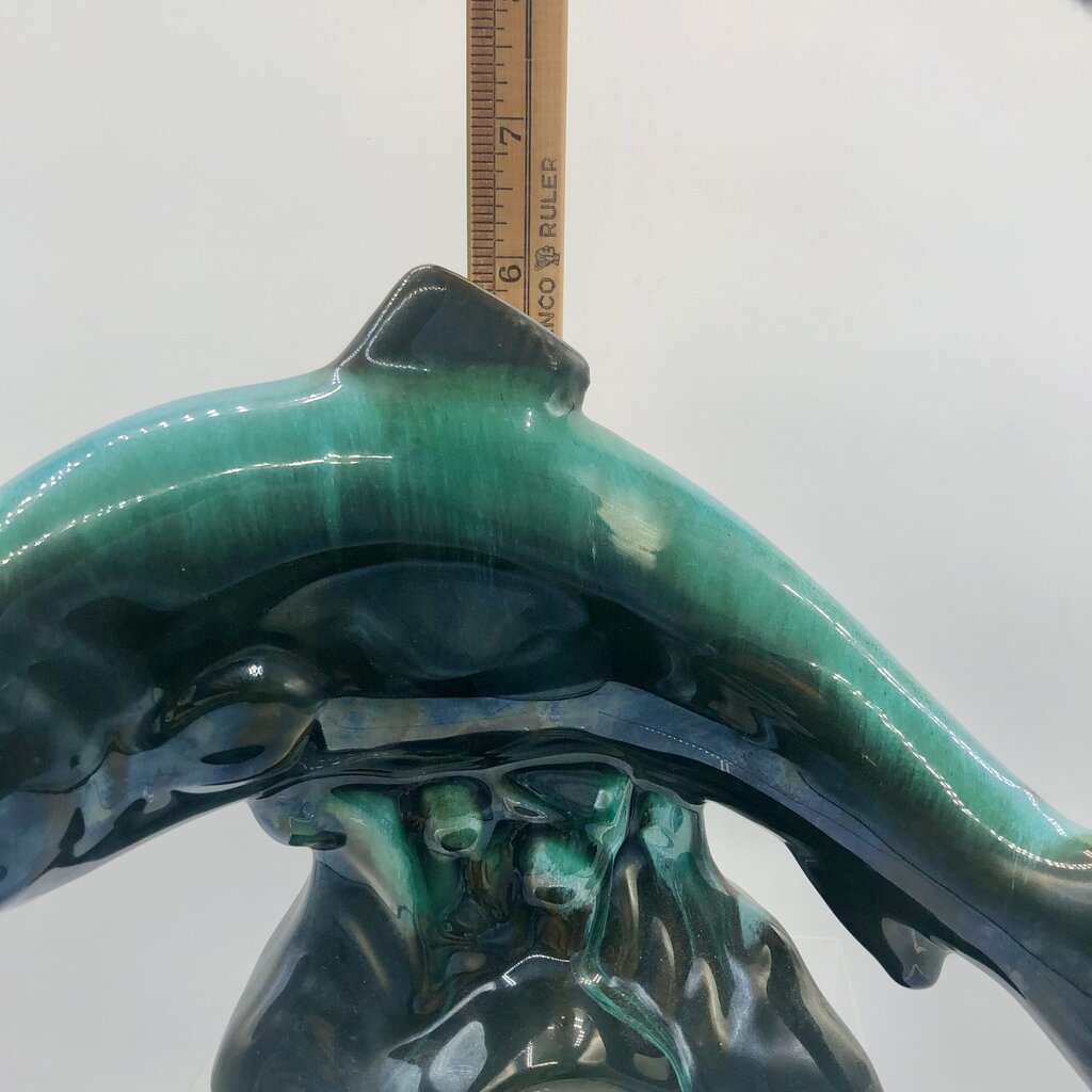 This leaping trout is done in the signature glossy blue-green glaze with black undertones.