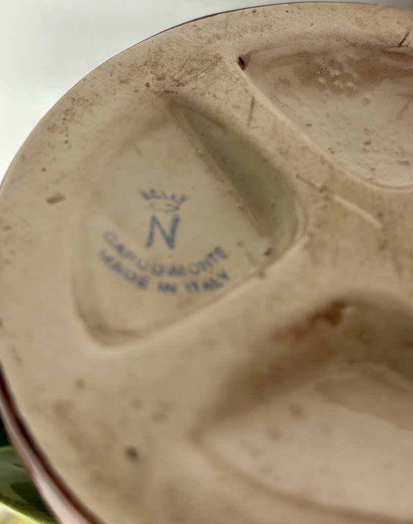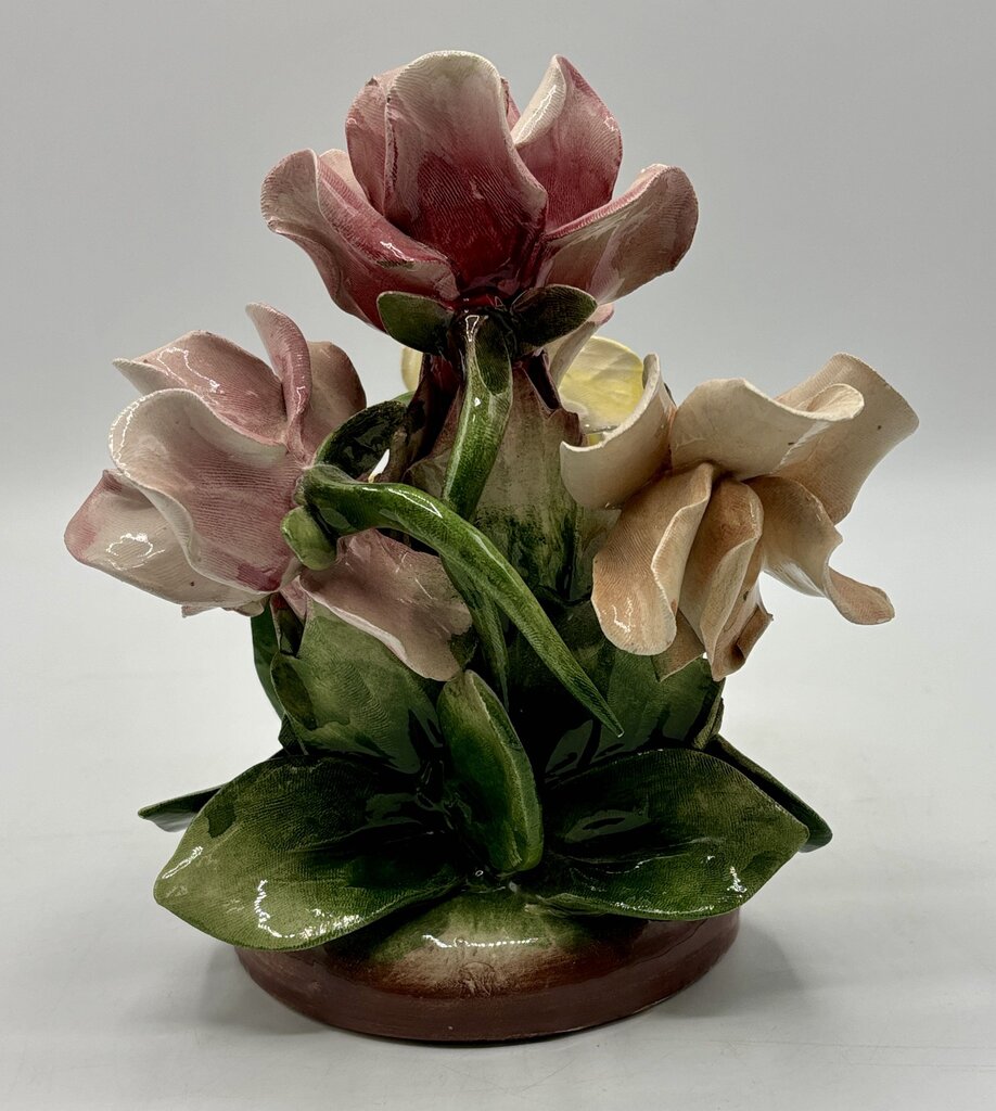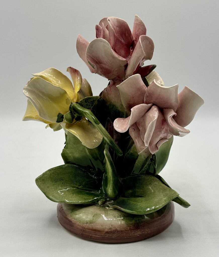 Beautiful vintage Capodimonte made in Italy porcelain floral display of multiple blooms and leaves. This piece with its delicate flowers is in very nice pre-owned condition. I have four n one small chip on one of the stems and a small area of discoloration on one of the yellow flower petals. This piece will add to any table decor.