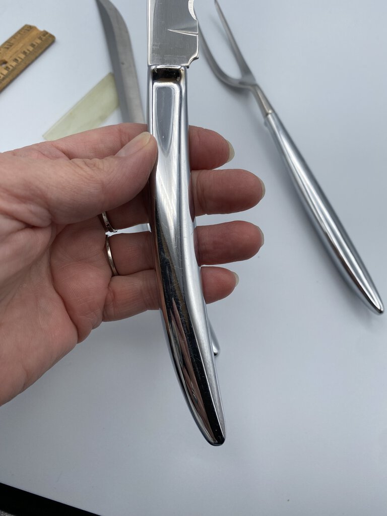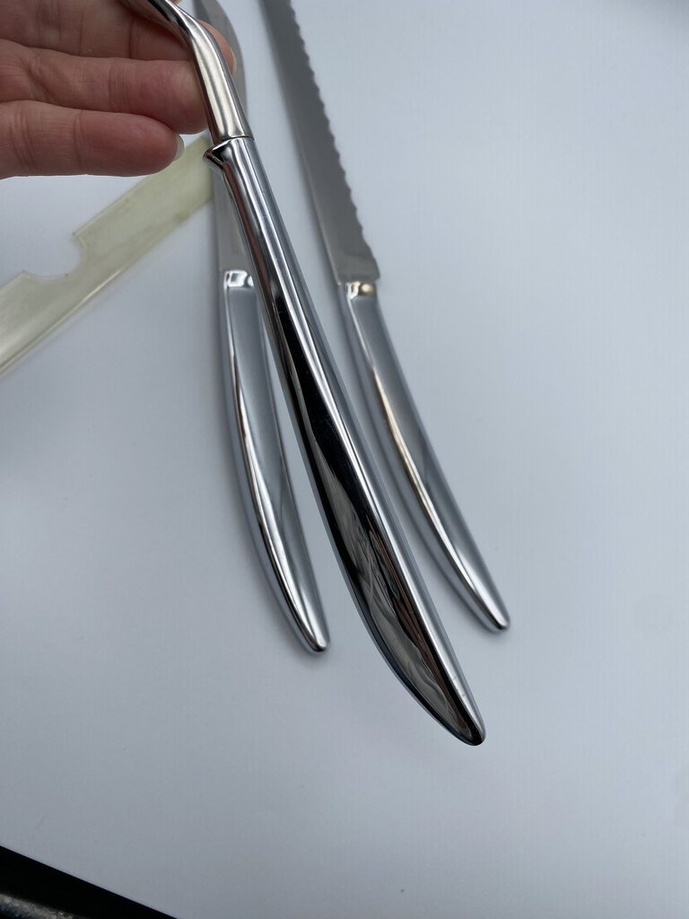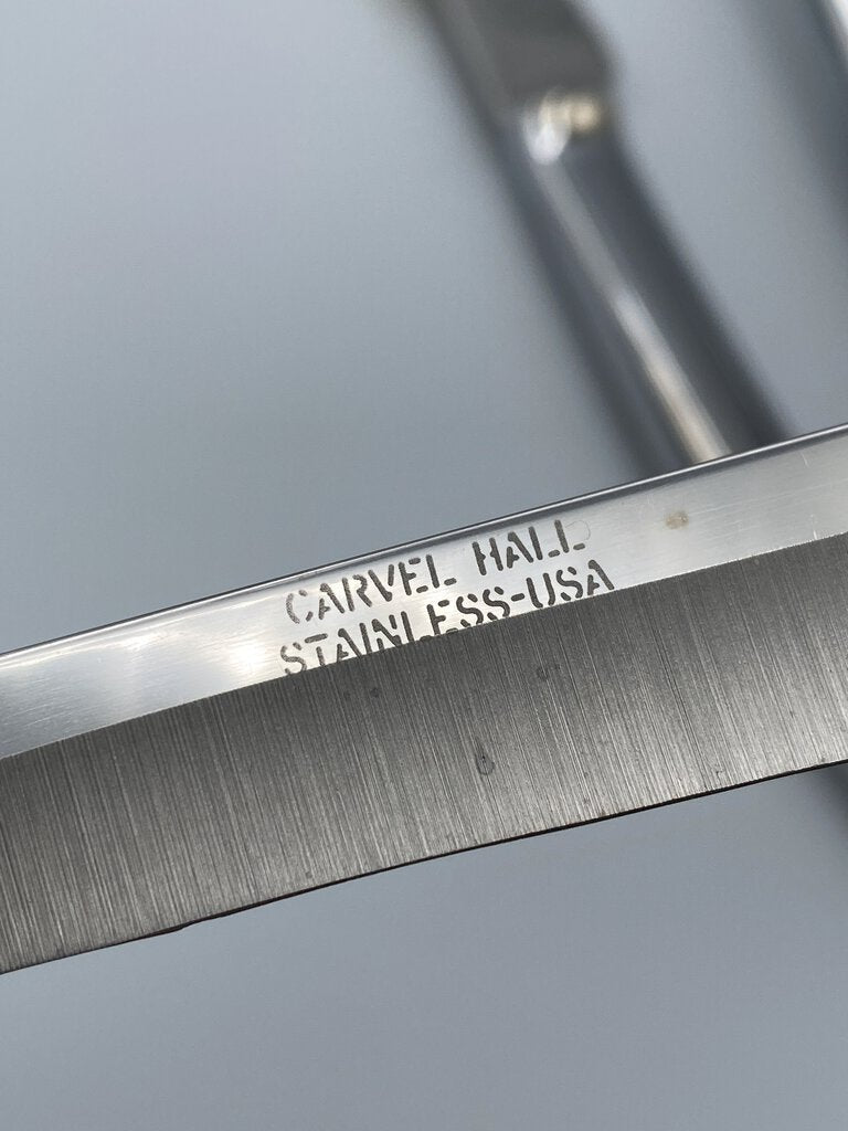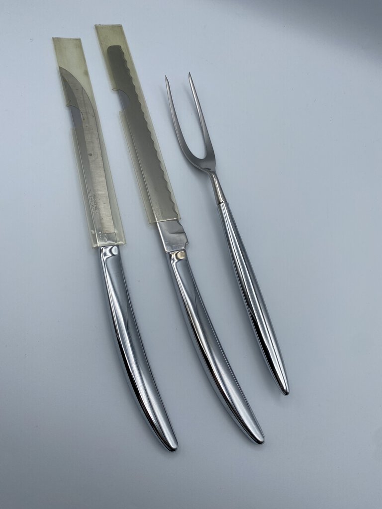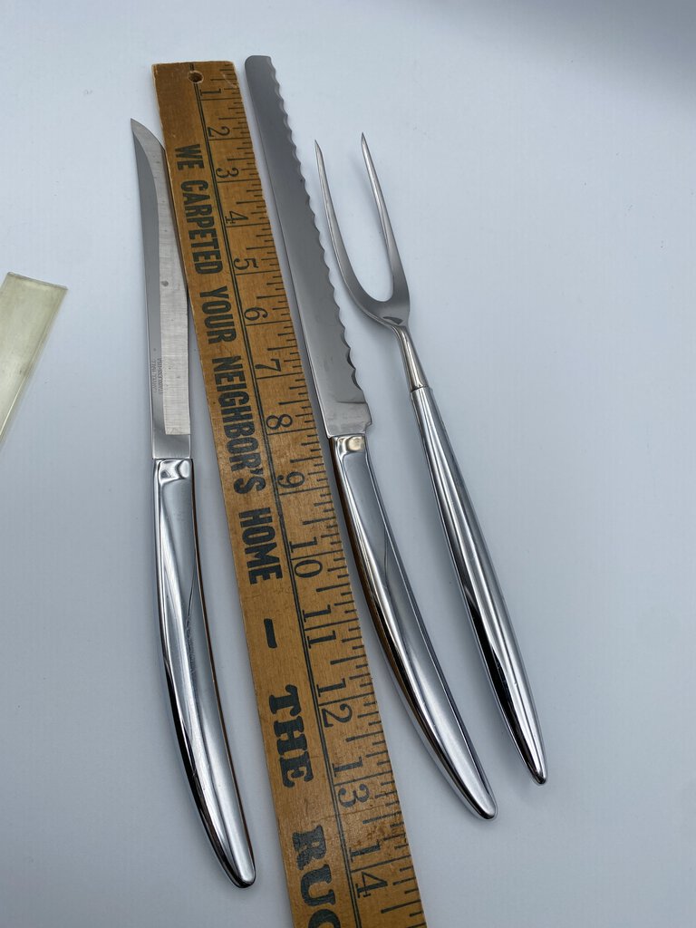Vintage set of Carvel Hall Stainless Steel Carving Set includes meat carving knife with fork and bread knife. Mid-Century-Mod in style, sleek weighted handles. Light scratches from use, knives still have plastic sleeve protectors.