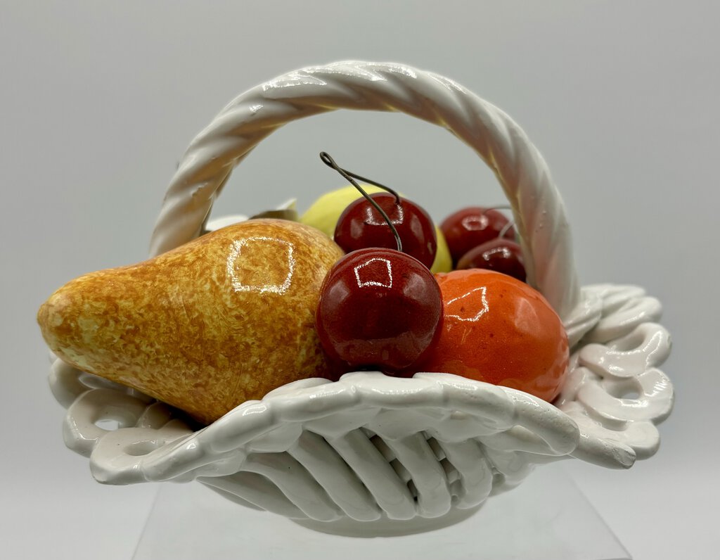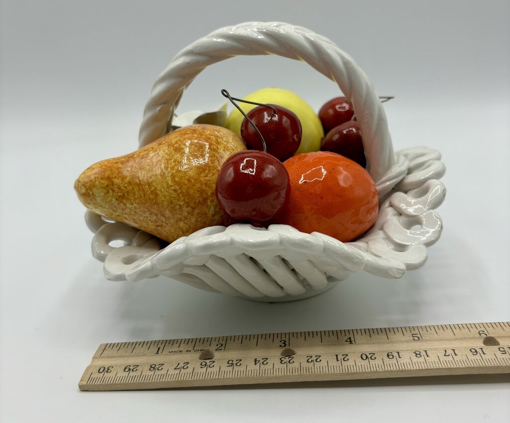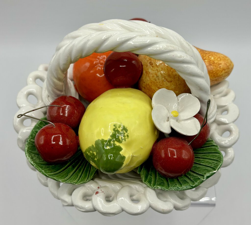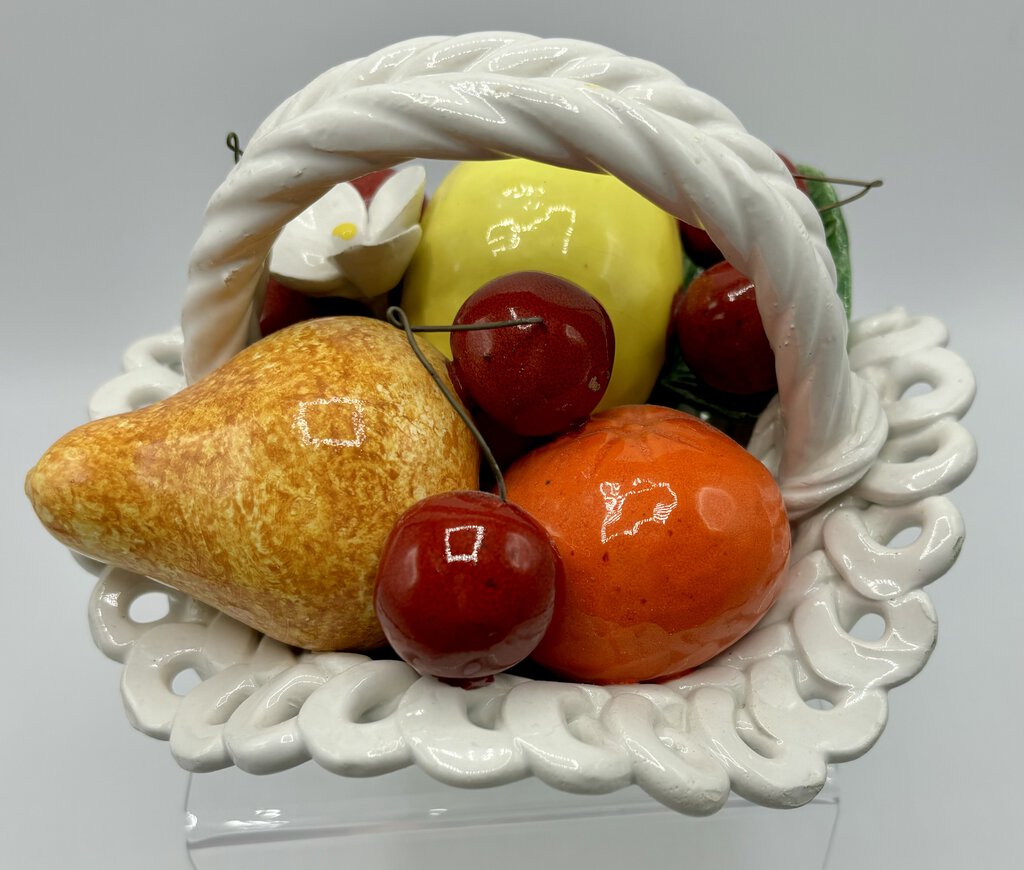 Lovely ceramic fruit basket. It has beautifully rendered cherries, a lemon, pear and orange. The basket is woven with open work at the edges. There are no chips or cracks on the fruit or top of the basket. There is one very small chip on the base. Please review photos for details. It is very reminiscent of ceramic baskets made in Italy, however, there are no marks on the bottom.