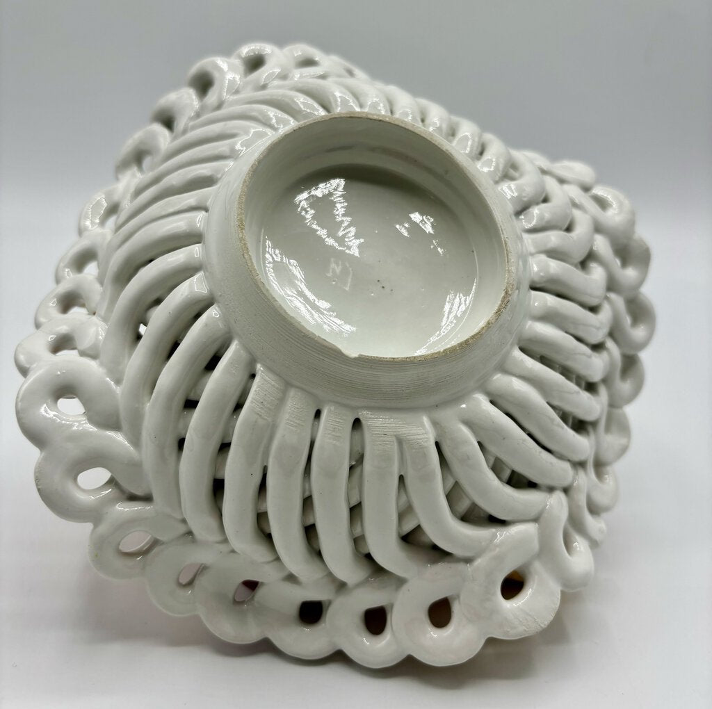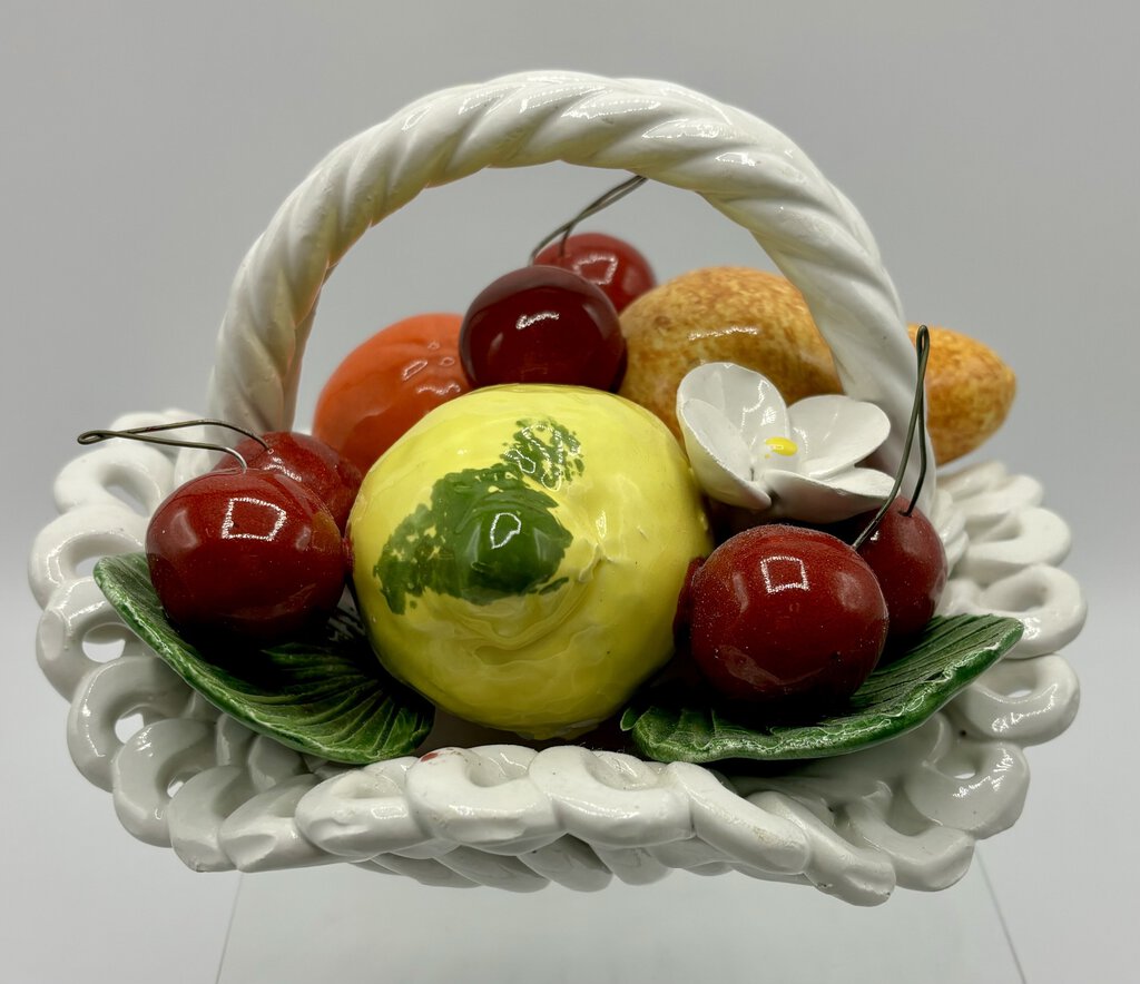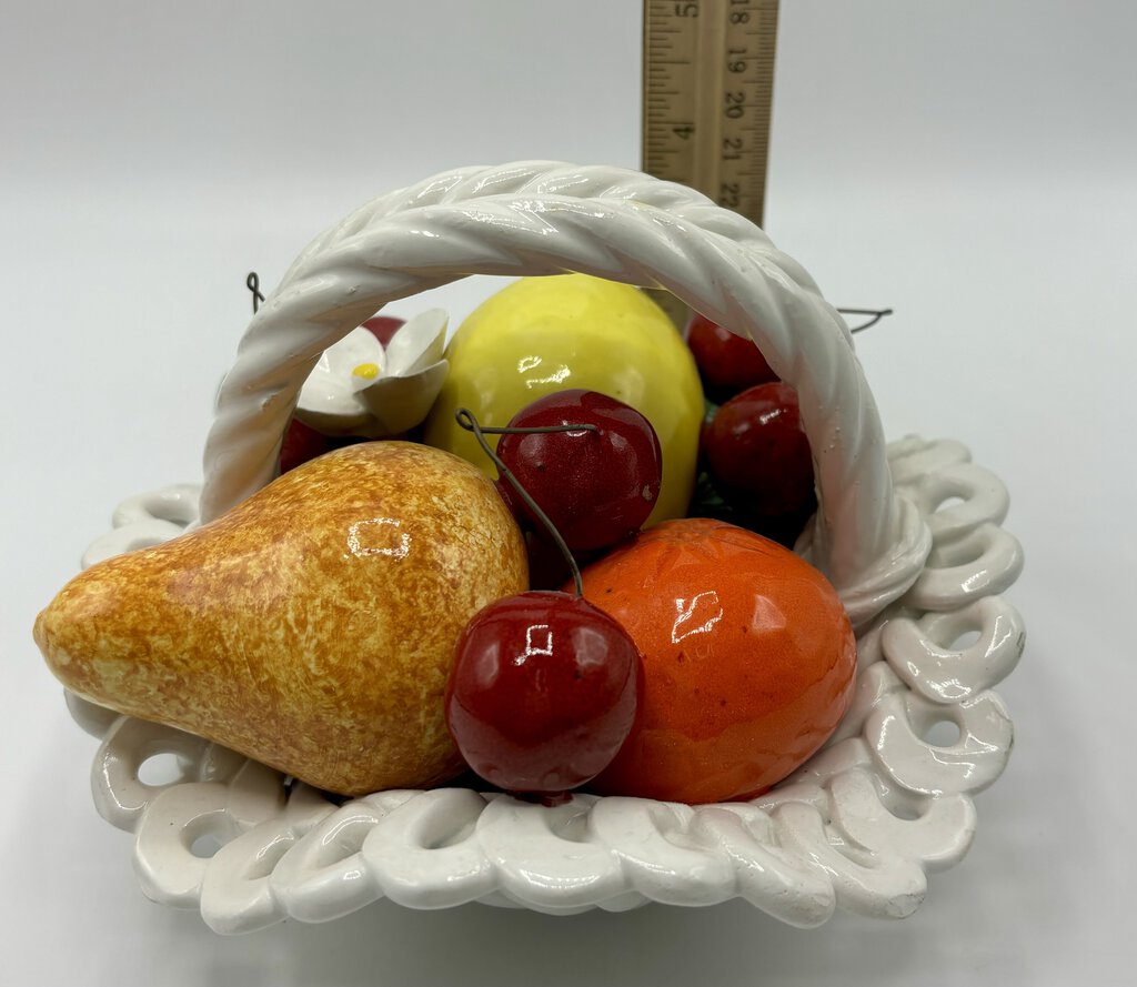 Lovely ceramic fruit basket. It has beautifully rendered cherries, a lemon, pear and orange. The basket is woven with open work at the edges. There are no chips or cracks on the fruit or top of the basket. There is one very small chip on the base. Please review photos for details. It is very reminiscent of ceramic baskets made in Italy, however, there are no marks on the bottom.