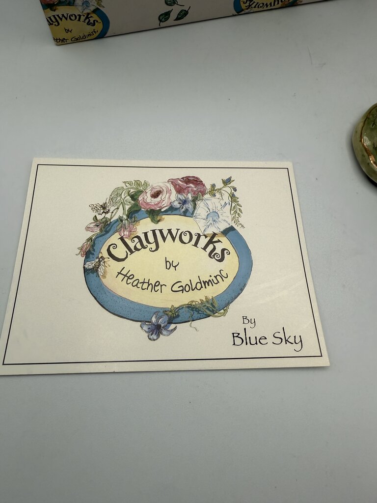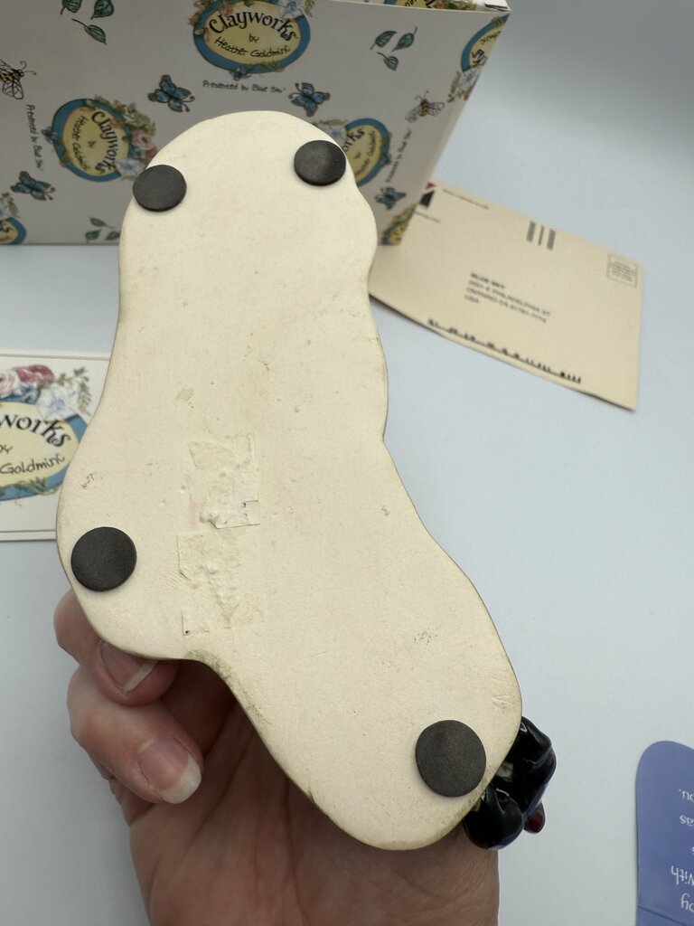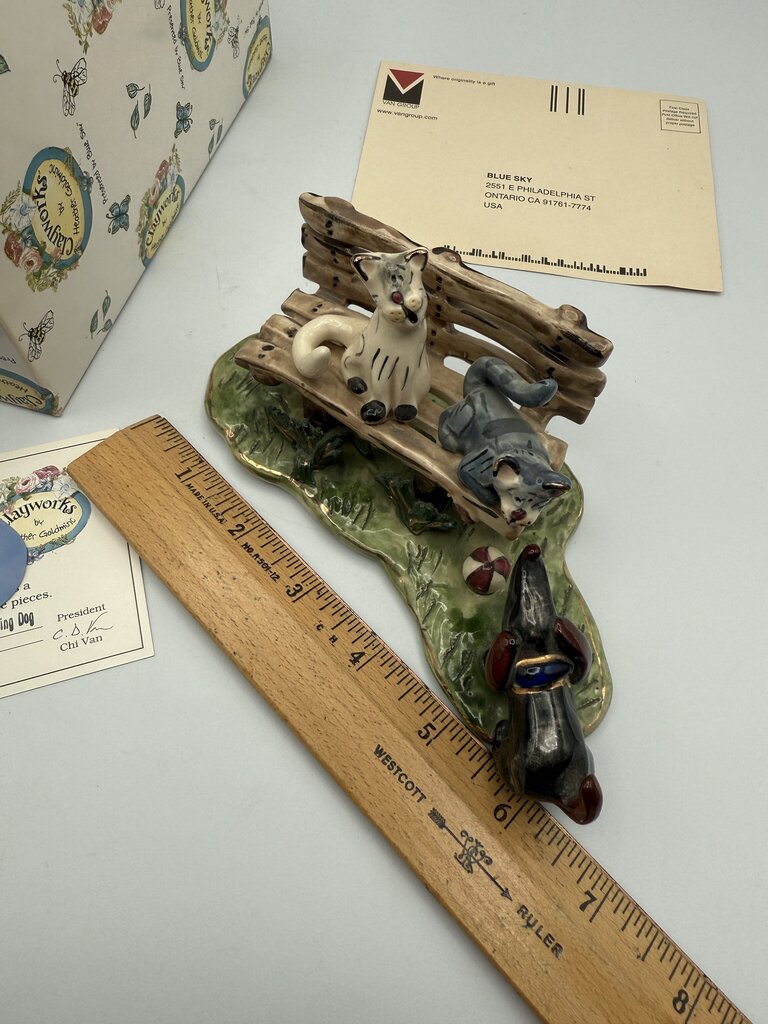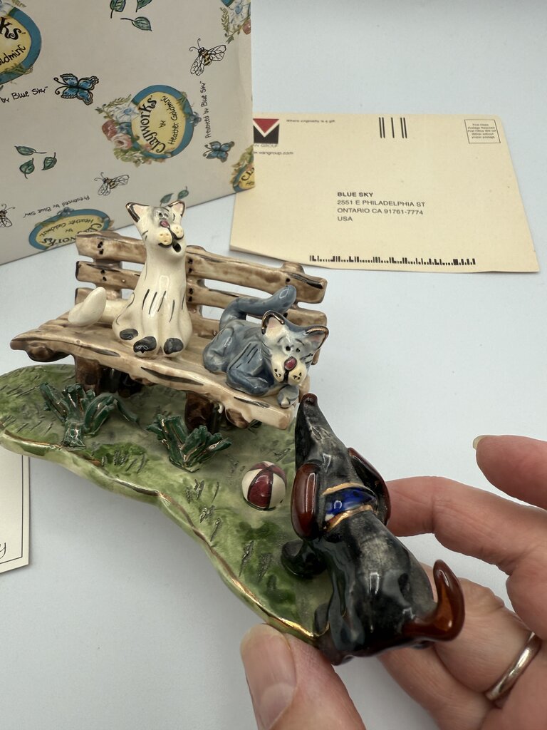 Cat themed sculpture by Blue Sky Clayworks artist, Heather Goldminc with Certificate of Authenticity. Titled, “Cats On Park Bench Meeting Dog” this charming sculpture measures approximately 6.5” long by 3” wide and 3.5” tall. This playful sculpture has no chips or cracks. In original storage box.
