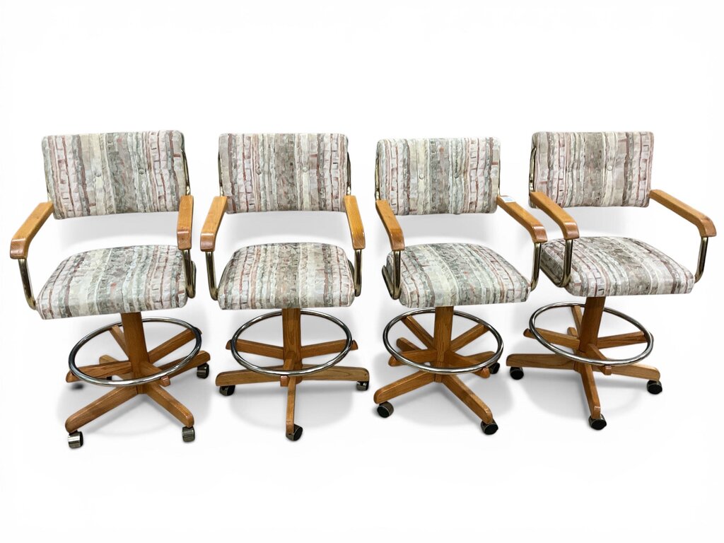 All four barstools are in great condition and have no stains or rips. They have a unique neutral colored pattern perfect for almost any home! They each have a 360-degree swivel, and all roll perfectly fine.