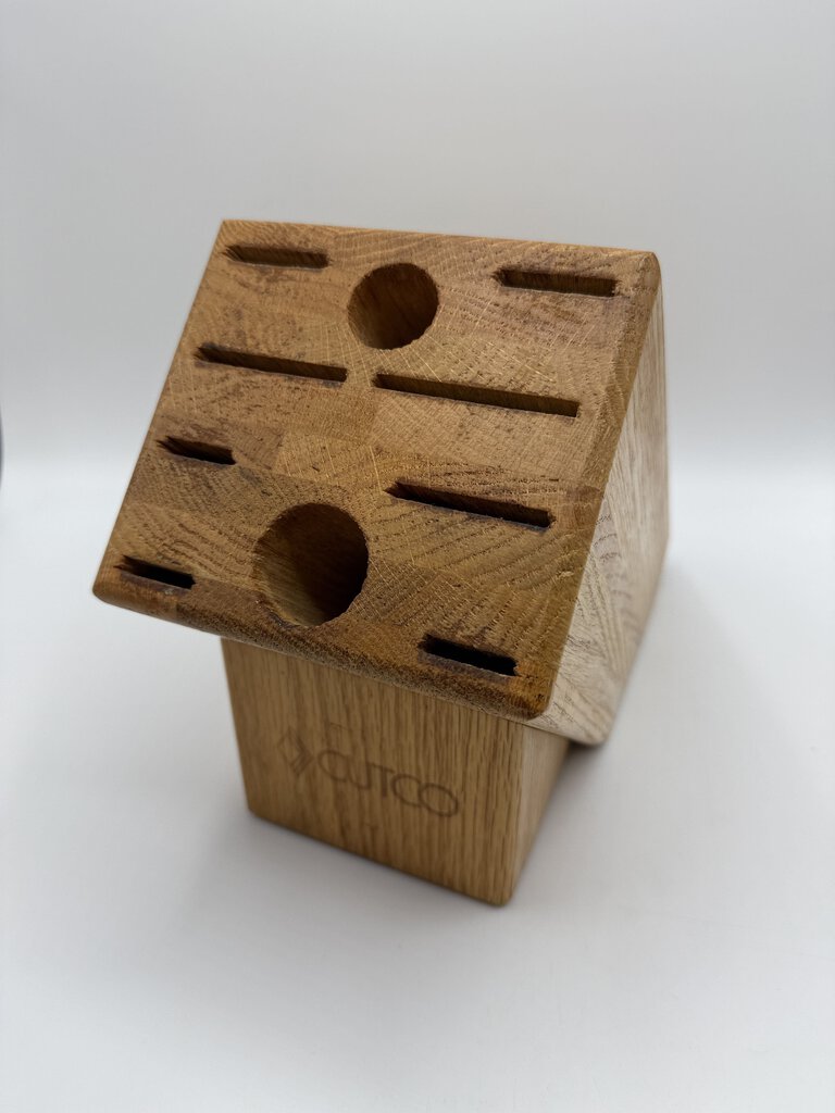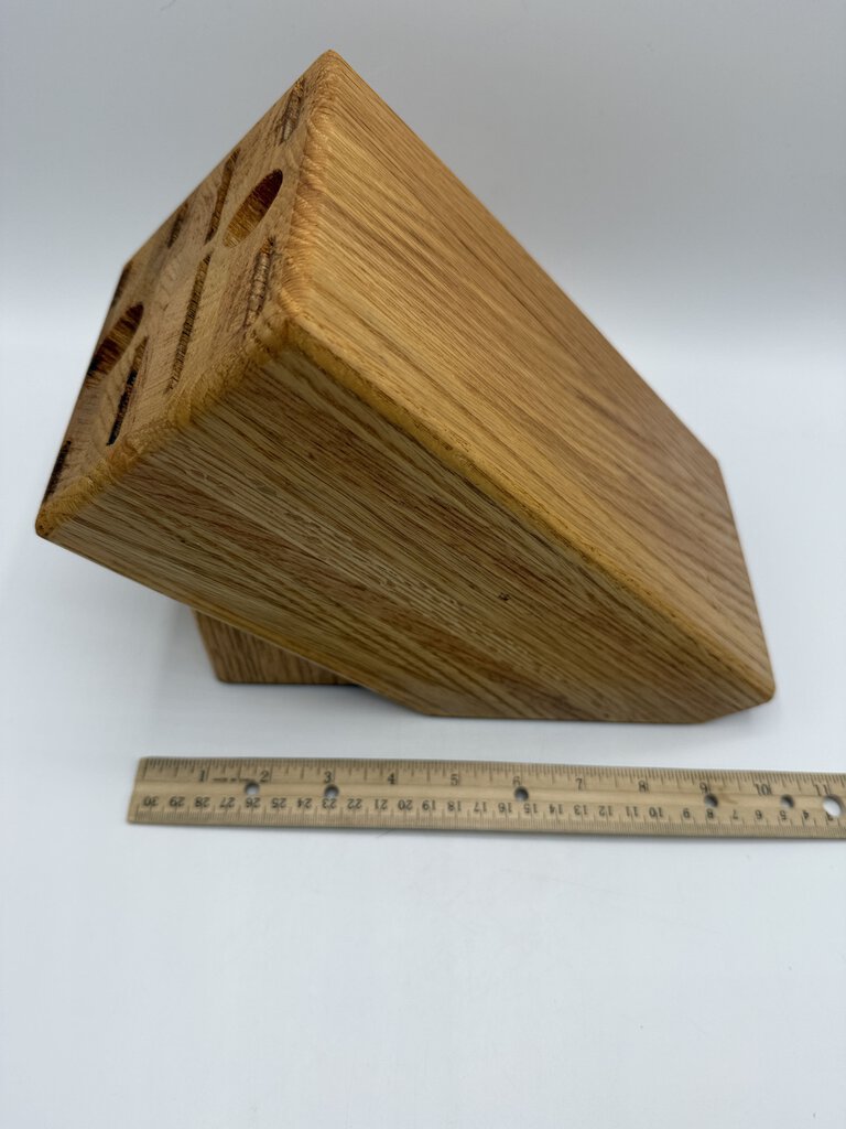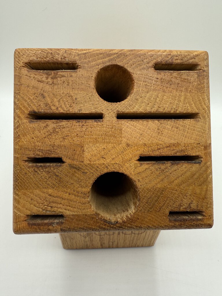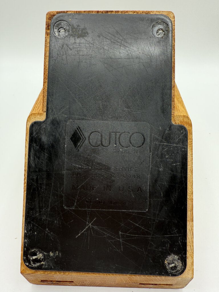 CUTCO Knife Block 10 Slot Heavy Wooden Honey Oak Countertop USA. Light wear found on wood where knife blades insert. No stains or cracks in wood. Heavy!