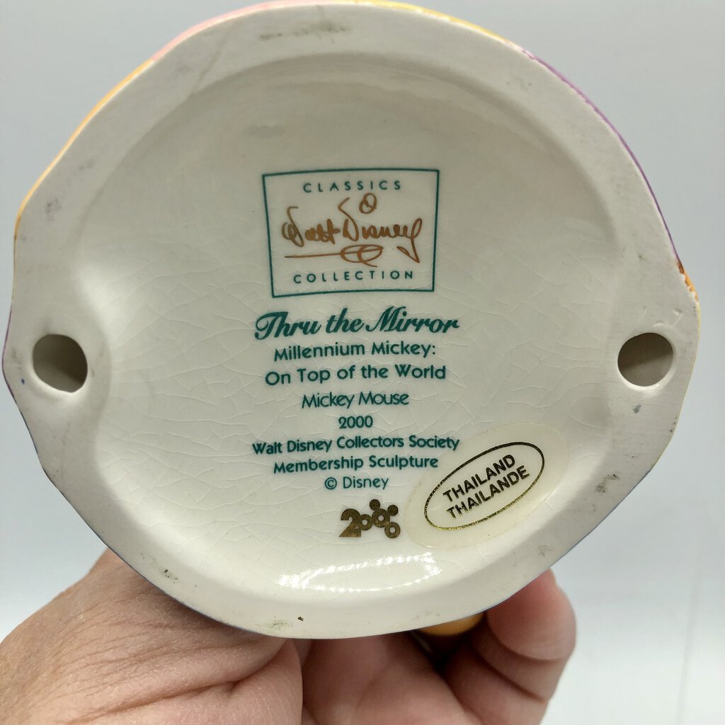This piece is one of a large and lavish collection of porcelain Disney figurines. This beautifully crafted sculpture was developed through the collaborative efforts of the animators and othe artists of The Walt Disney Studios. 2000 Millennium Mickey: On Top of the World from Walt Disney’s Thru the Mirror. Complete with Certificate of Authenticity. No box. Very good condition. No chips, breaks or repairs. Minor crazing on bottom clear coat glaze (see photos). No box. Please review all photos carefully for condition and consideration. Check my other listings for many more Disney and Pixar collectibles. Estate item. Condition is Pre Owned. |