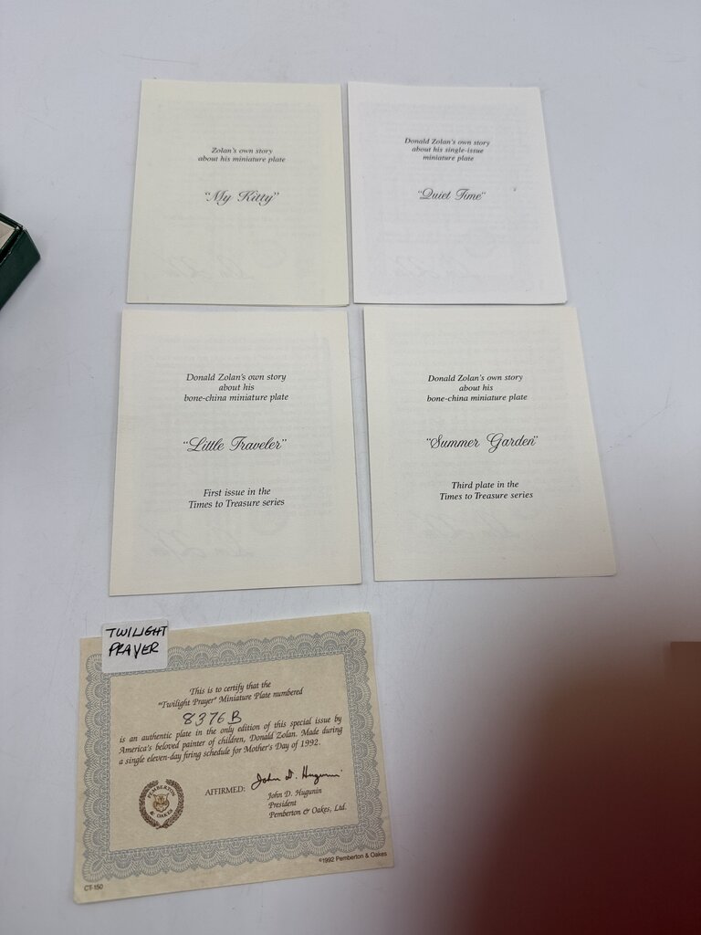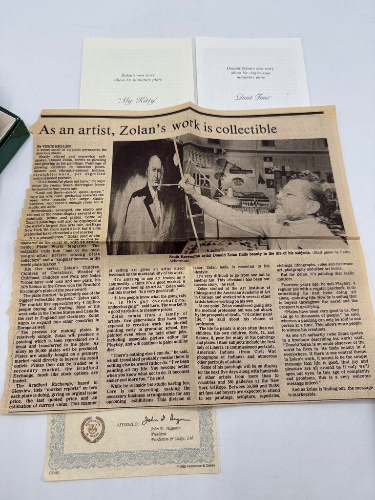 Also included is the Catalog for Donald Zolan Plate Collector’s Treasury Booklet. A newspaper article about the artist and the COA’s. No damage found, clean.