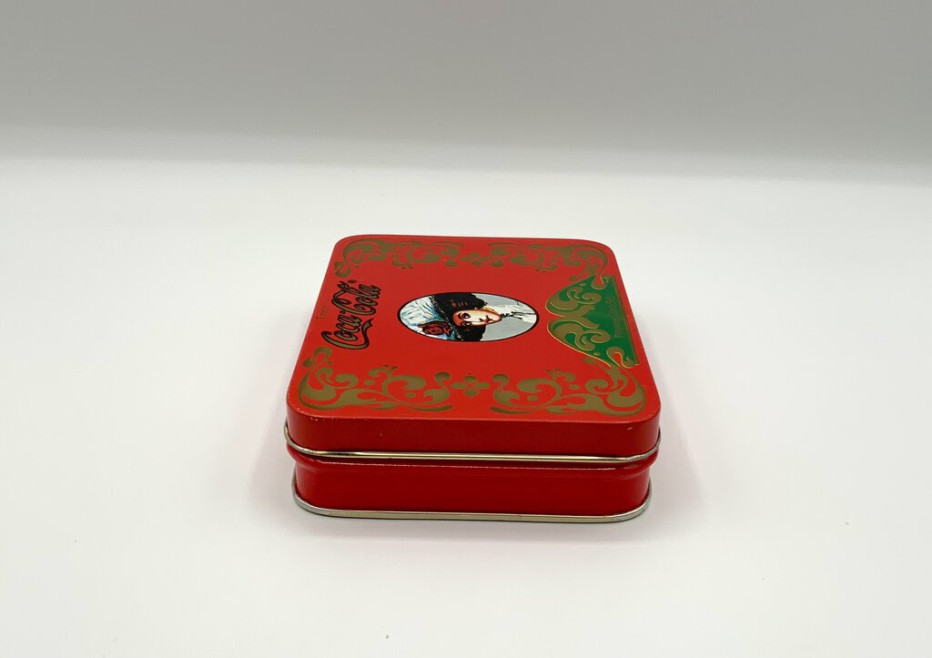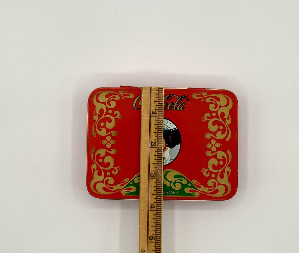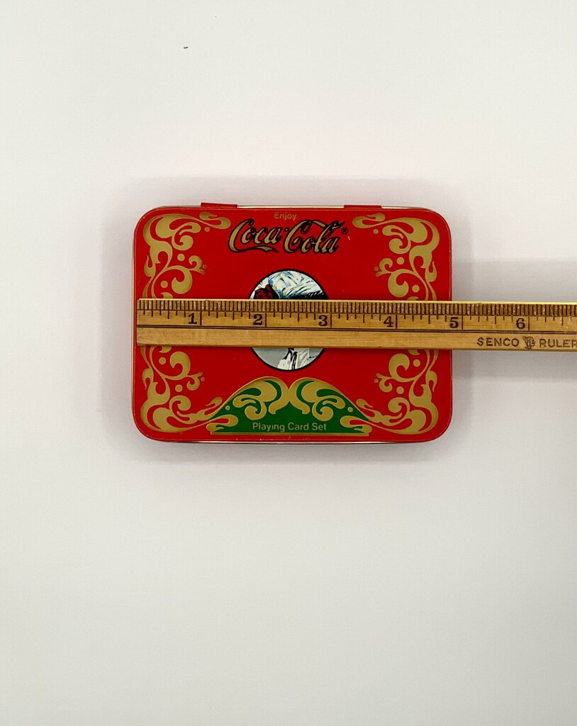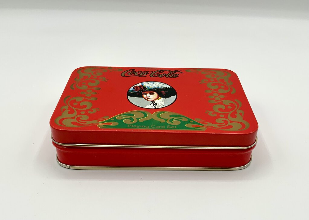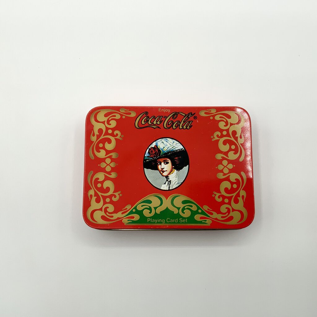 The Coca-Cola Playing Card Set tin is a collectible item that used to have a deck of playing cards with the Coca-Cola theme. The tin itself is rectangular, made of metal, and has a hinged lid. It is decorated with Coca-Cola branding and imagery, such as the iconic red and white logo or vintage advertisements. This set is often sought after by Coca-Cola enthusiasts and collectors of playing card memorabilia. In good condition.