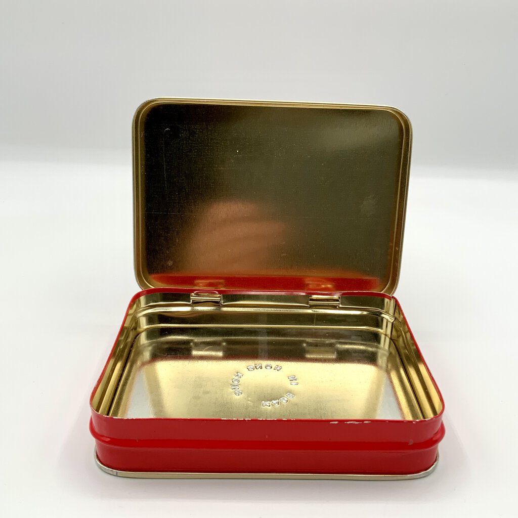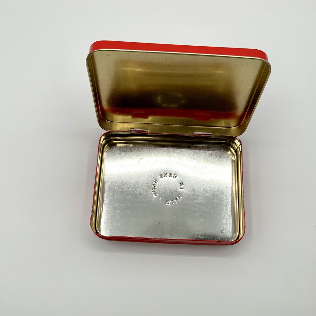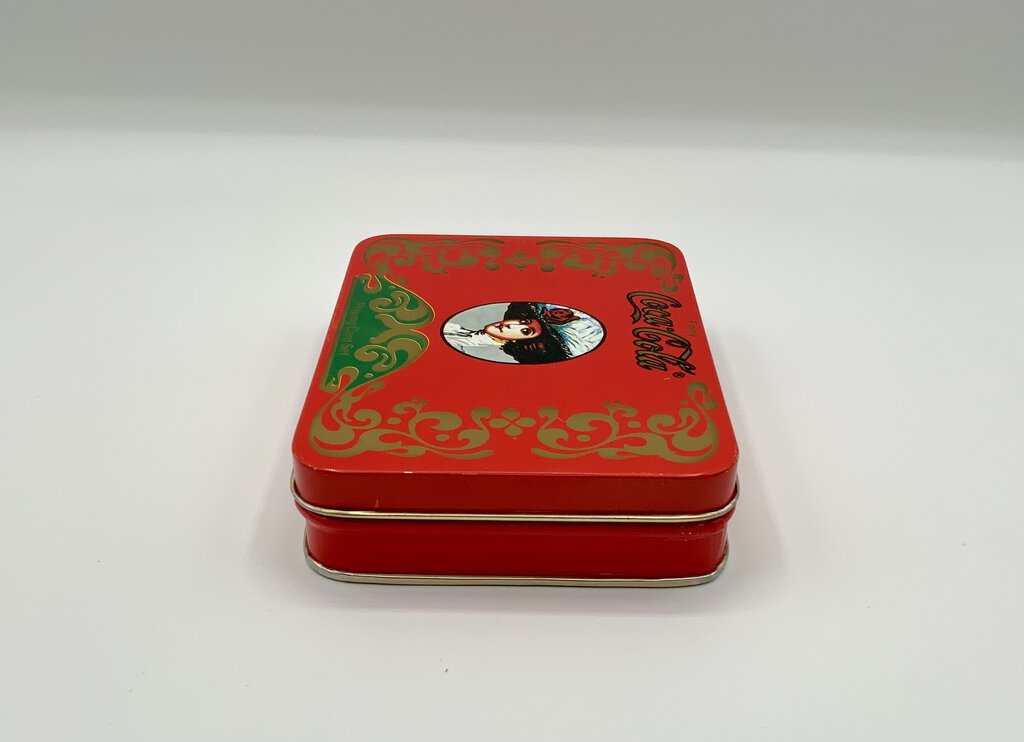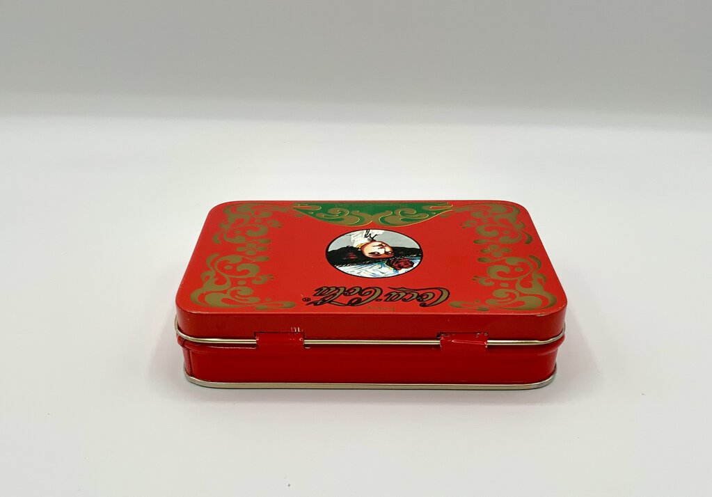 The Coca-Cola Playing Card Set tin is a collectible item that used to have a deck of playing cards with the Coca-Cola theme. The tin itself is rectangular, made of metal, and has a hinged lid. It is decorated with Coca-Cola branding and imagery, such as the iconic red and white logo or vintage advertisements. This set is often sought after by Coca-Cola enthusiasts and collectors of playing card memorabilia. In good condition.