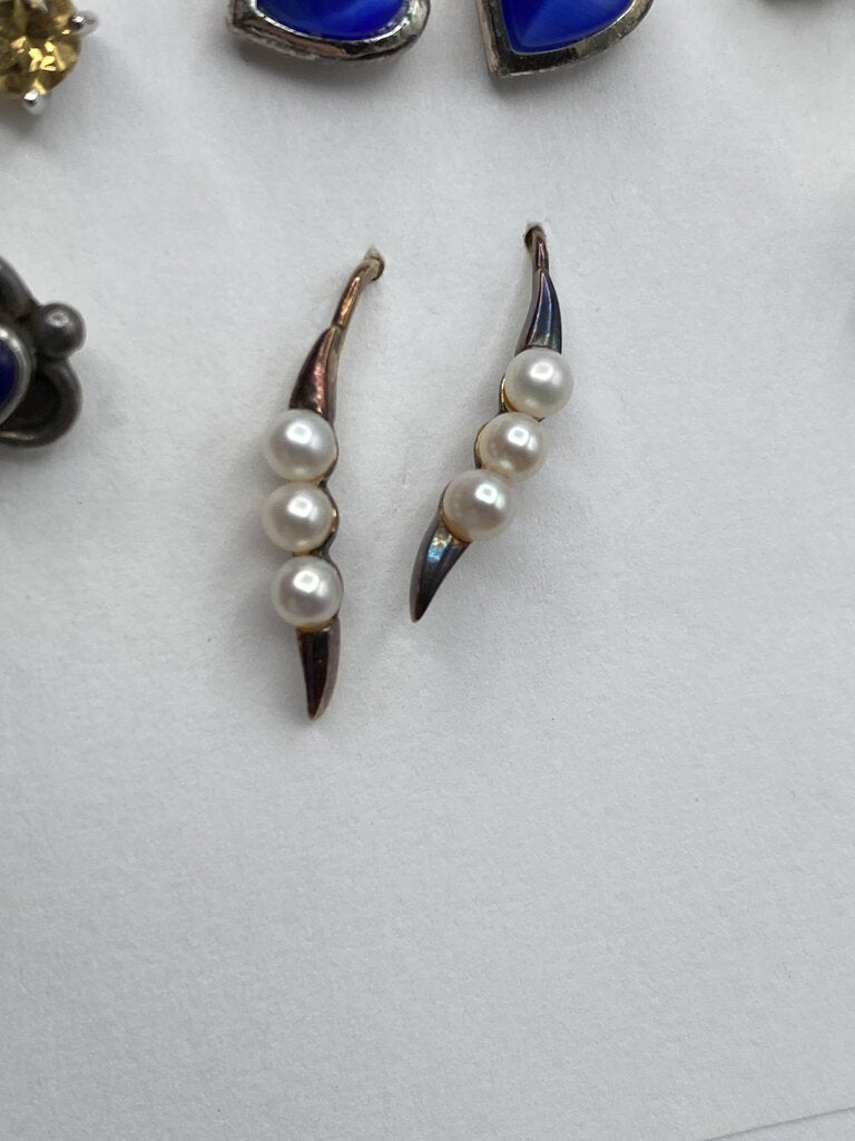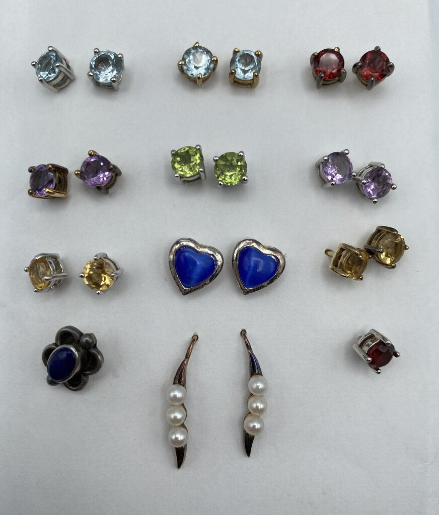 Estate lot of pierced gemstone stud earrings in sterling silver. Set includes Ten different pairs of earrings in a variety of colored gemstones. Two single pierced earrings are included in lot. All hallmarked .925, one pair is by Robert Seeman Danish Designer.