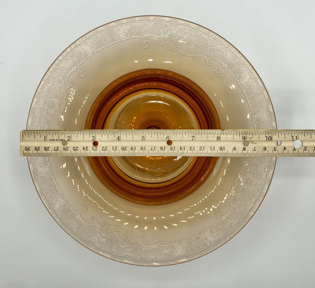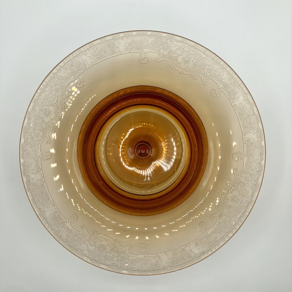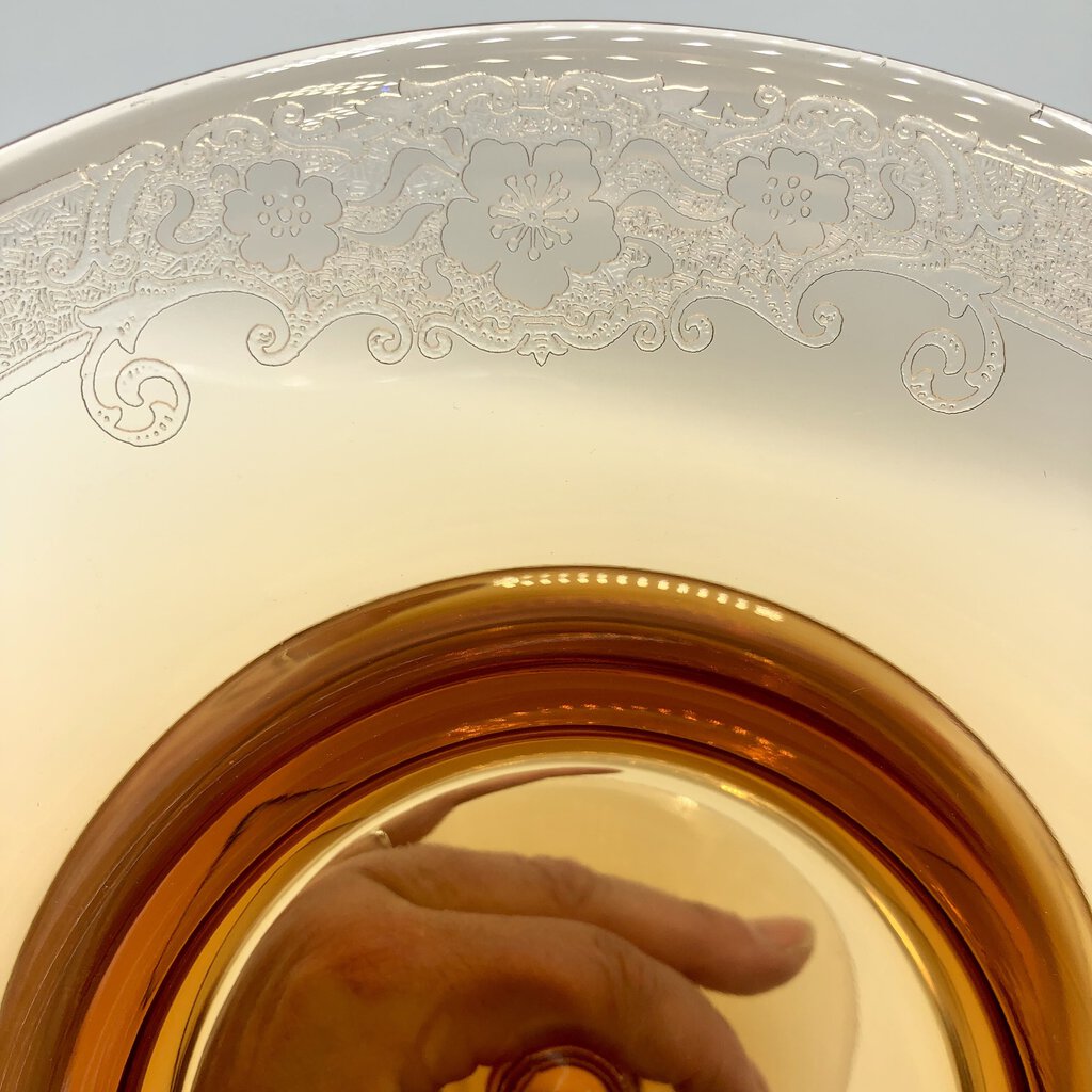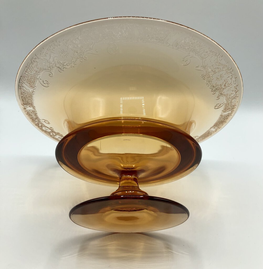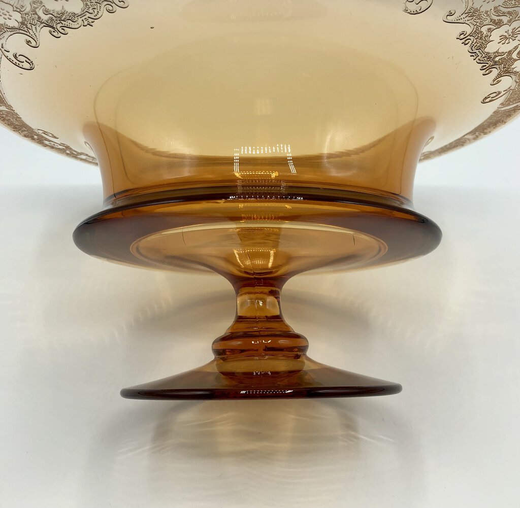 An exquisite example of Fostoria glass with soft lines and rich ombré hue. The rim is etched with scrolls and floral accents.
