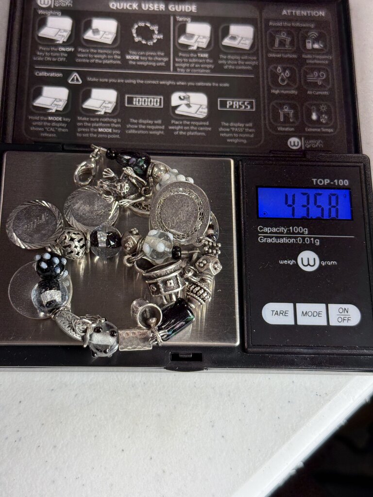 Estate bracelet with Black, White and clear glass beads and sterling silver charms. The charms are all hallmarked .925 or sterling. Five of the charms are birthday charms for children. The remaining 5 charms are a frog, woman’s high heel shoe, wine glass, birthday cake and the #1. Lobster claw clasp that connect to a flower on the other end of bracelet. Measures 7” long. No damage found.