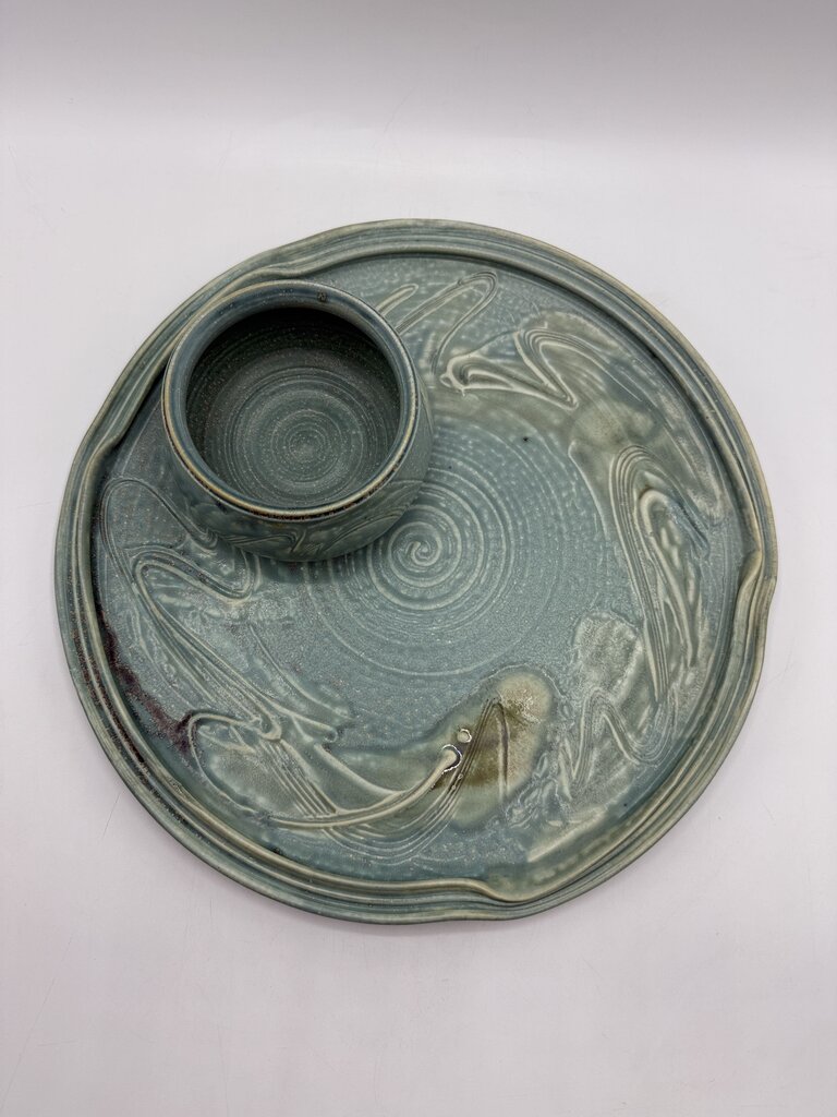 Attractive handmade pottery tray with attached bowl, perfect for your next charcuterie party. Tray and bowl have a textured design by artist, glazed a light turquoise. Signed on the bottom by maker. Tray measures 12” in diameter with a raised edge. Attached bowl is 3” deep with a 3.75” opening to add your favorite snacks. No chips or cracks.