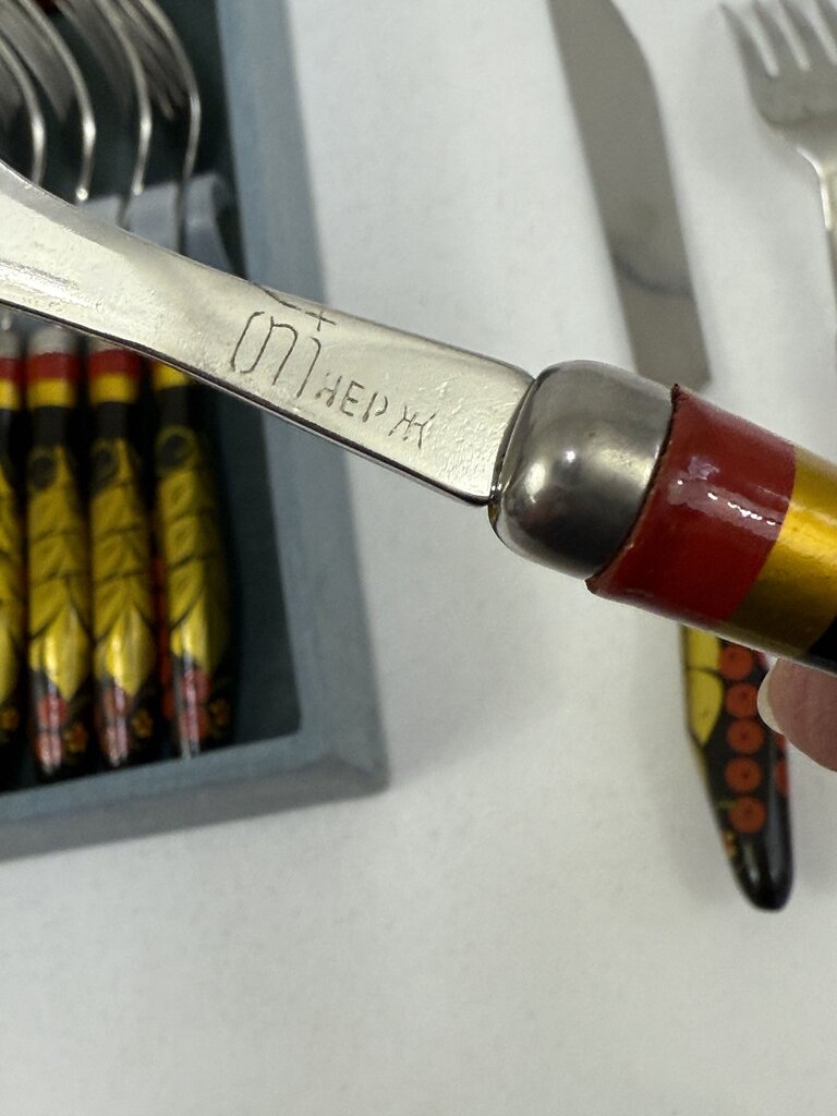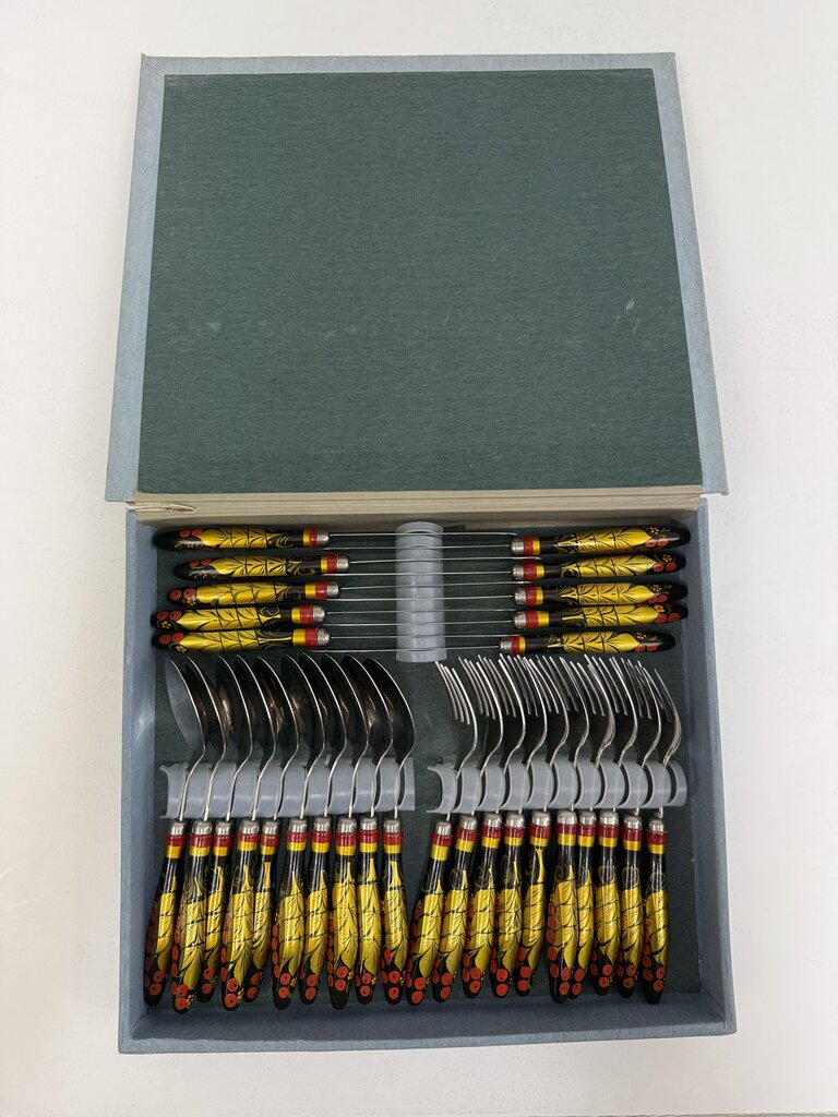 Boxed set of vintage flatware, Ukrainian Folk Art handpainted handles in vibrant colors of Black, Red, Gold with little yellow flowers. Set includes 10 Tablespoons, 10 Forks and 10 Knives. All in very good condition, no wear on painted handles. Estate set, looks never used.