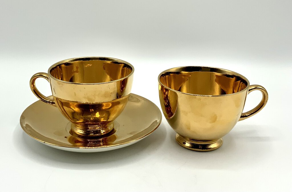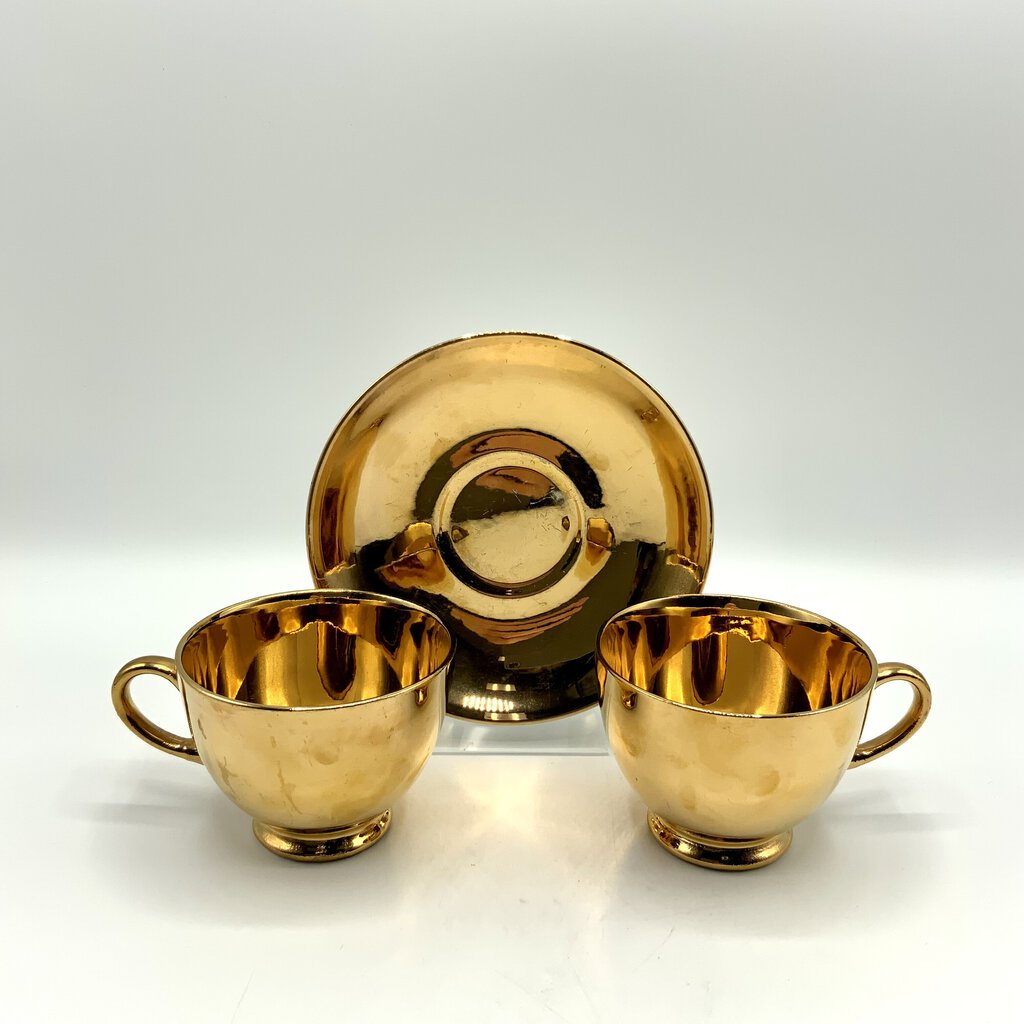 Homer Laughlin Georgian Geo H. Bowman 22k Tea cups (2) and Saucer (1) /ah