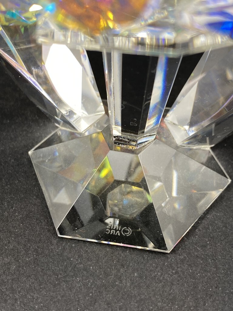 Beautiful and sparkly, this sweet hummingbird feeding off a flower is made by Iris Arc and is signed on the base. The flower is iridescent in color, bird is clear. No chips , cracks or repairs. Measures approximately 4” long by 3” tall.