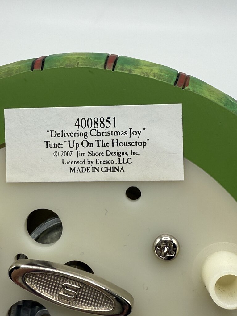Jim Shore Christmas Snow Globe “Delivering Christmas Joy” model 4008851 2007 plays “Up on the Housetop”. Mistletoe and berries decorate the base with a Santa and a bag of toys inside the snow globe. The snow globe stands 6” tall and 4.5” in diameter. No damage found, no box. Ready for display.