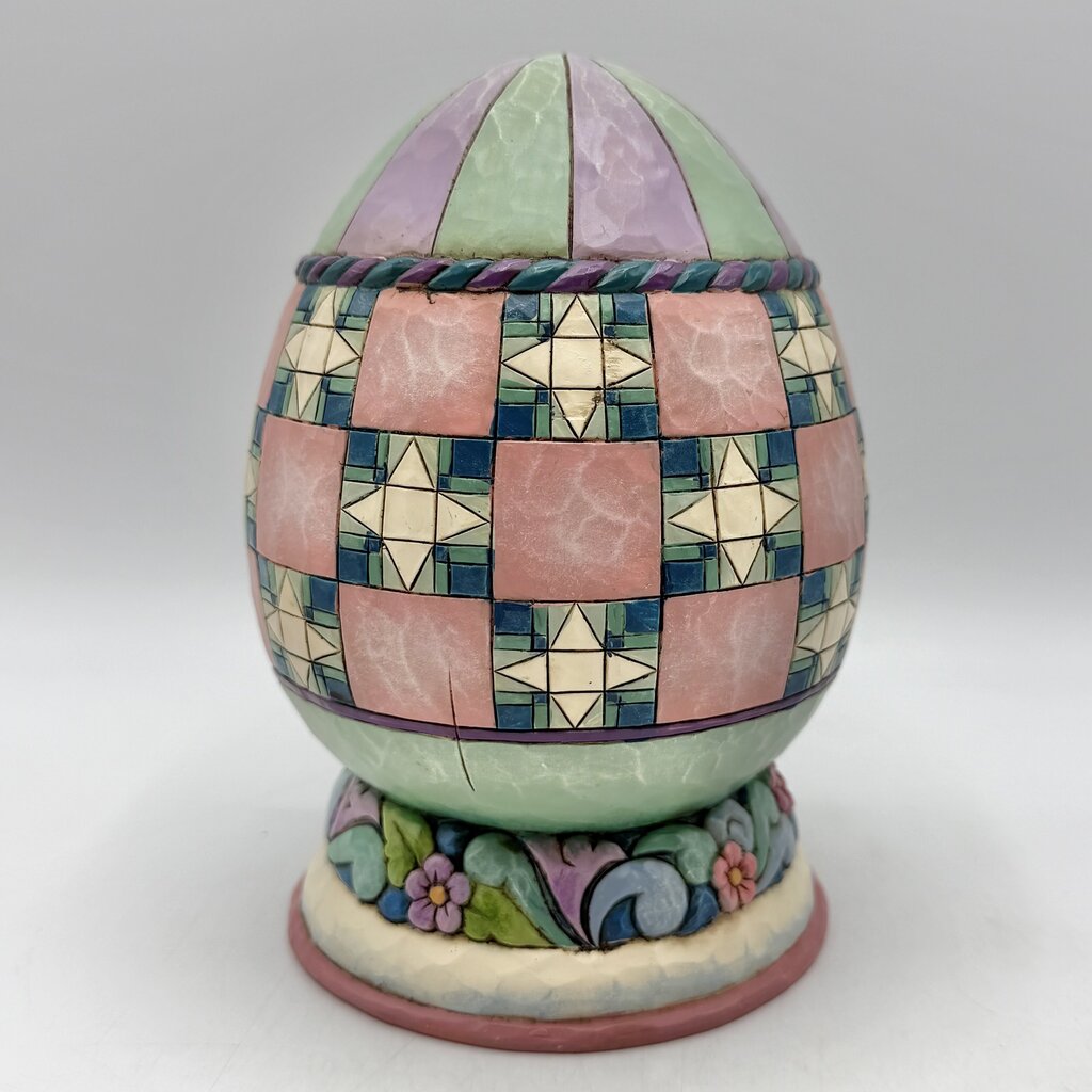 Enesco Jim Shore Heartwood Creek 2009 “Spring Love” lighted egg diorama 4015889. This figurine is a beautifully decorated egg, with spring flowers and the Spring Fancy quilt pattern, opening to reveal a loving bunny couple collecting Easter eggs. Made of resin it features the intricate whimsical folk art designs Jim Shore is known and loved for. The diorama illuminates from within, casting a gentle glow.