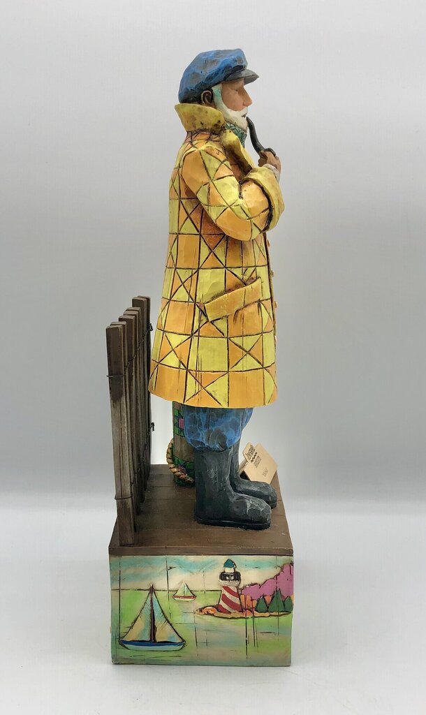 Another great piece by Jim Shore, titled “Old Salt”. This sea captain and his wharf cat stand on a deck stylized with a quaint sea town.