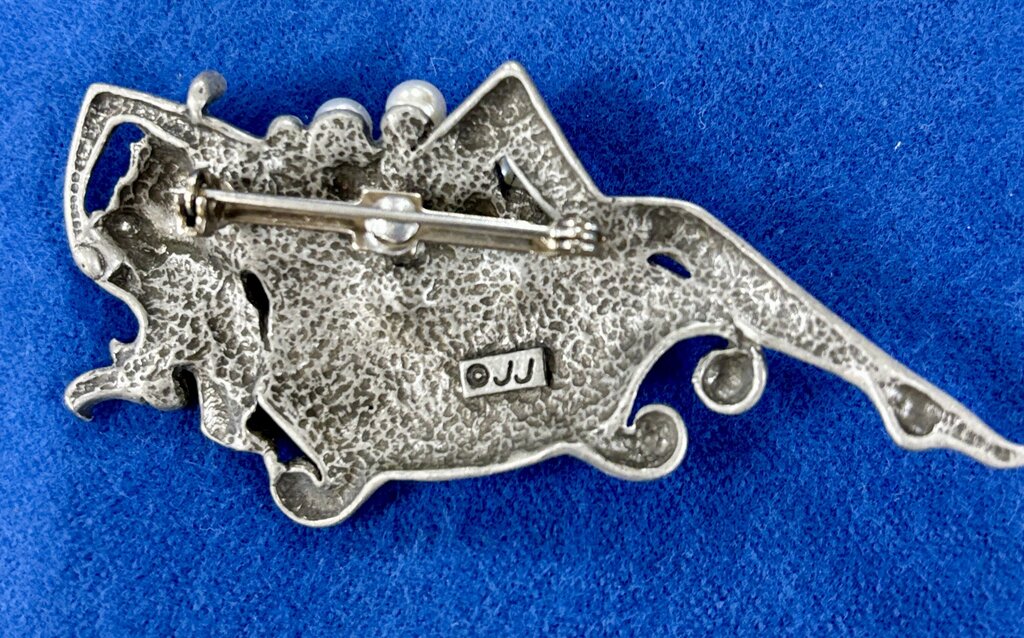 Wonderful brooch by designer JJ Jonette. Ramp up your jewelry for spring with the on trend brooch. This brooch is of a women relaxing in a bubble bath of pearls.