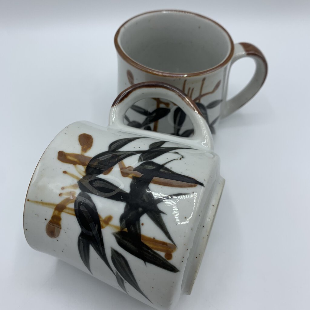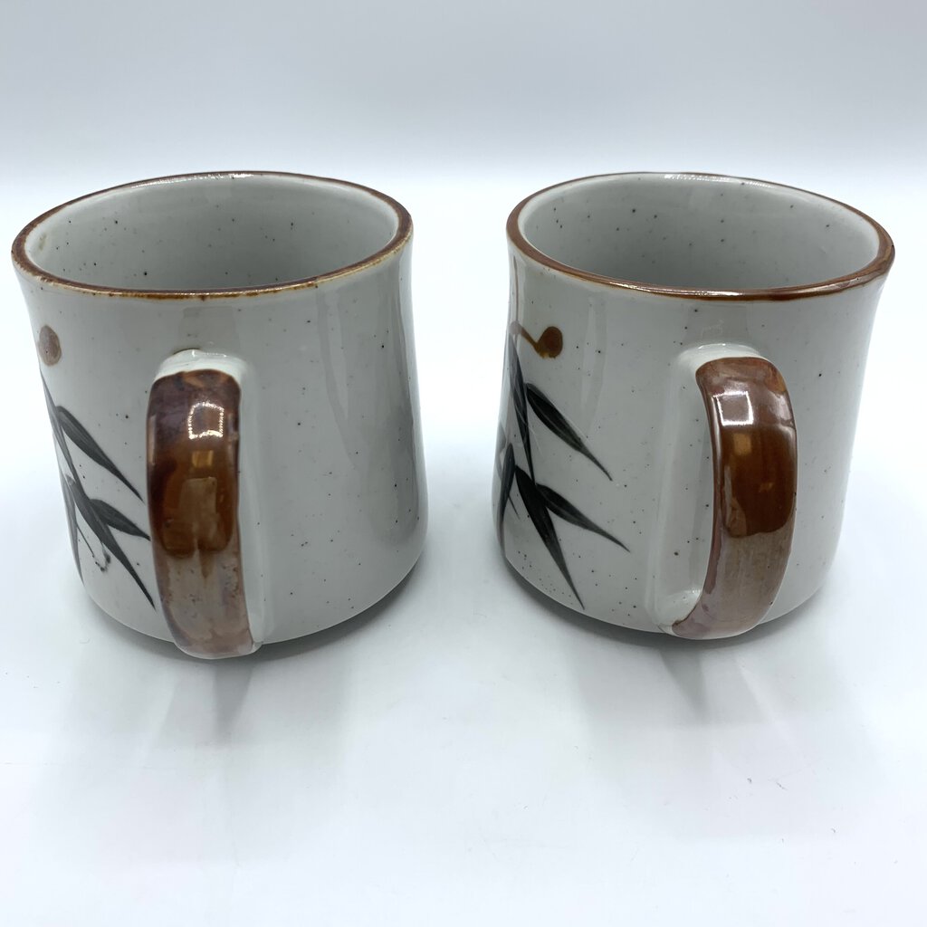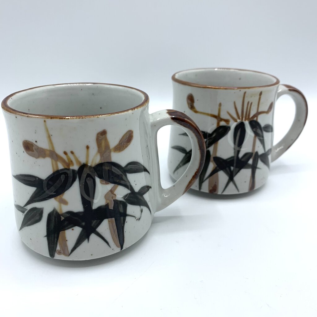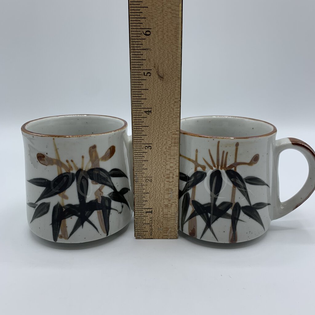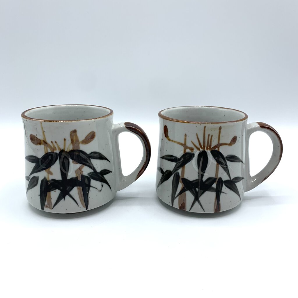 Set of 2 artfully crafted studio pottery mugs made in Korea. They feature an understated speckled glaze with a peaceful bamboo motif.