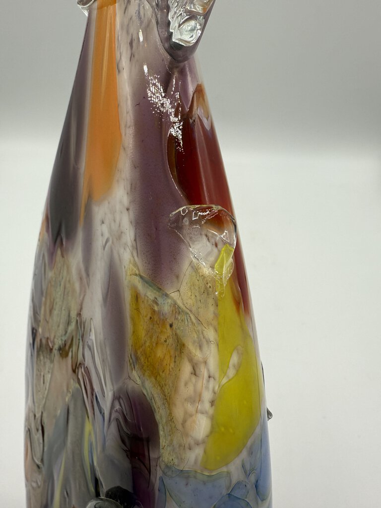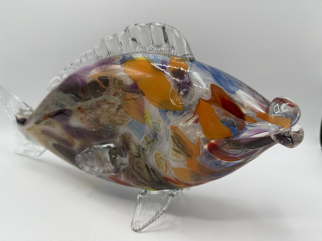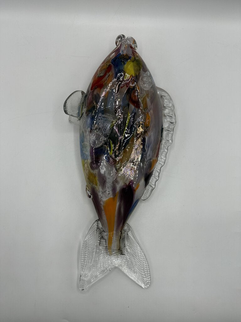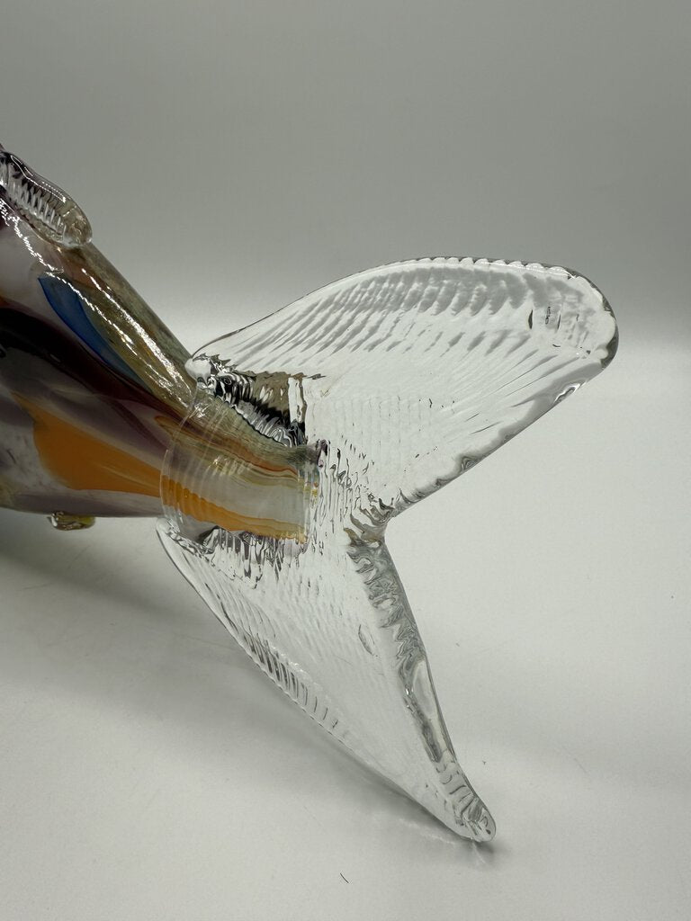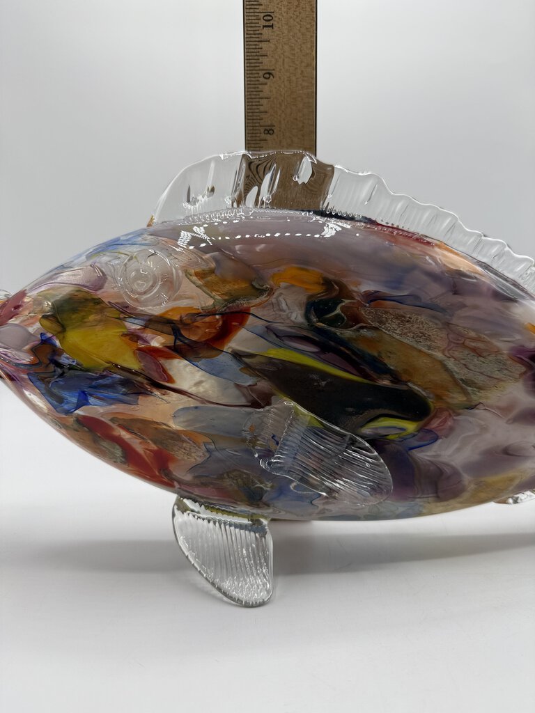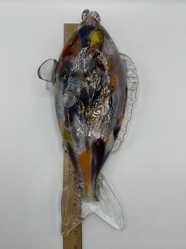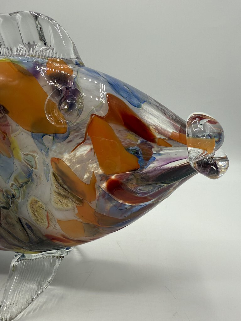 This freestanding, large and colorful blown glass fish measures 17” long and and stands 7.25” tall. Blown glass body in multicolored, with clear glass applied fins and tail. No damage found.