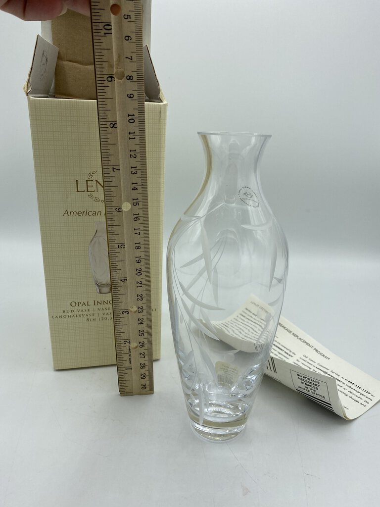 New in Box never used Lenox Crystal Bud Vase made in Poland. The vase is in it’s original wrapping paper and has tags. It measures 8” tall, 3” in diameter at it’s widest and the mouth is 1.25” in diameter. Excellent quality. Original price was $58.00.