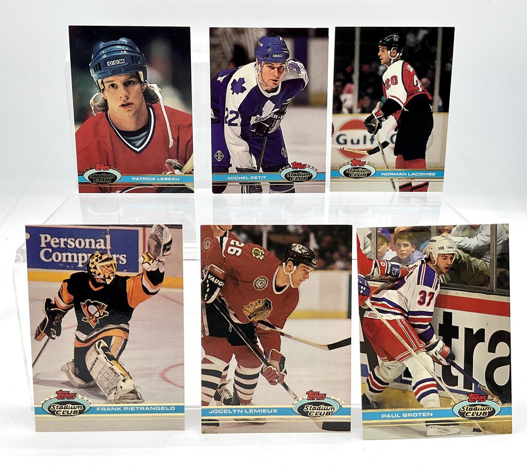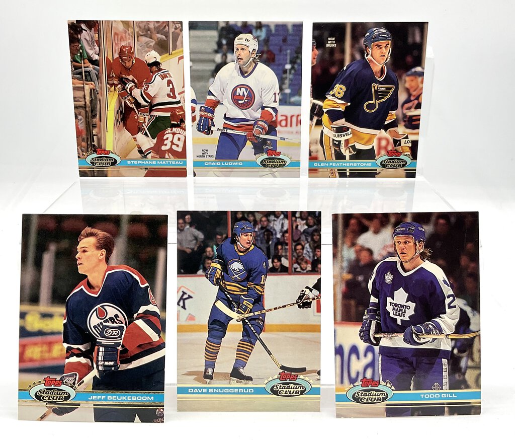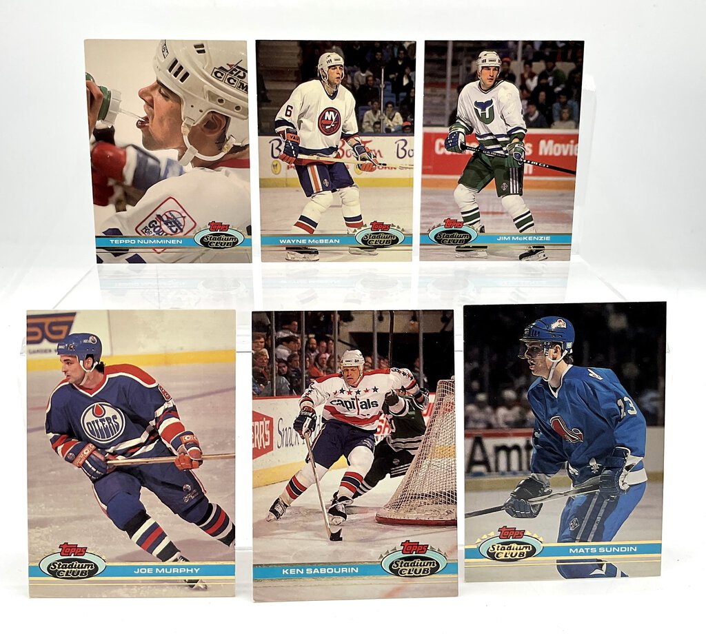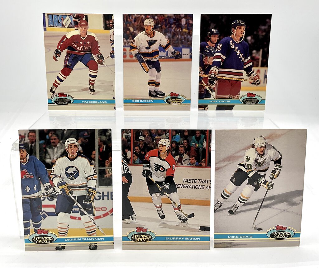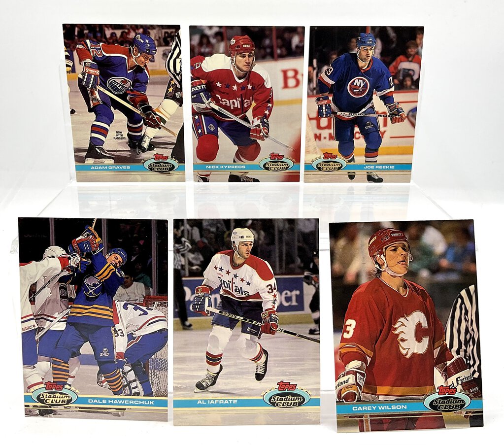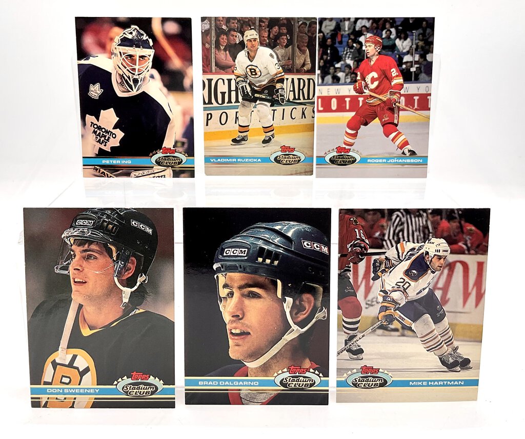Amazing lot of Topps Stadium Club 1991 hockey trading cards. This set includes 119 cards featuring players from the National Hockey League (NHL). These sports trading cards are a must-have for any ice hockey fan and collector. With a variety of players and positions, this lot is perfect for expanding your card collection. The cards are in very good condition.