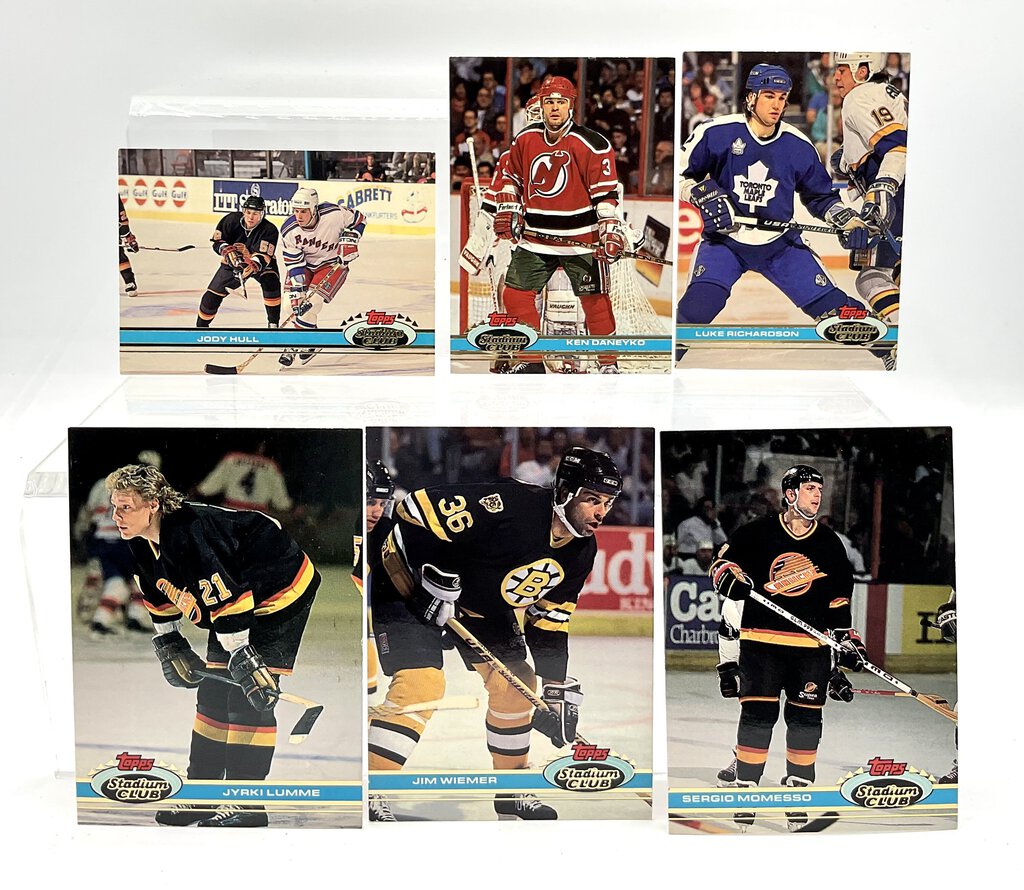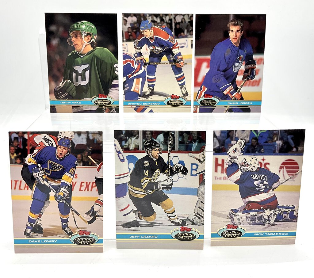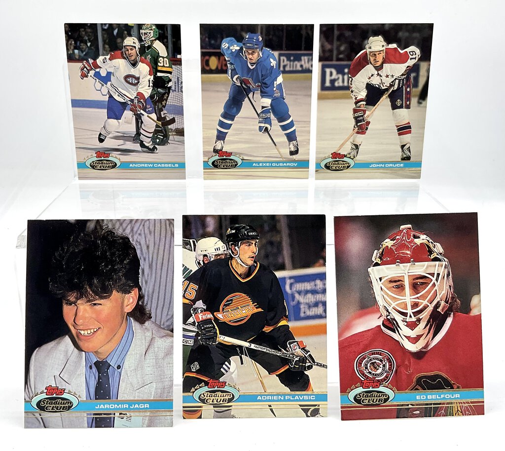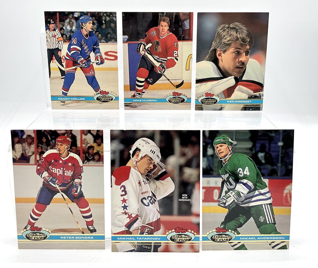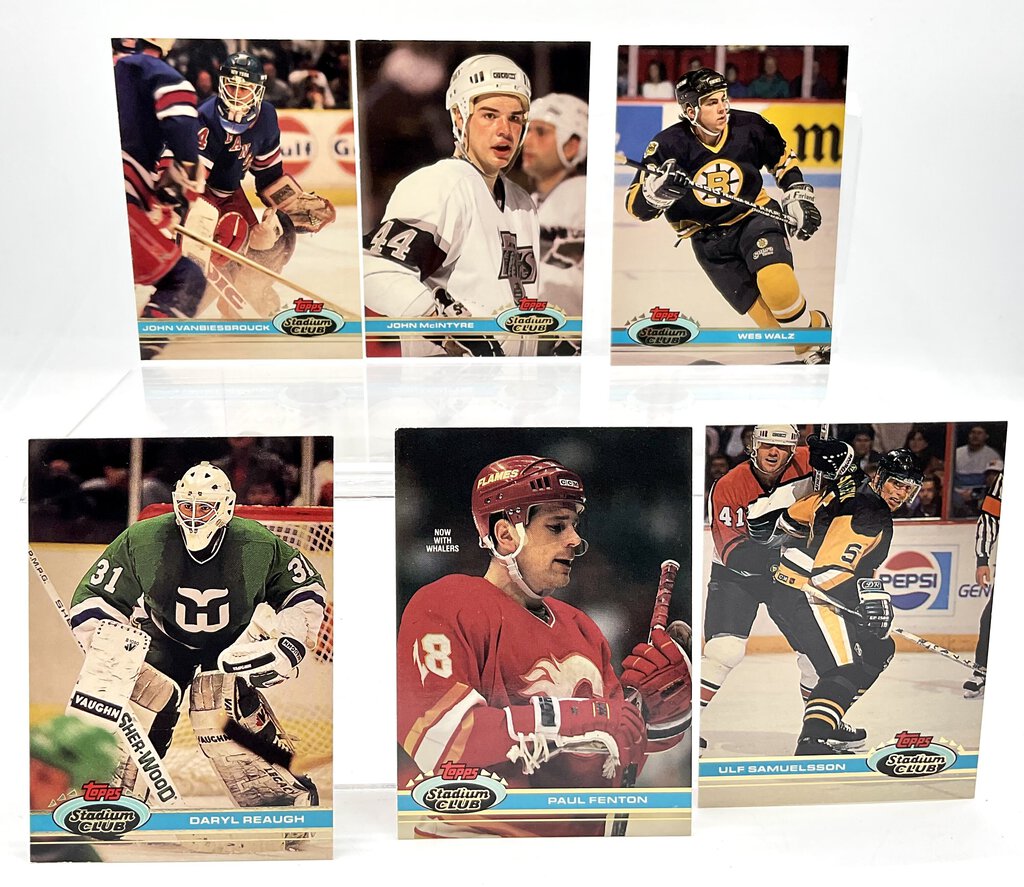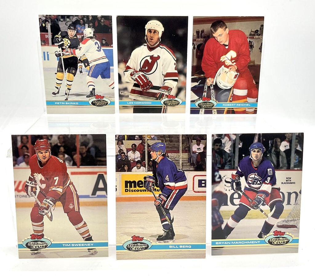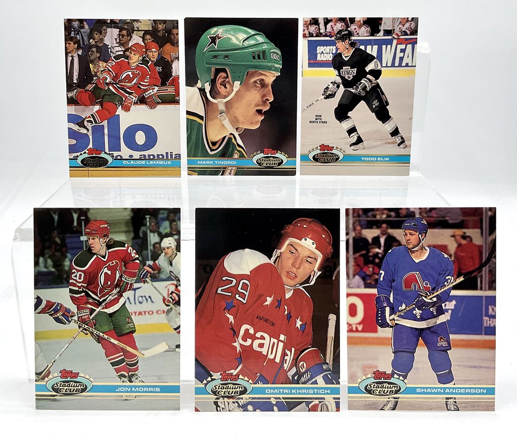 Amazing lot of Topps Stadium Club 1991 hockey trading cards. This set includes 119 cards featuring players from the National Hockey League (NHL). These sports trading cards are a must-have for any ice hockey fan and collector. With a variety of players and positions, this lot is perfect for expanding your card collection. The cards are in very good condition.