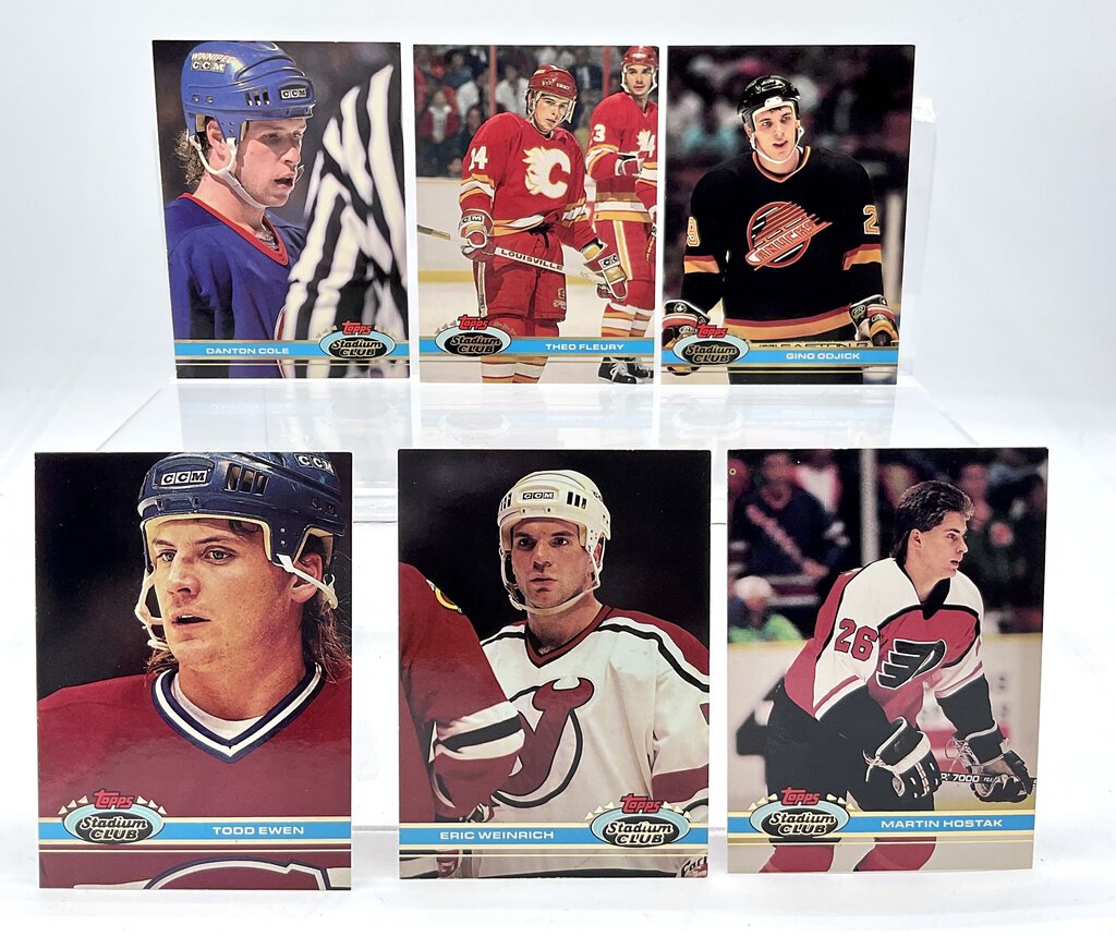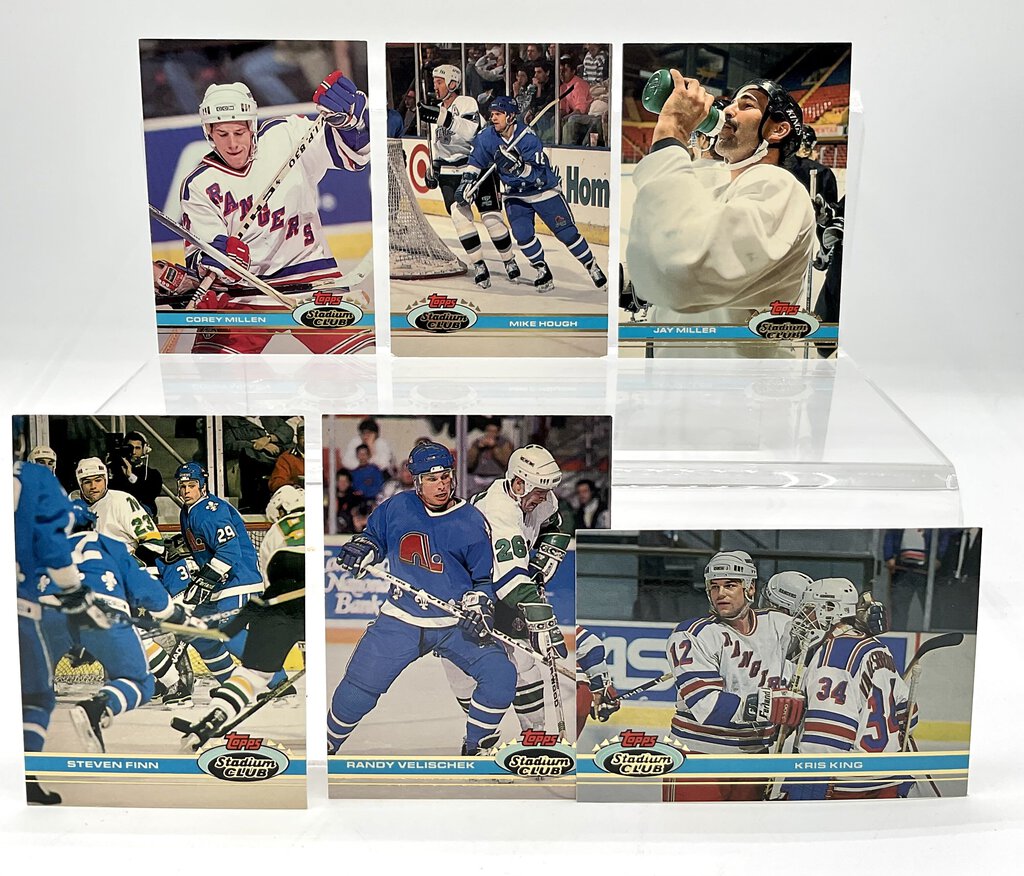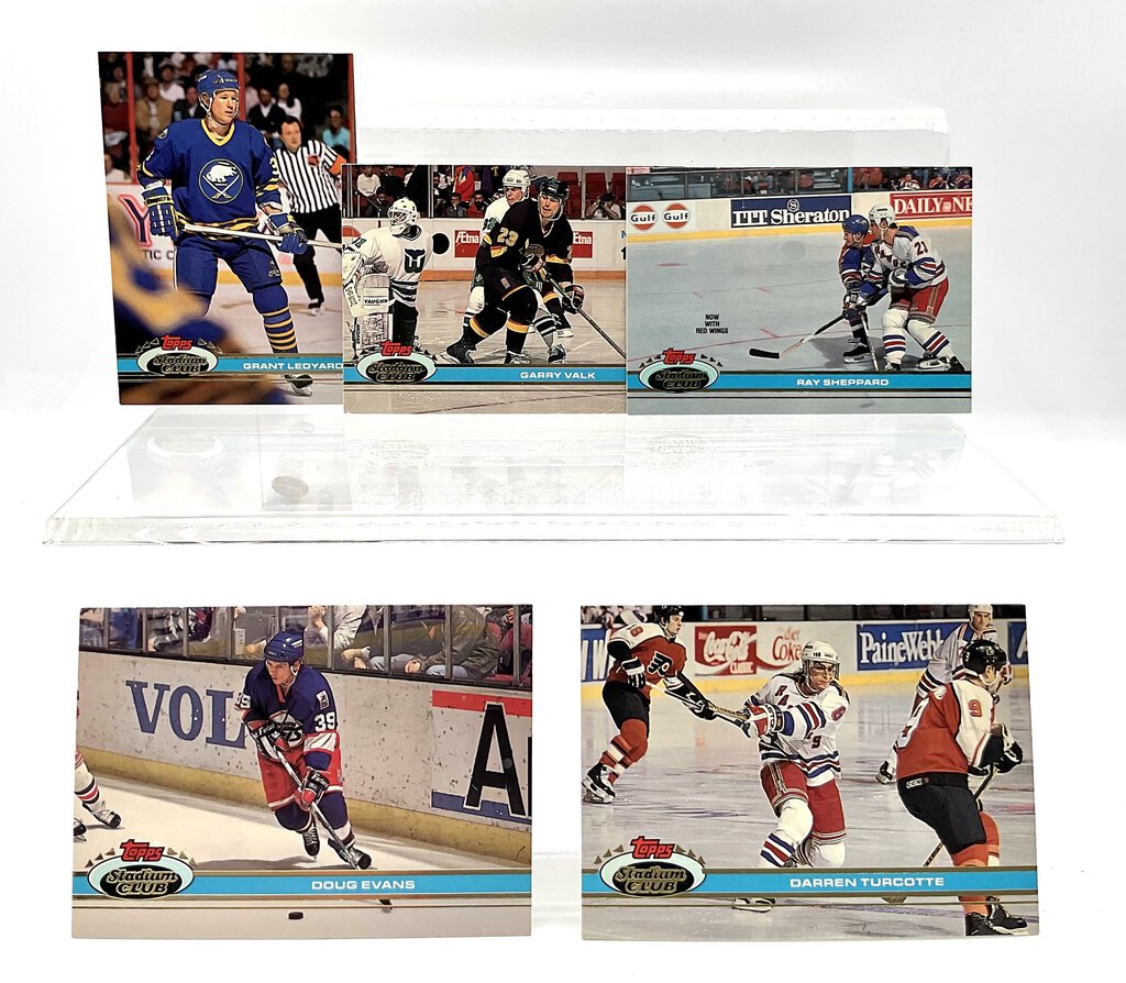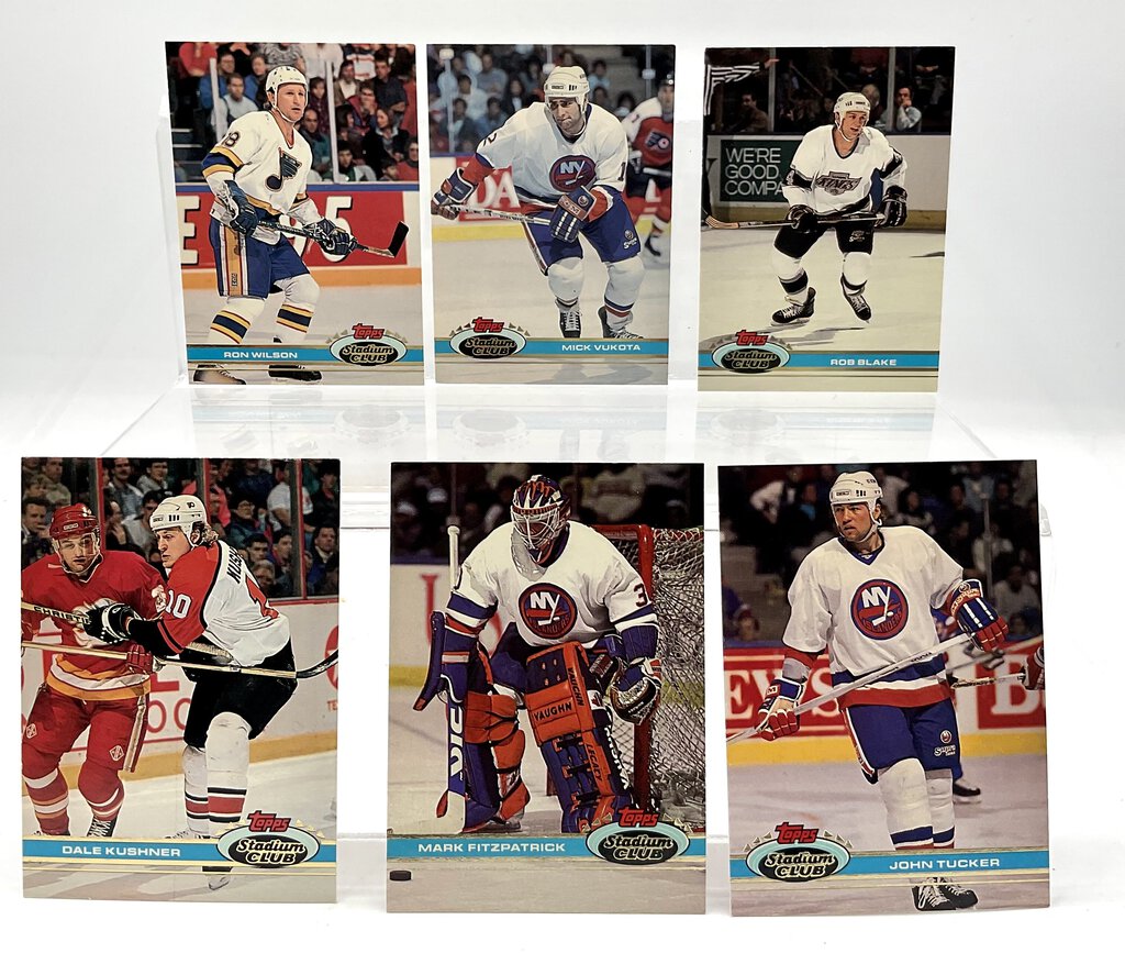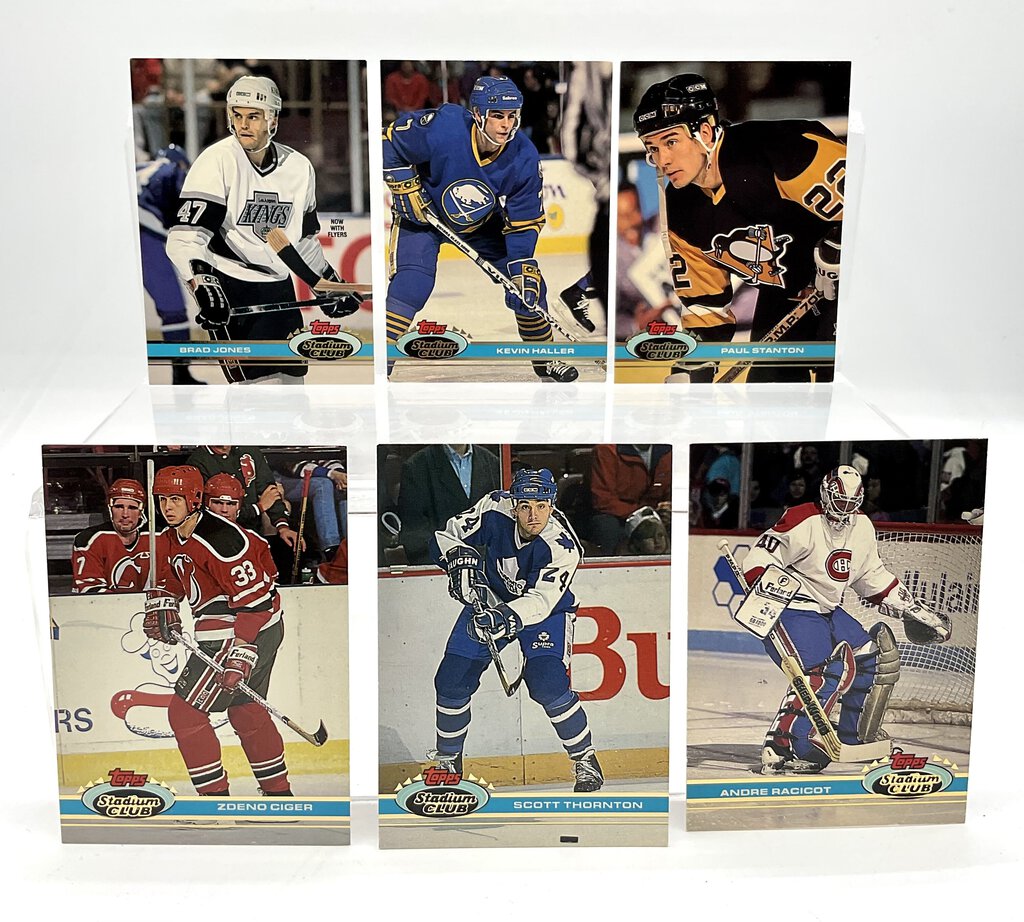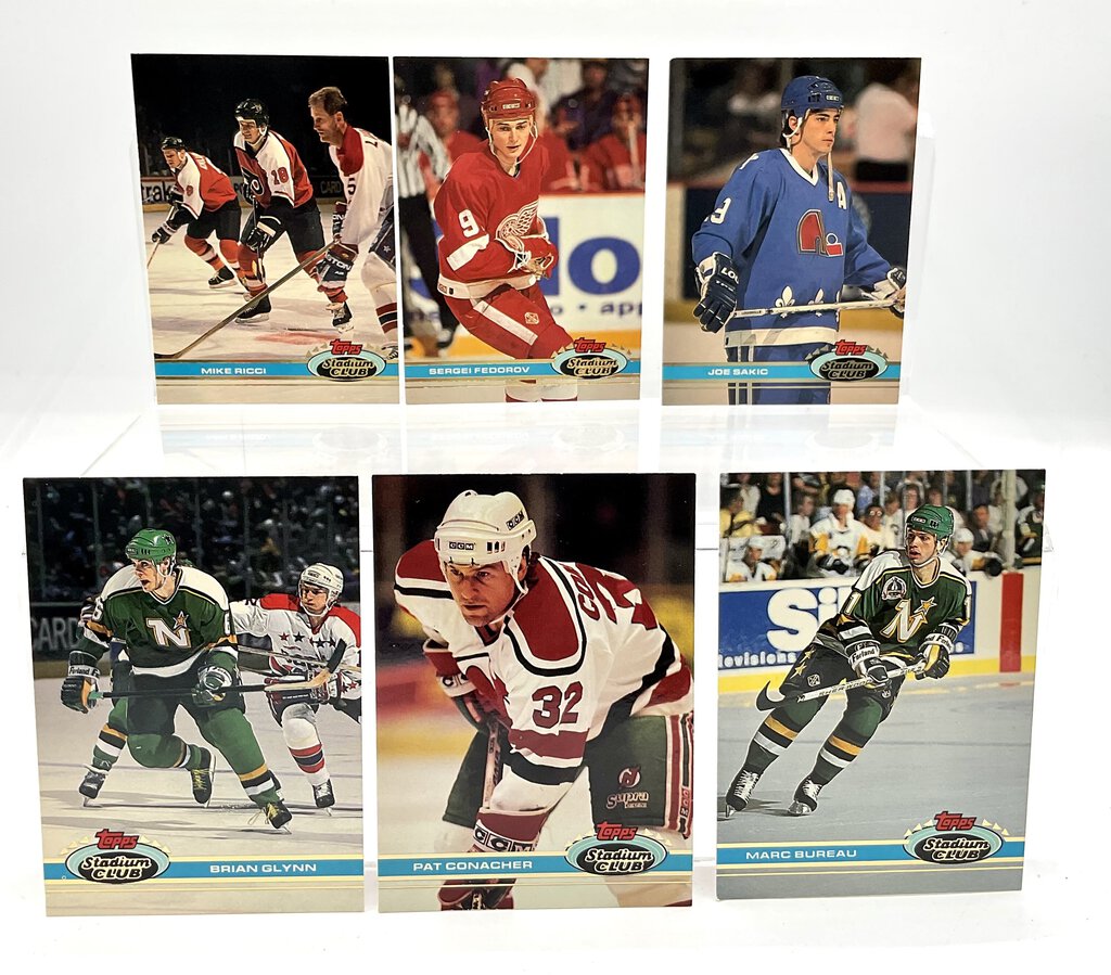 Amazing lot of Topps Stadium Club 1991 hockey trading cards. This set includes 119 cards featuring players from the National Hockey League (NHL). These sports trading cards are a must-have for any ice hockey fan and collector. With a variety of players and positions, this lot is perfect for expanding your card collection. The cards are in very good condition.