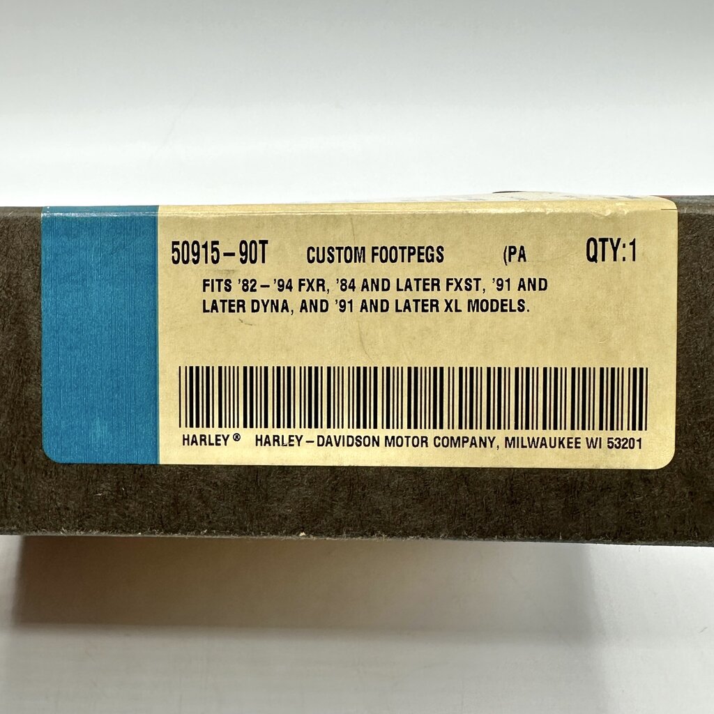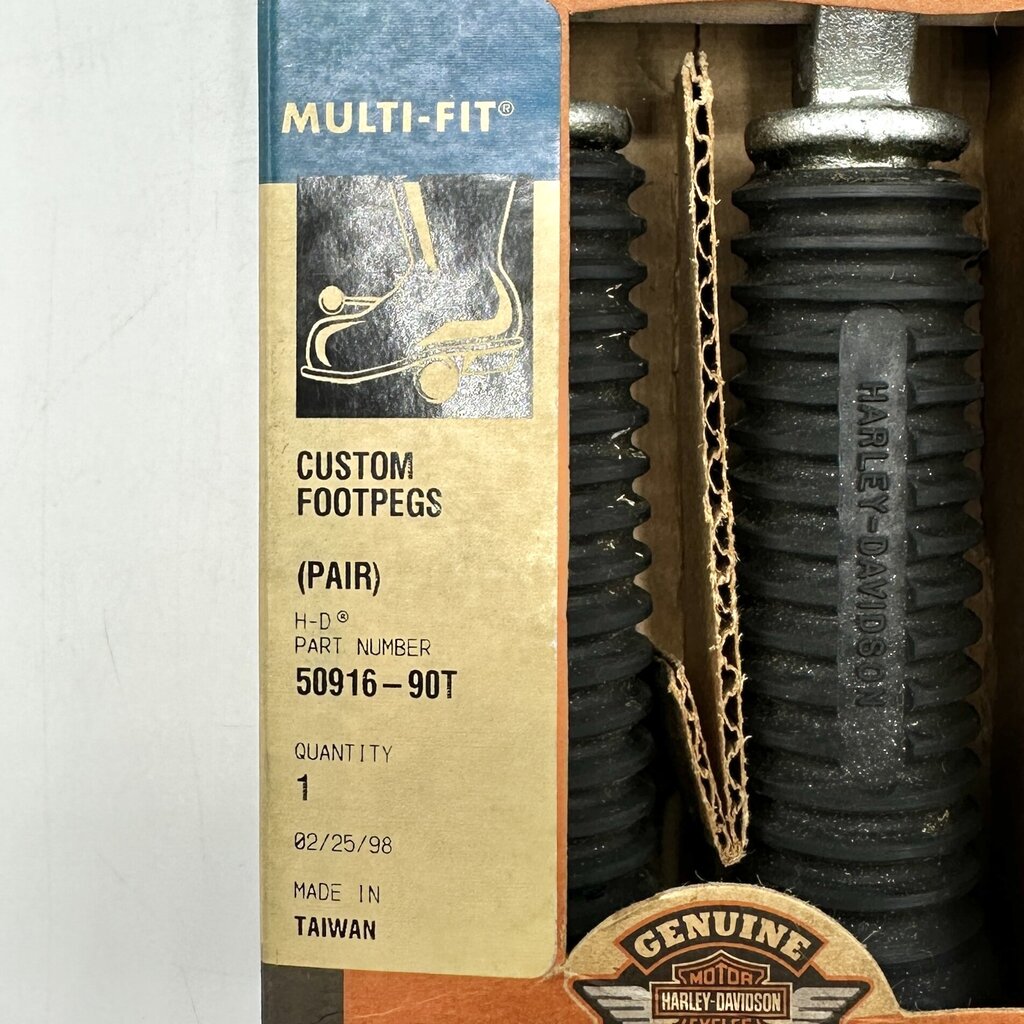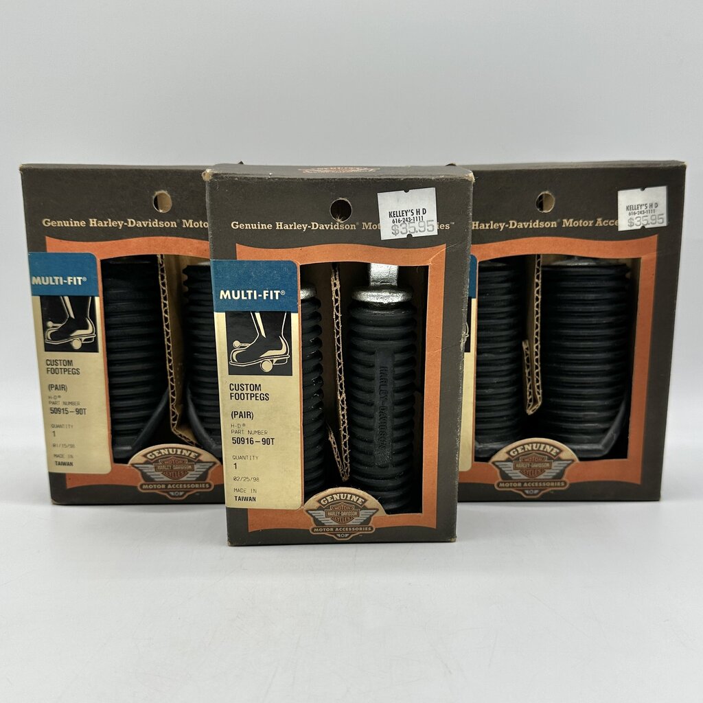 Lot of 3 vintage 1997/98 Genuine Harley Davidson Custom Foot Pegs. We have one pair of 50916 -90T and two pairs of 50915-90T. All come in their original box and appear to be unused. One foot peg shows light loss of the rubber right by the mounting mechanism, they are all a little dirty from storage but are otherwise in very good condition. Please carefully review all photos for condition details and compatibility information.