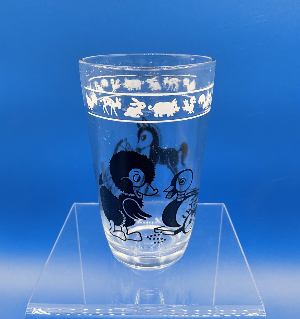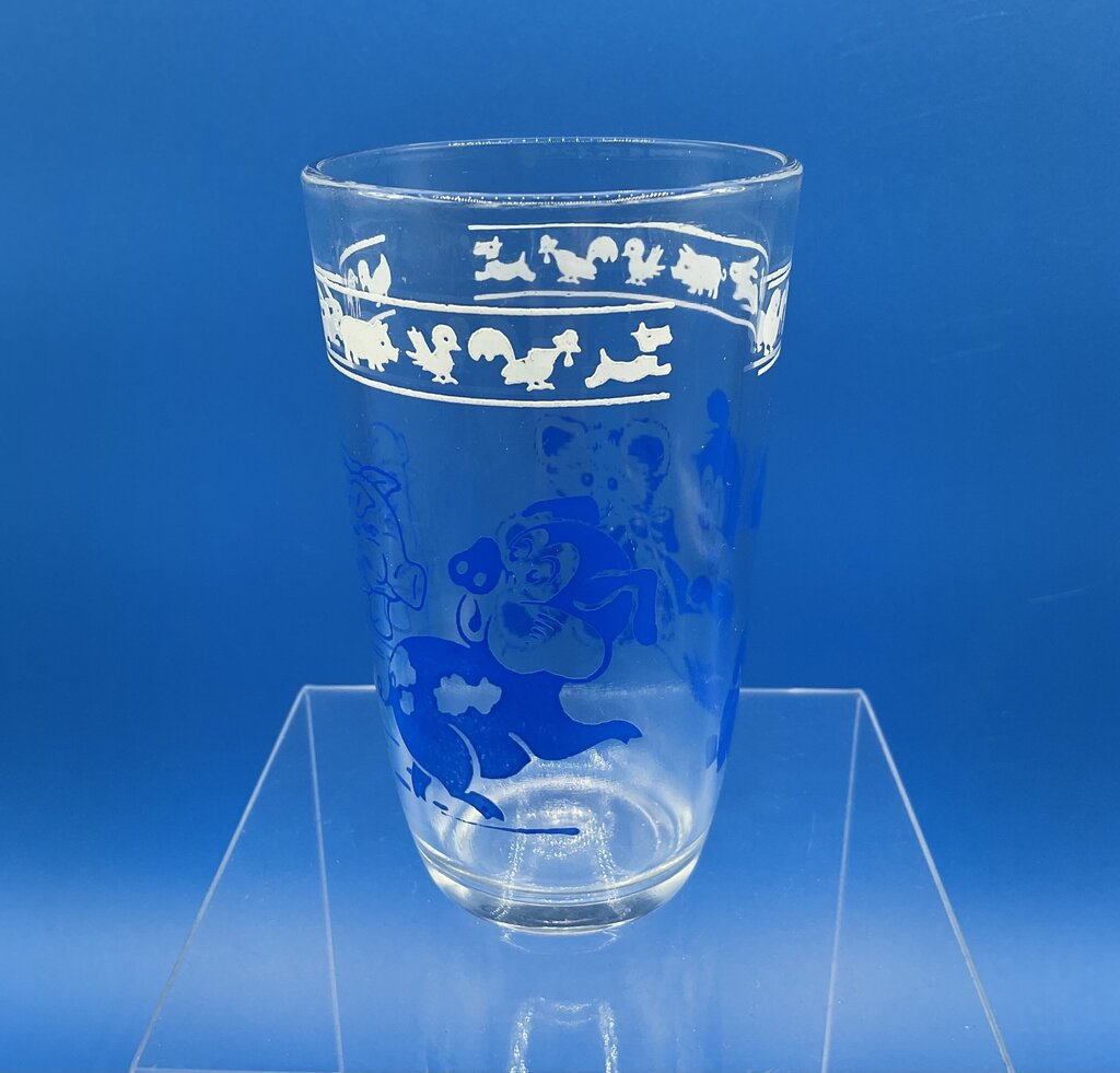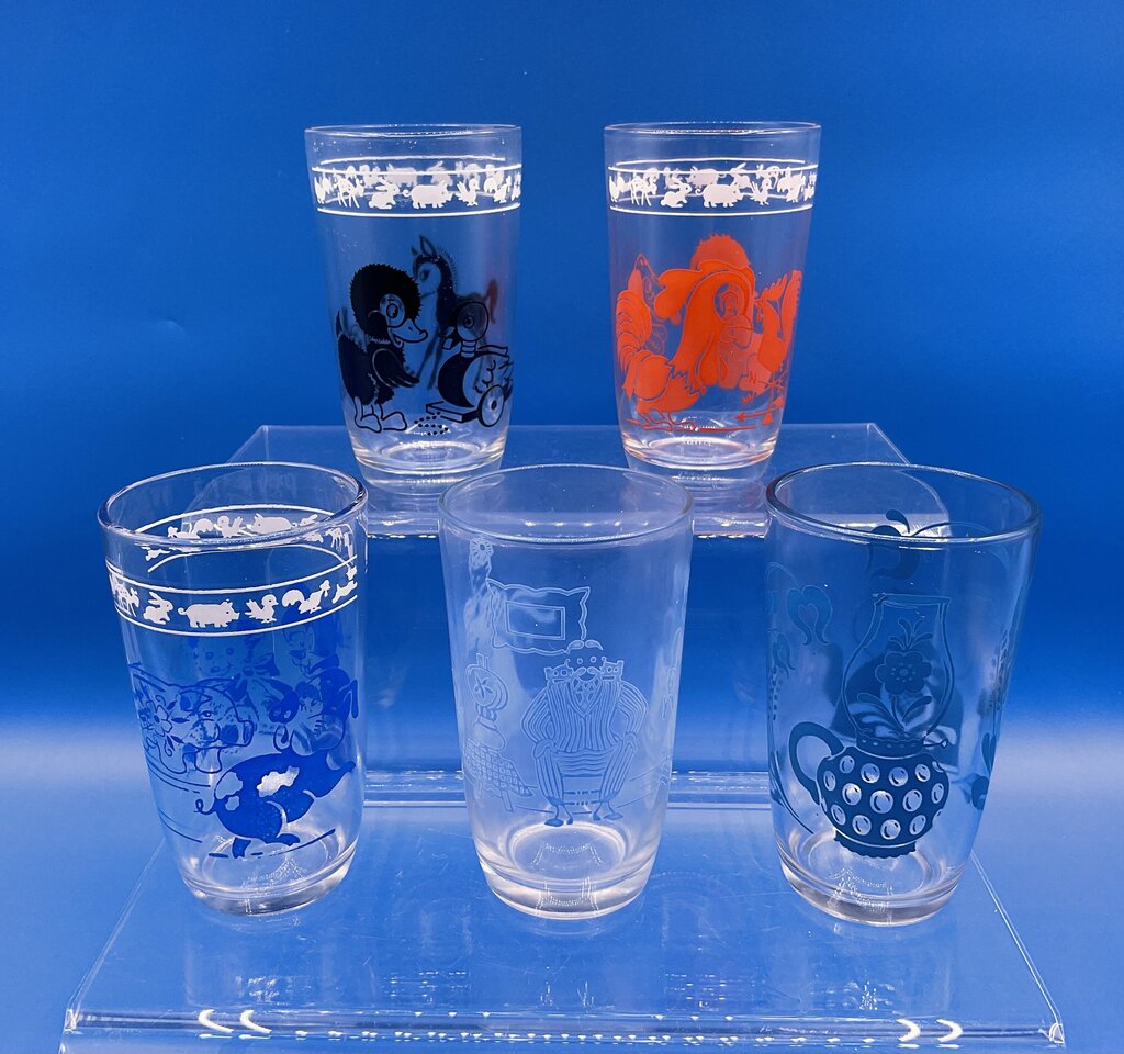 This lot of 5 Swanky Swigs glasses are vintage juice glasses produced by Hazel Atlas Glass for Kraft Foods to package cheese spreads and other products. After being used, they were typically used as juice or water glasses for children and were a popular collectible item. Decorated with various animals, items, and people, these glasses were a fun item to collect and still make a great addition to a glass collection today. All five glasses are in great condition, no damages present. Please refer to all photos for overall conditions. Each glass measures 3 3/4” tall by 2 1/4” across at the rim. All glasses together weigh 1 pounds and 3 ounces. Estate item. Condition is pre owned. Ships USPS Ground Advantage Mail.