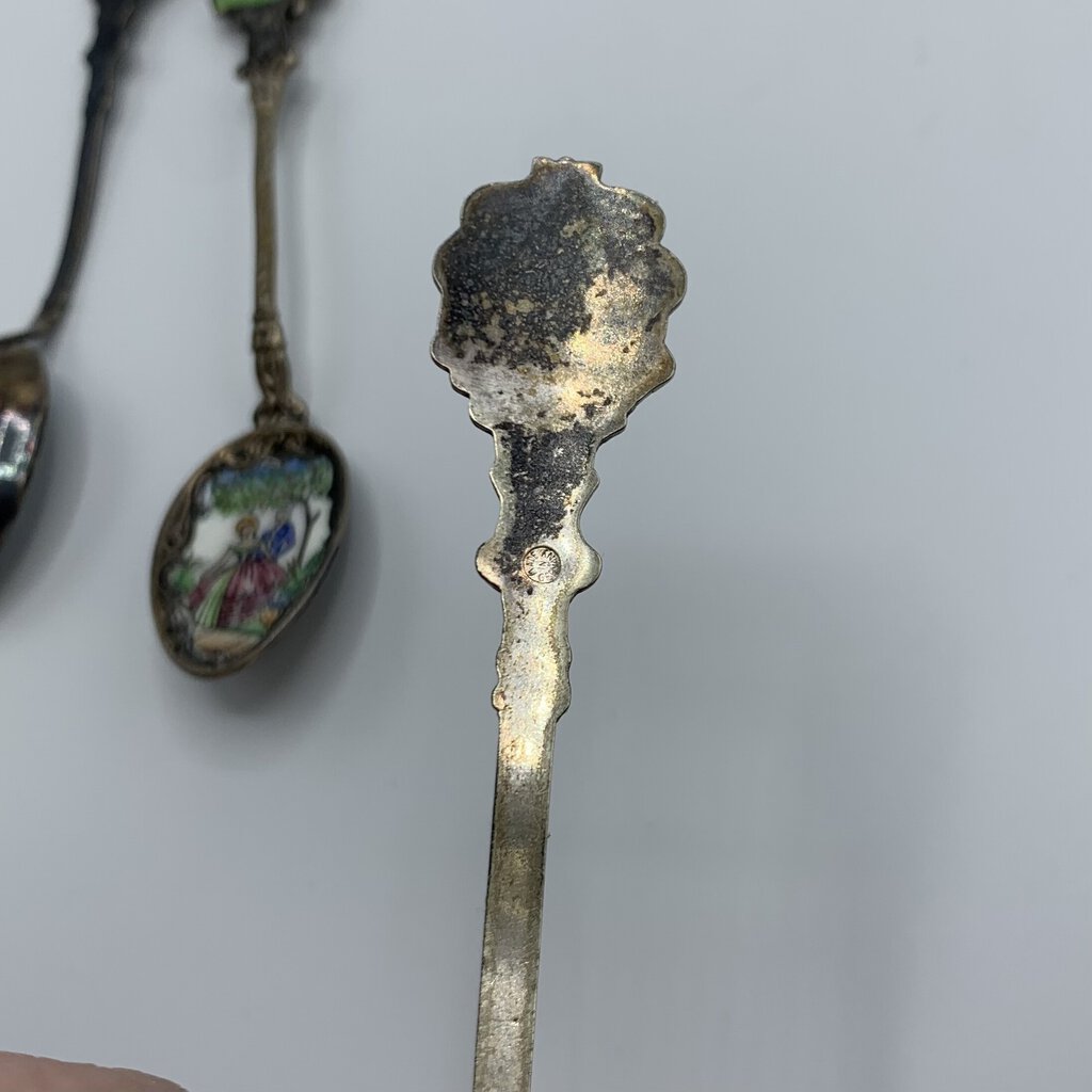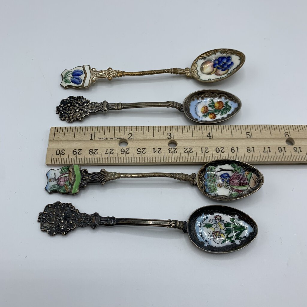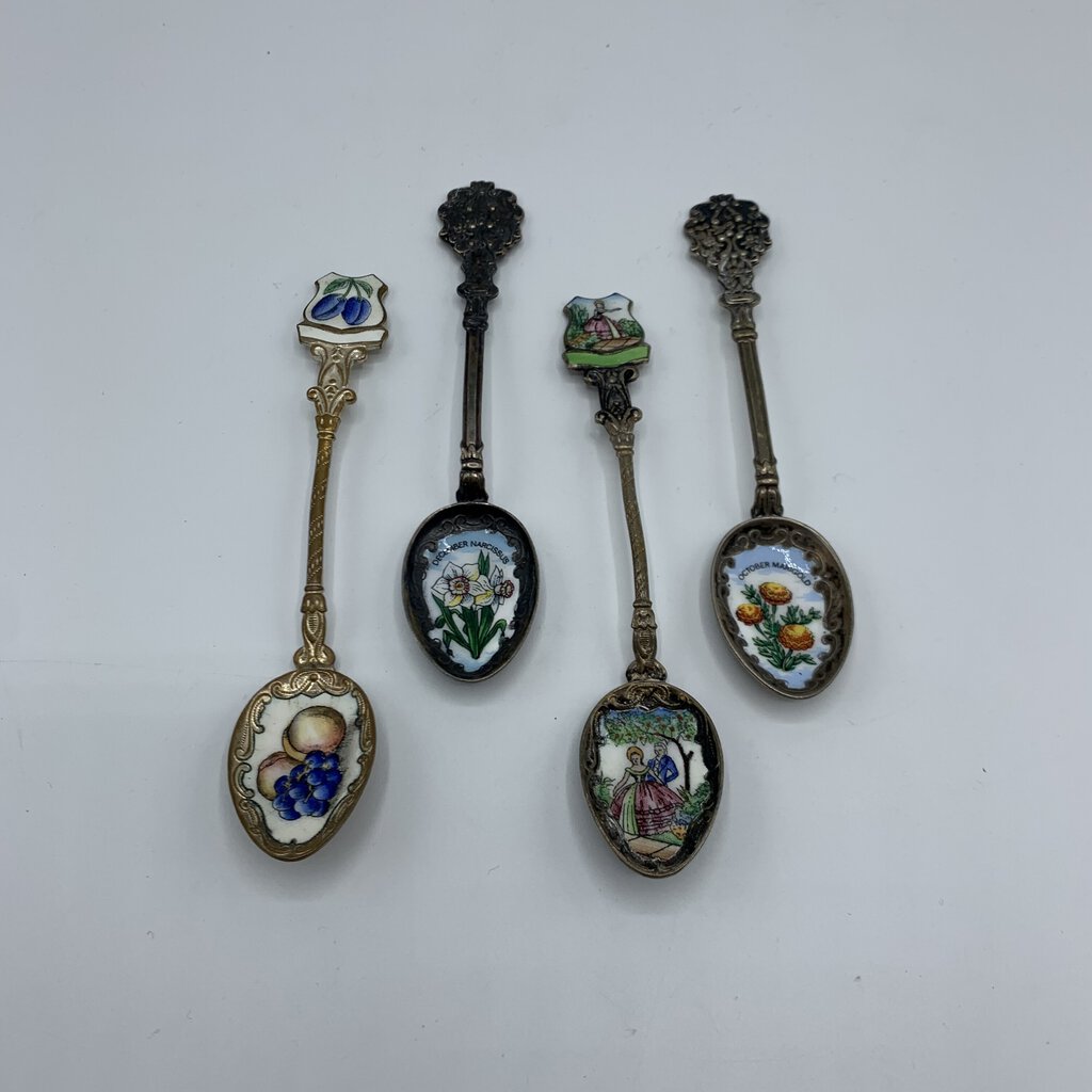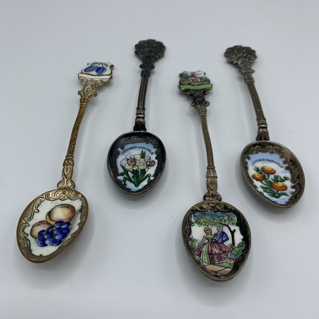 Fun lot of four small antique collectible spoons. The spoons have various art featured from flowers and fruit, to a 17th century couple. The maker is only apparent on one of the spoons. The one with the fruit on it has Klepa Arts Czechoslovakia impressed on the back top of it’s handle. The other three just have the origin location. Two are from Germany, one other is marked Czechoslovakia. I believe the two German made spoons are sterling, but they aren’t marked as such.
