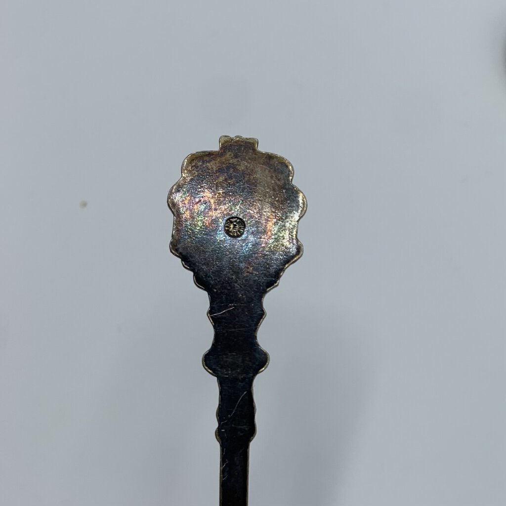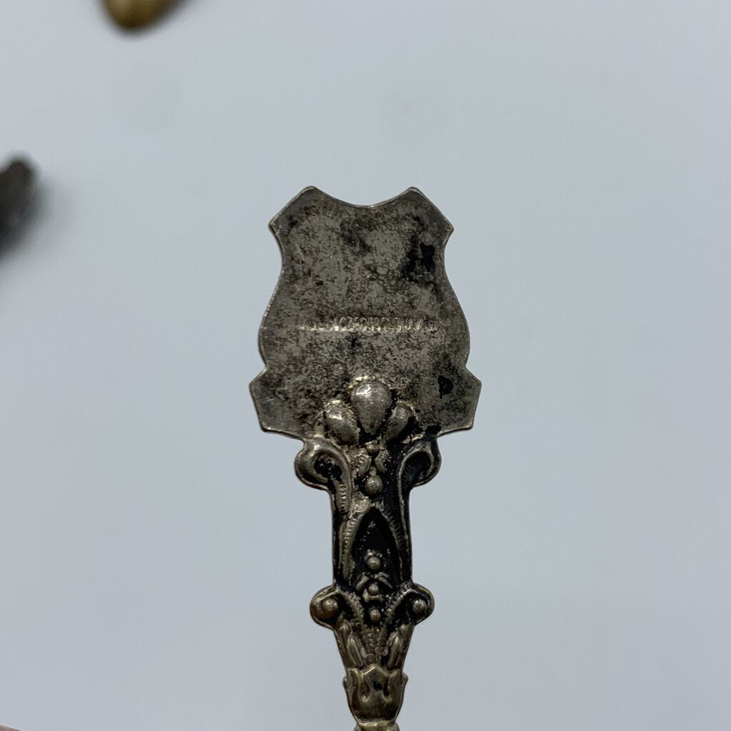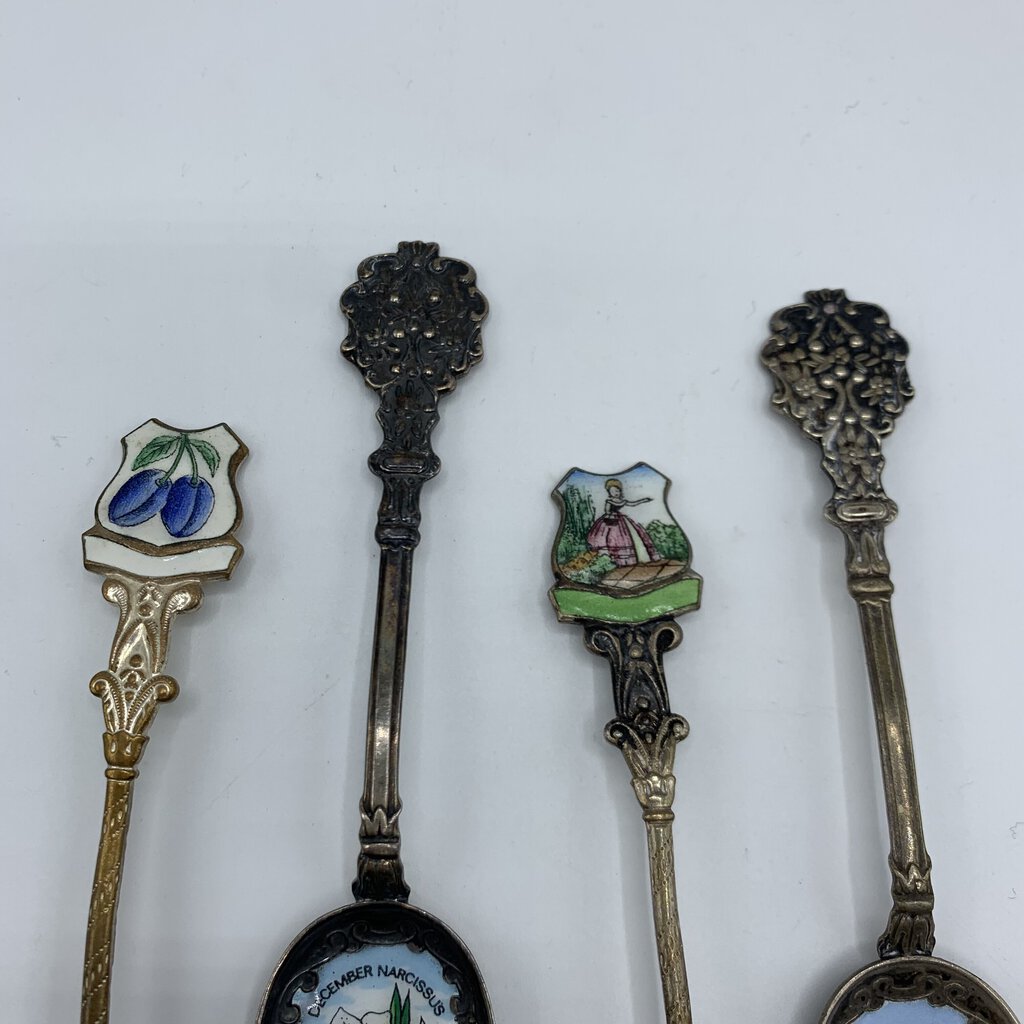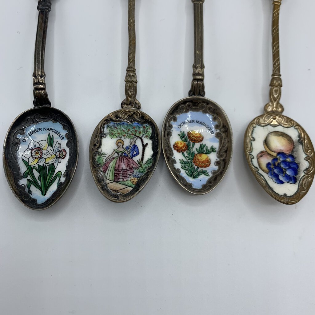 Fun lot of four small antique collectible spoons. The spoons have various art featured from flowers and fruit, to a 17th century couple. The maker is only apparent on one of the spoons. The one with the fruit on it has Klepa Arts Czechoslovakia impressed on the back top of it’s handle. The other three just have the origin location. Two are from Germany, one other is marked Czechoslovakia. I believe the two German made spoons are sterling, but they aren’t marked as such.