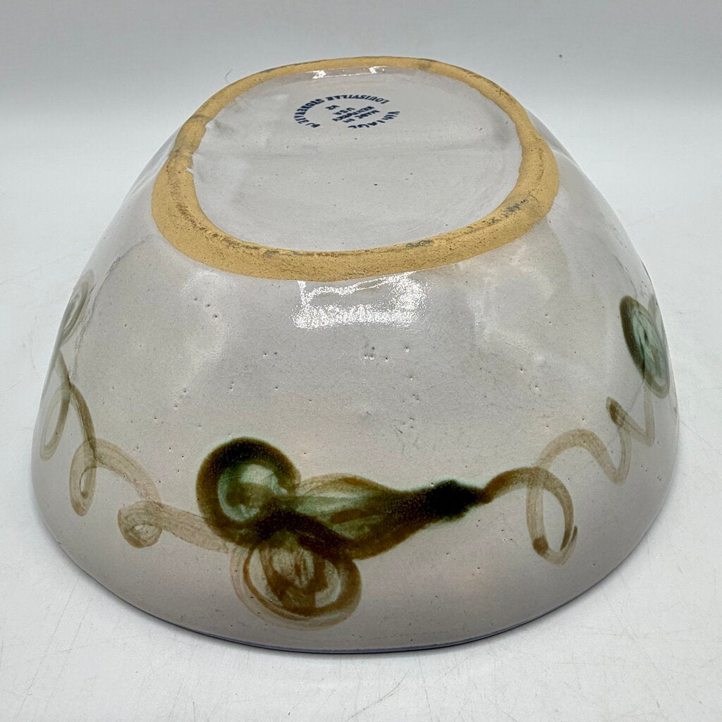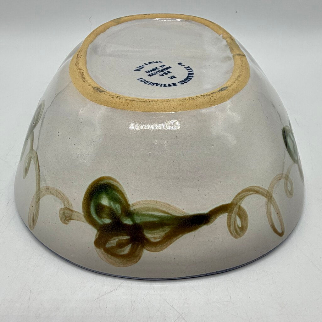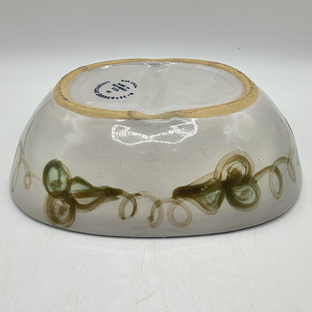 Louisville Stoneware Vintage Blue Grapes Divided Dish Made in Kentucky, USA. This beautiful hand painted dish with its blue grapes, green vines, and blue band, is 9 3/8” wide, 7 3/8” deep and 2 1/2” tall. It is in very good pre owned condition without chips, or cracks, there is light utensil wear.