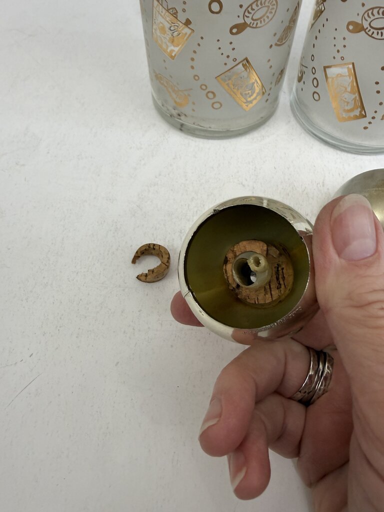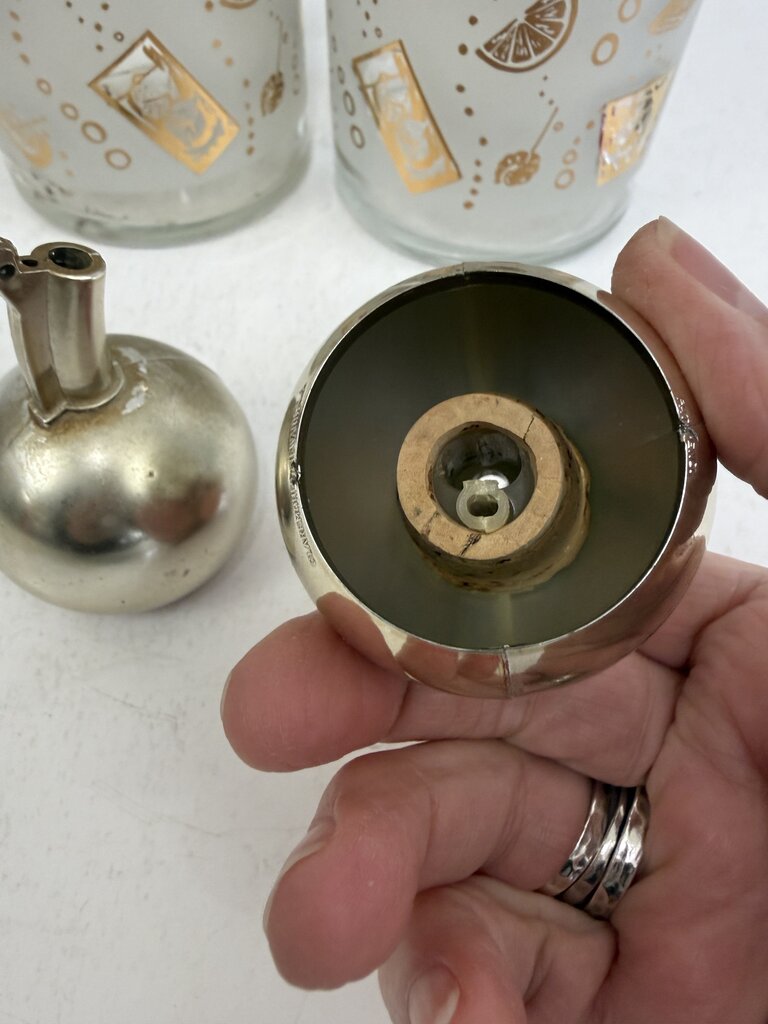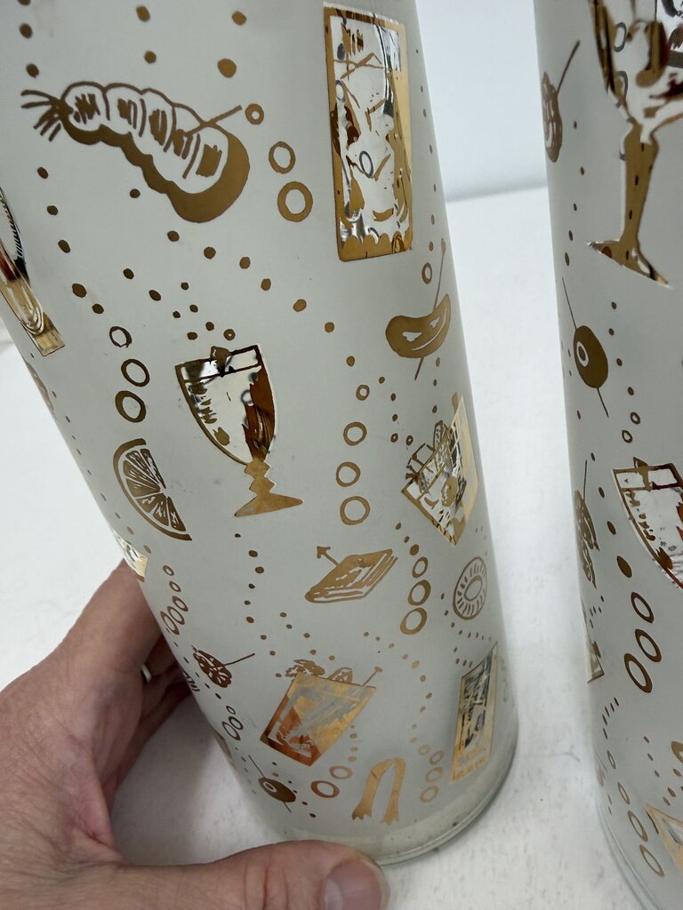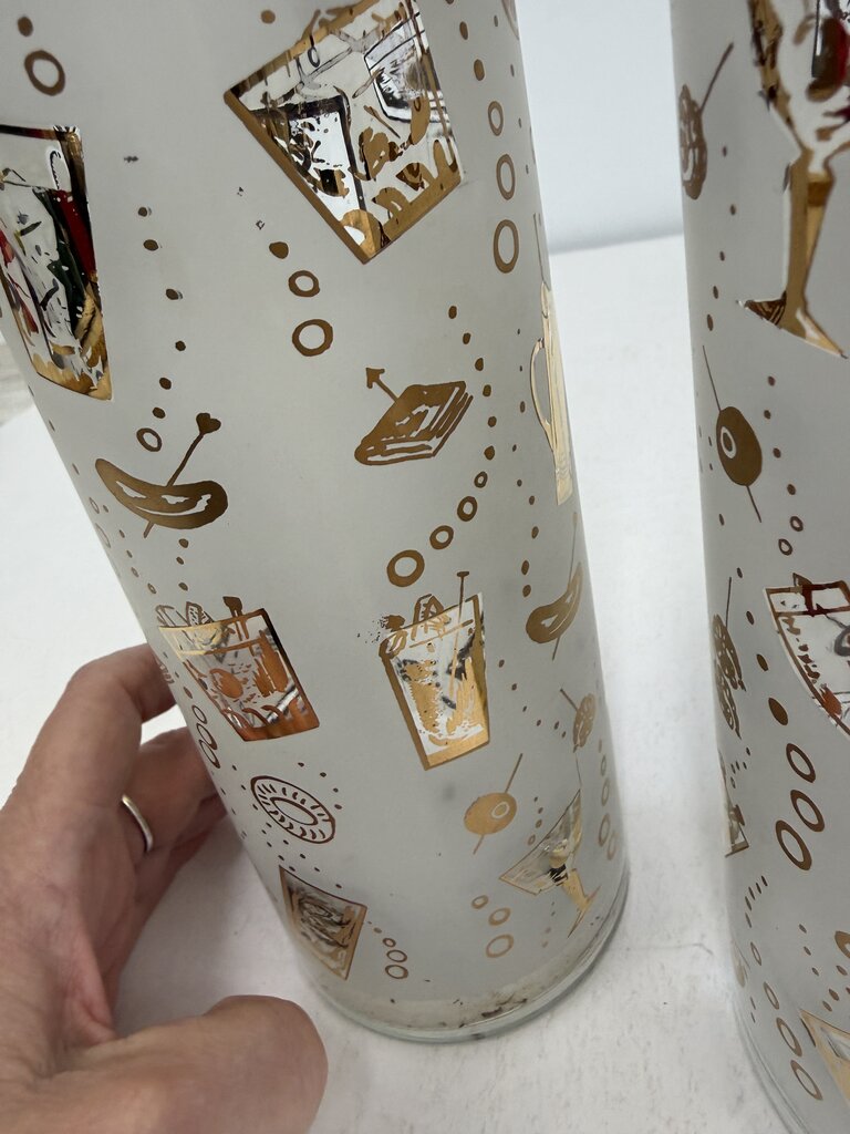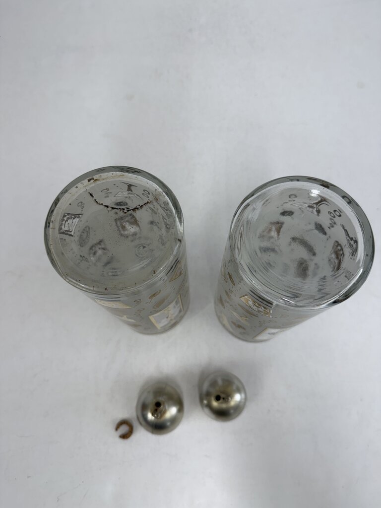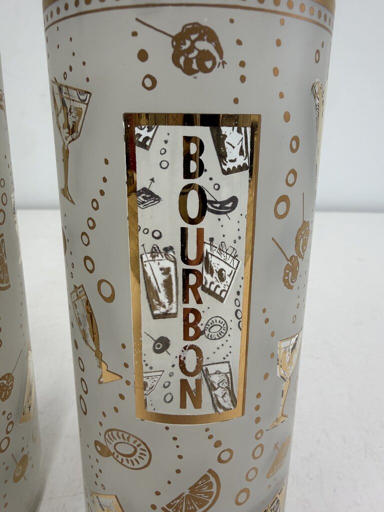 Super groovy set of MCM Barware glass decanters for Bourbon and Scotch with stoppers/pourers. Clear glass decanters with frosted panels and gold accents. Bottles measures 9.5” and 3” in diameter. The stoppers are SilverTone, cork lined, one of the corks has broken away. Would make a great display for any bar!