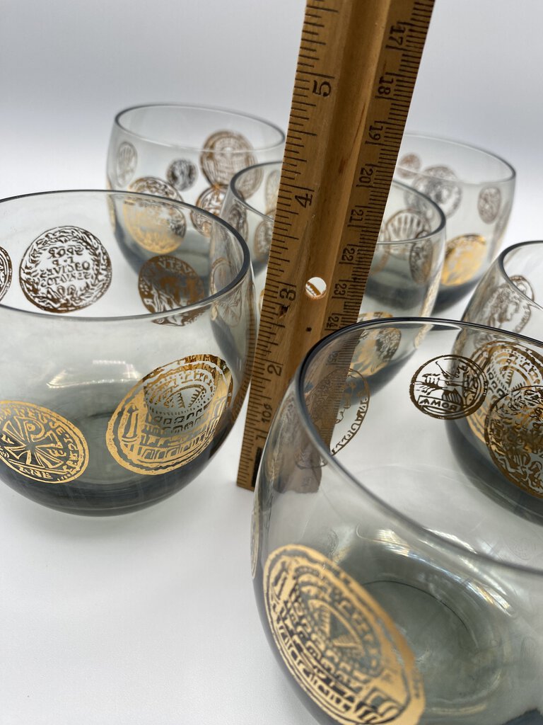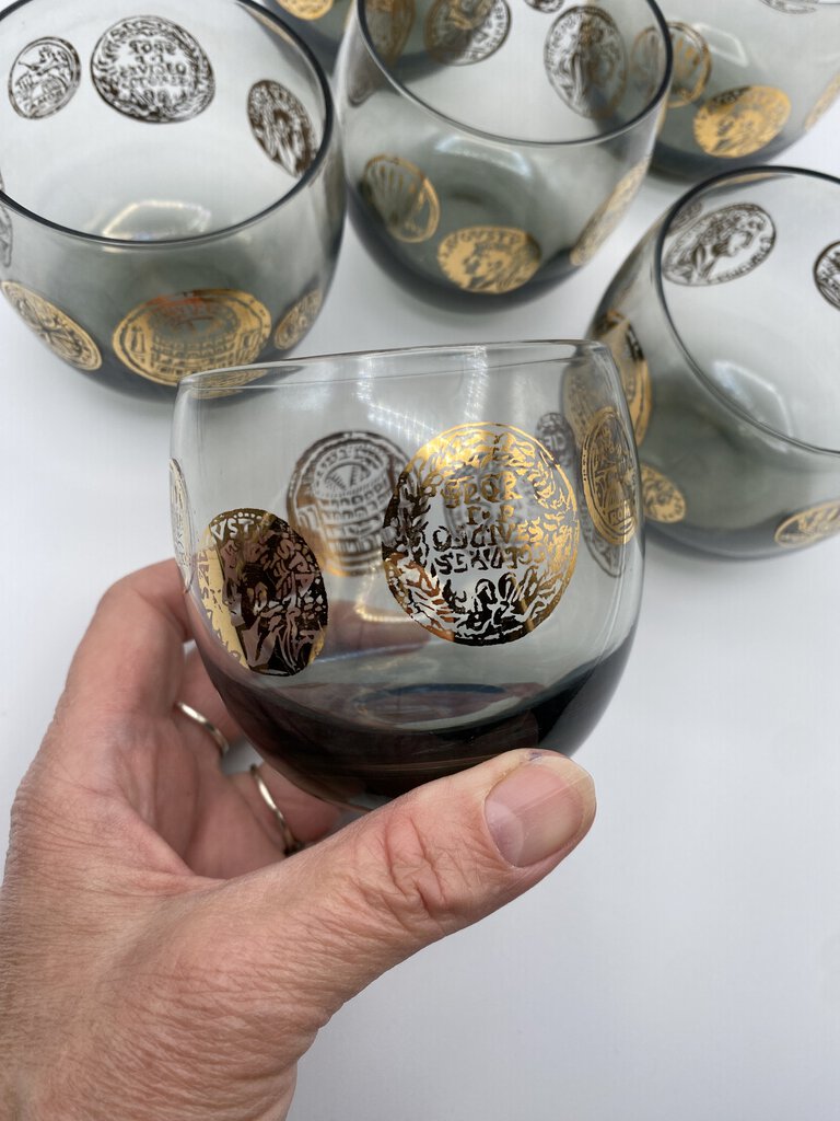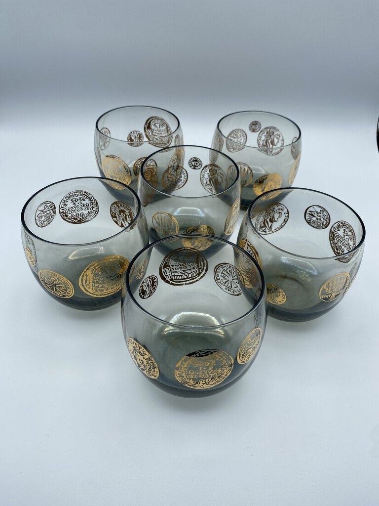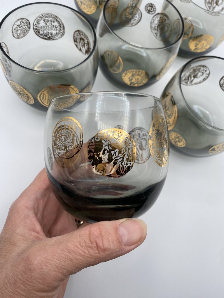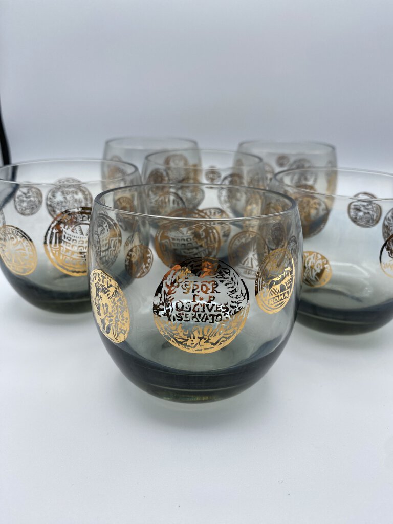 Vintage set of Federal Glass Roly Poly Glasses in the Roma Coin pattern set of 6. Smokey colored glass decorated with gold Roman coins measures approximately 3.25” tall by 3.25 in diameter. Nice weight glass, feels good in your hand. Perfect for cocktails, bourbon sipping and more. Eight ounce capacity. No damage found,