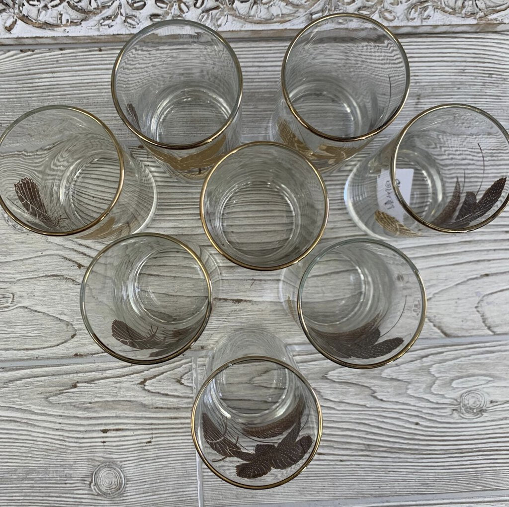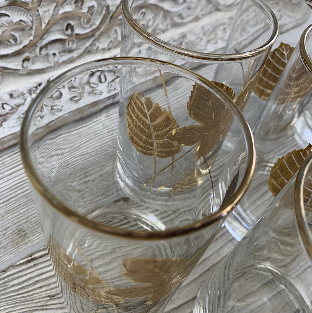 MCM Libbey Gold Leaf Highball Glasses/Tumblers Set of 8. Swanky, collectible set of 8 highball glasses made by the famous Libbey Glassware Company between the 1950s-1960s. MCM bar set-up perfection! The glasses were estate-owned and are in good vintage condition. The gold accents on the rims have faded in a few spots, but the glasses have no chips or cracks. The glasses measure 5 inches in height and 2 1/2 inches in diameter. Please carefully review the photos for details.
