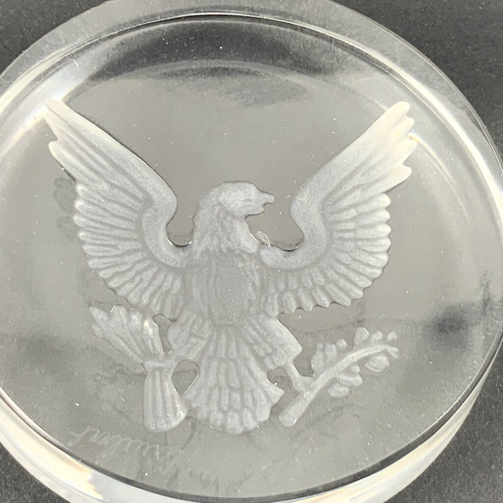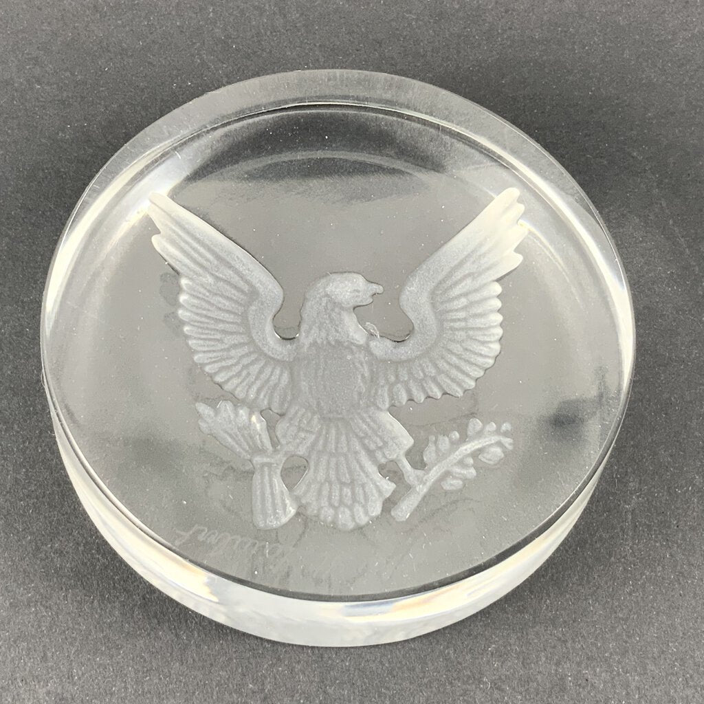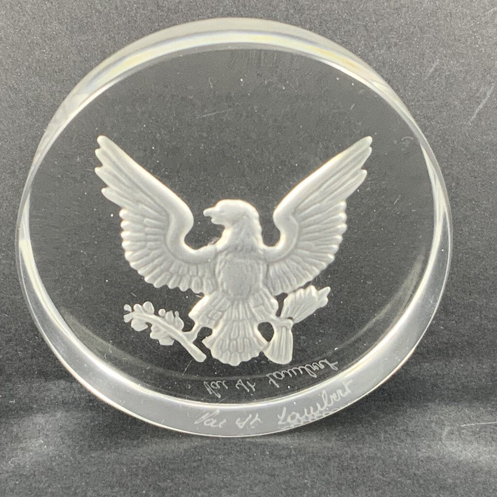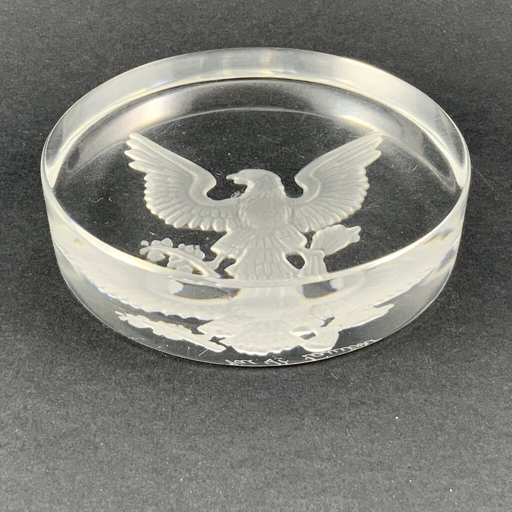 MCM Val St. Lambert Intaglio Cut Round Glass Eagle Paperweight.