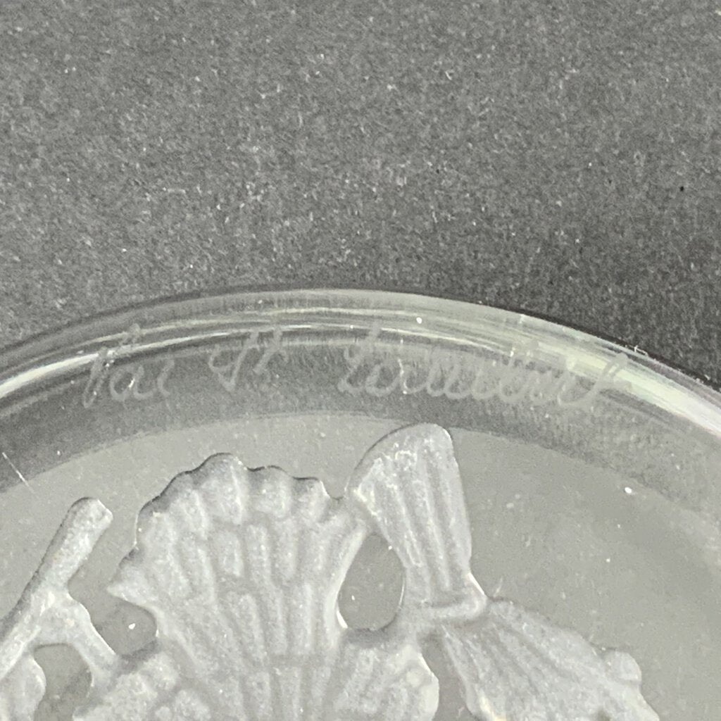 3 1/2 inches diameter, 3/4 inch high and weights 12 oz. Does not have its original sticker but is signed. Made by Cristallerie du Val St. Lambert in Seraing, Belgium.