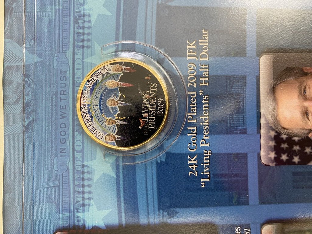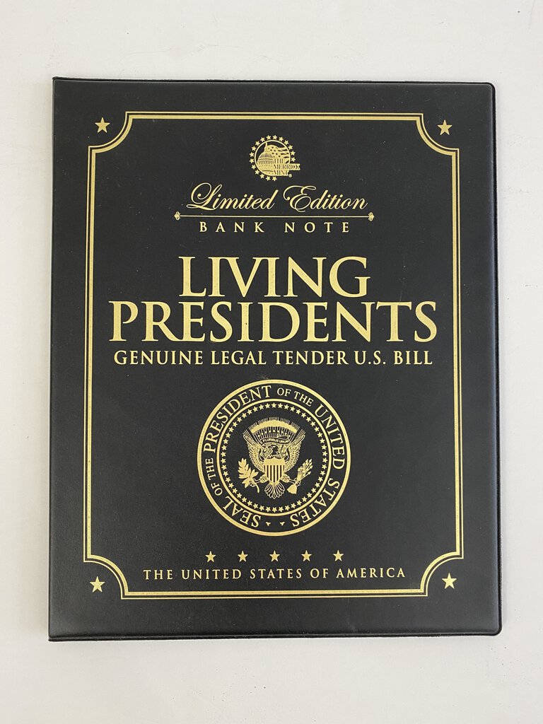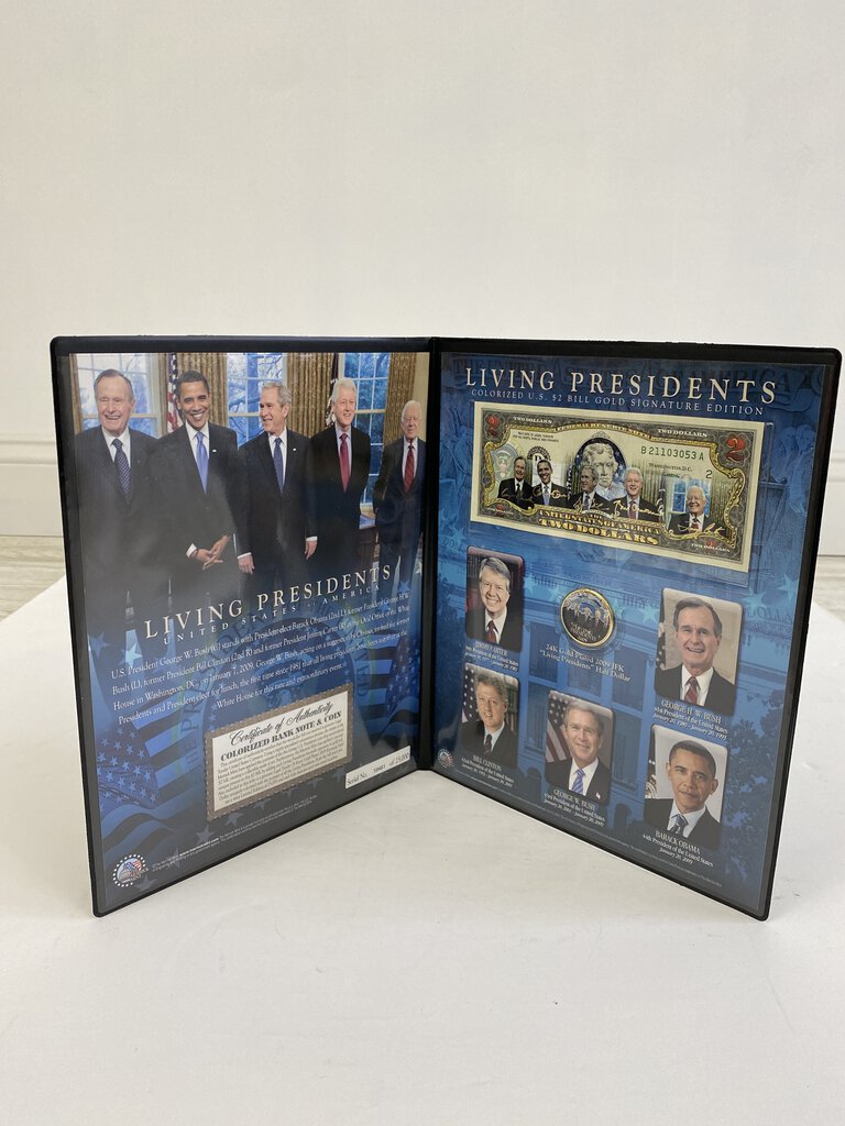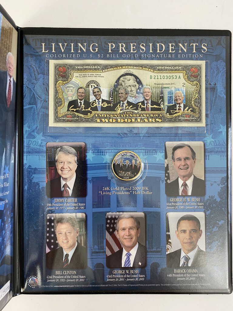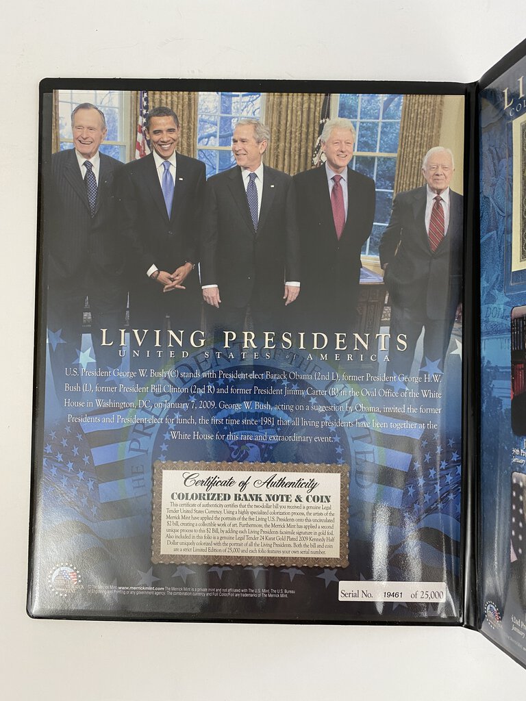 The Merrick Mint Limited Edition Bank Note in a Collectable Folio. The Living Presidents of 2009 includes, Jimmy Carter George H.W. Bush, Bill Clinton,George W. Bush and Barack Obama. The folio has a spot for the gold signed and colorized $2 dollar bill and 24 karat gold plated 2009 “JFK” Half Dollar. Excellent condition on the folio and money. Serial No. 19461 of 25,000.