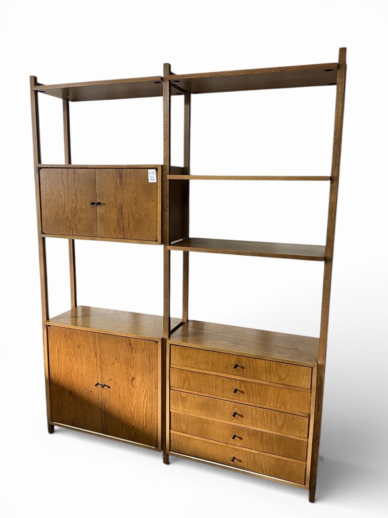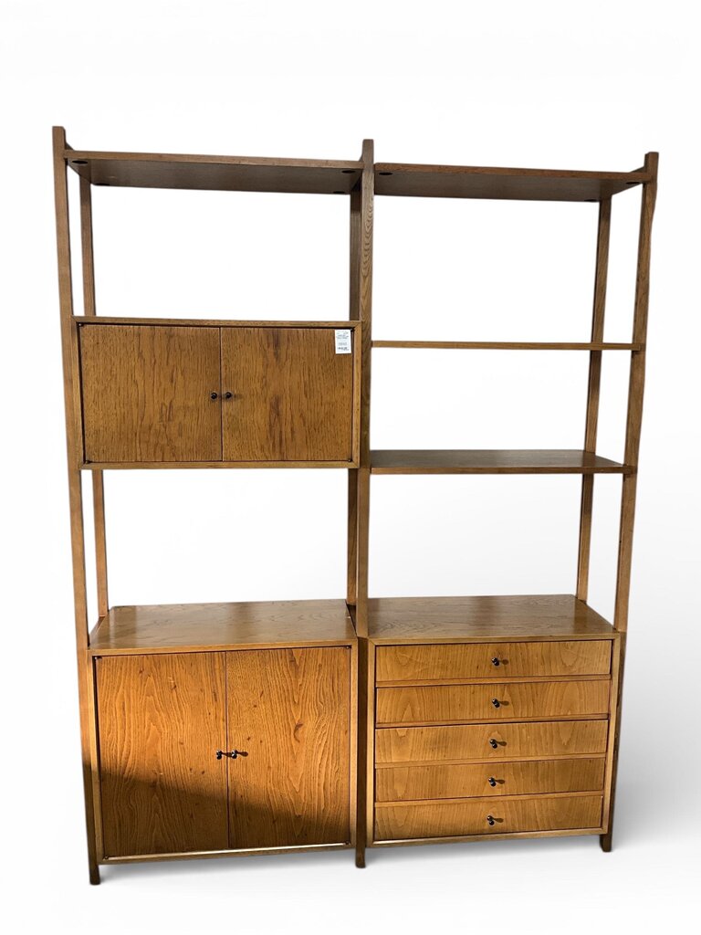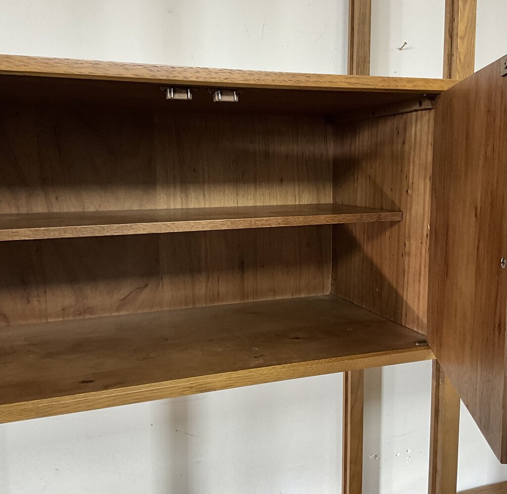This modular is in very good condition and has no damage! Quite the rare find and is the modular design of the Mid-Century. The cabinets, and shelves are all adjustable as well, so you can re-arrange the segments as necessary.