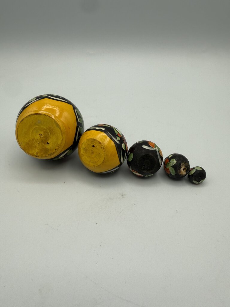 Miniature set of 5 Russian style wood nesting dolls handpainted in rich colors. The tallest doll measures approximately 2” tall down to the tiniest 5th doll measuring a mere 1/4” tall. No damage found, charming set.