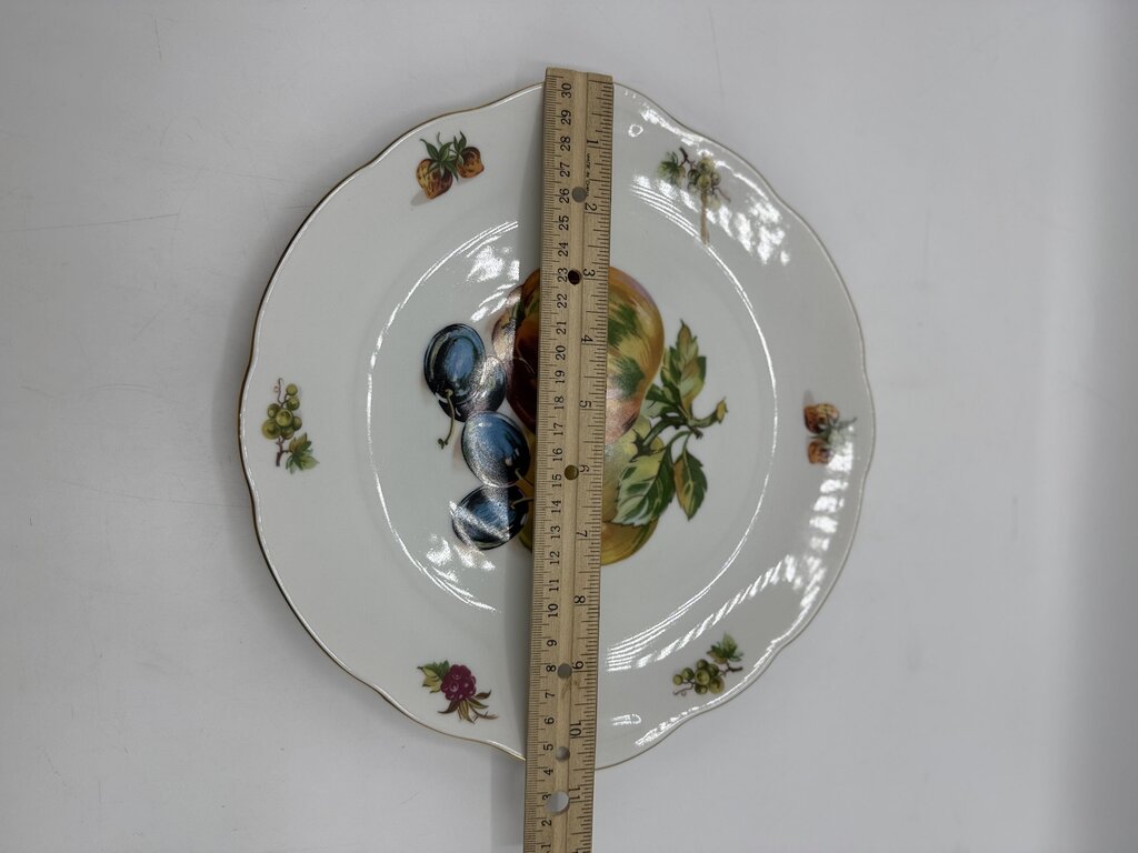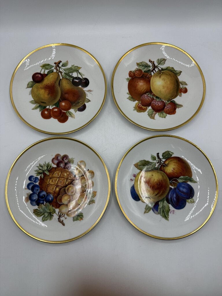 Mitterteich Bavaria Fruit pattern set of 4 dessert plates, measuring 7.5” in diameter and one serving plate, 12” in diameter. Colorful set with a variety of fruits displayed on each plate. No chips, cracks or stains, gold trim still strong.