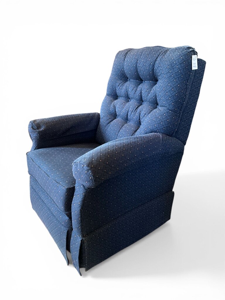 This chair is in great condition and has no rips or stains in the fabric. Reclines with ease and is quite comfy as well! Has a nice dark blue fabric so it goes well with any home!