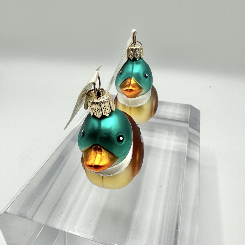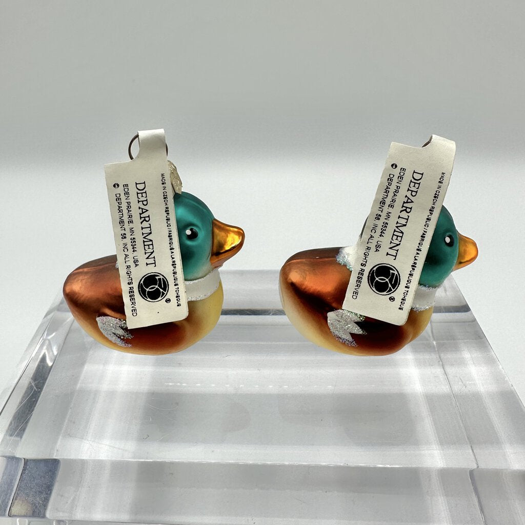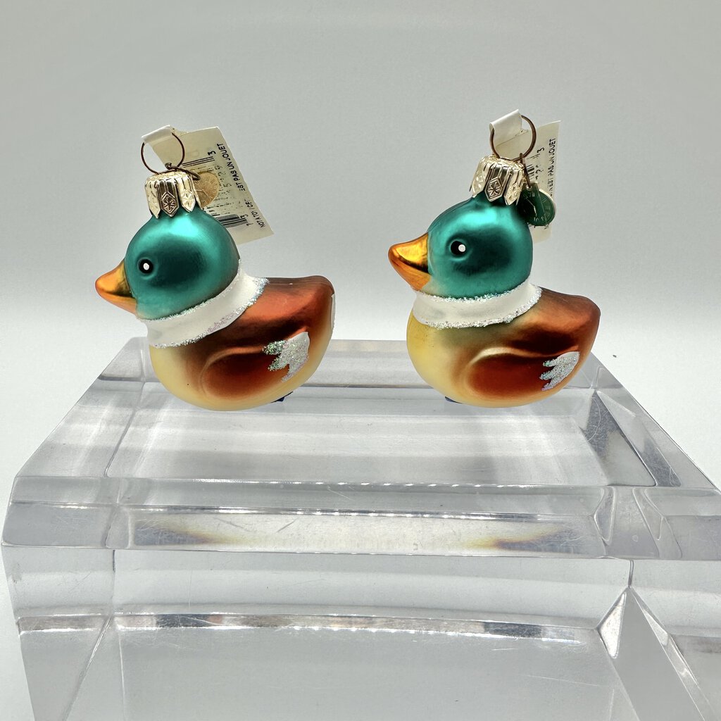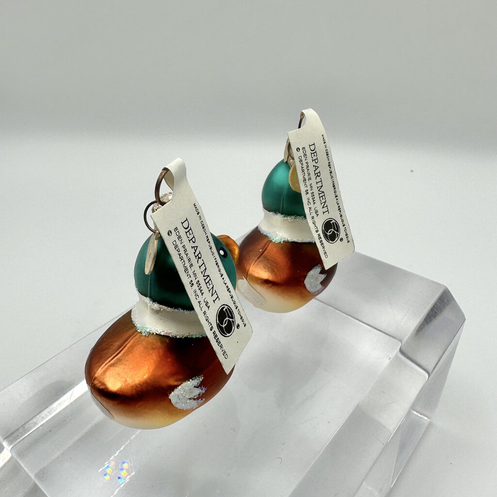 2 Department 56 Mallard Duck Blown Glass Ornaments and 1 Midwest Of Cannon Falls Santa Ornament. The adorable ducks still have their original tags. They are 2 1/4in high and 2in long. They are in very good pre owned condition. The friendly Santa is holding a star, he is 1 5/8in tall and also in very good condition. Please see photos for details.